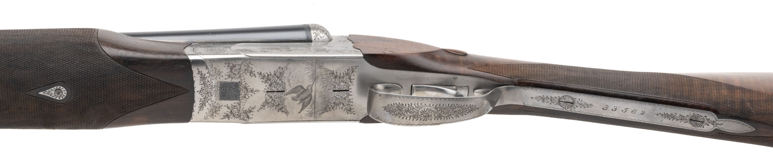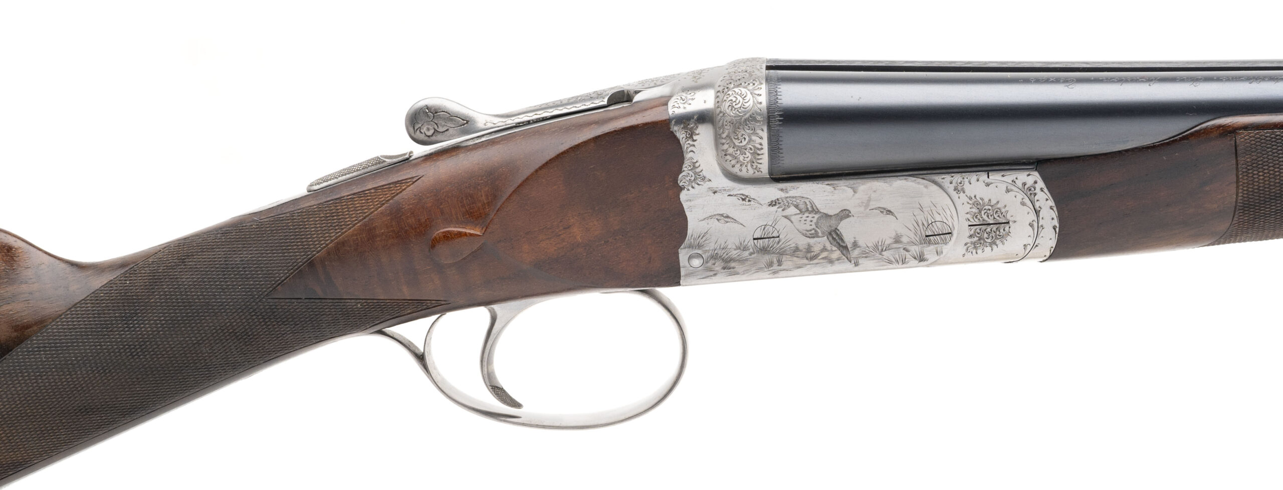 SN: 33582 made in Italy. 20 gauge side by side shotgun with 25.5” barrels with 3” chambers and fixed chokes measuring .011/.019 (L.MOD/I.MOD). Scalloped box lock with ejectors, single non-selective trigger and manual safety. 14 ¾” LOP to a checkered wood butt with a drop of 1 3/8 to 2 ½. Blued barrels engraved “Libero-Ferraglio-Ferlib-Italy” with a coin finish action engraved with game scenes by Bregoli Inc. and a nicely figured checkered walnut straight stock with semi-beavertail forearm. Overall in near excellent condition with very little wear. Comes with original leather bound luggage case.