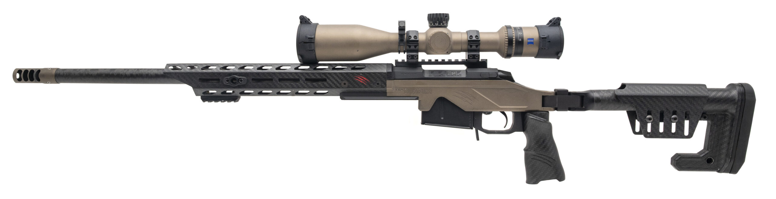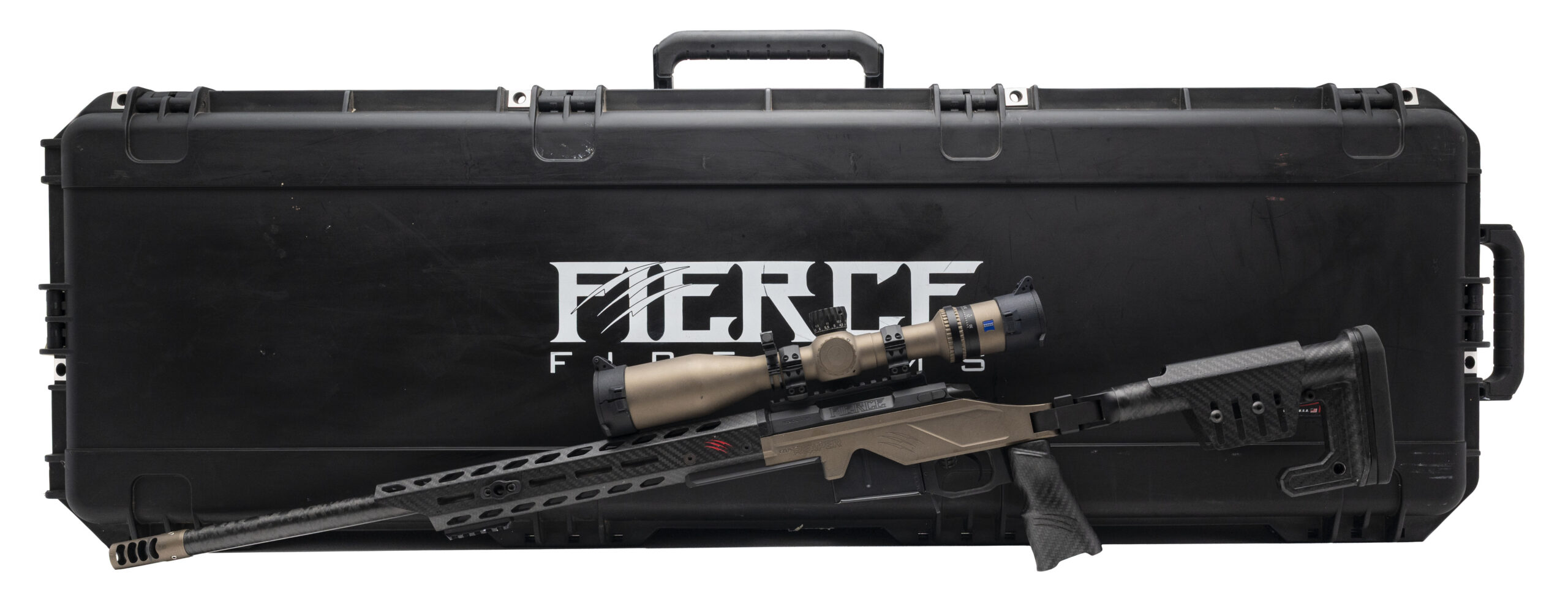 SN: 1FP10044. Modern production. Bolt-action precision rifle made by Fierce Arms. 22" threaded, carbon fiber wrapped barrel chambered for 6.5 PRC. Excellent condition with factory distressed Battle Tan finish. Comes with factory mounted Zeiss 5-30x50 scope and Fierce muzzle brake. Spiral fluted titanium bolt body. Triggertech Primary ProCurve adjustable trigger set to 2.5lbs. Features M-lok compatible carbon fiber handguard, lightweight alloy chassis and carbon fiber grip and folding stock with adjustable cheek riser. Comes with case and one magazine.