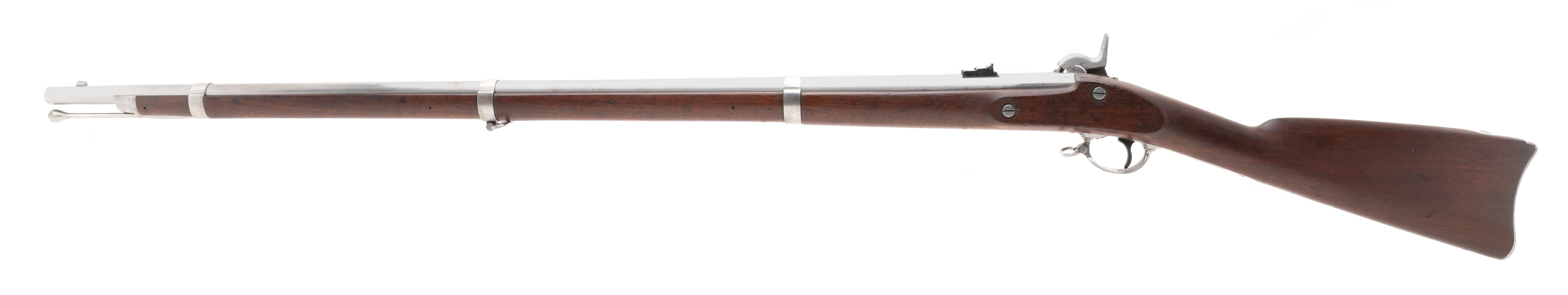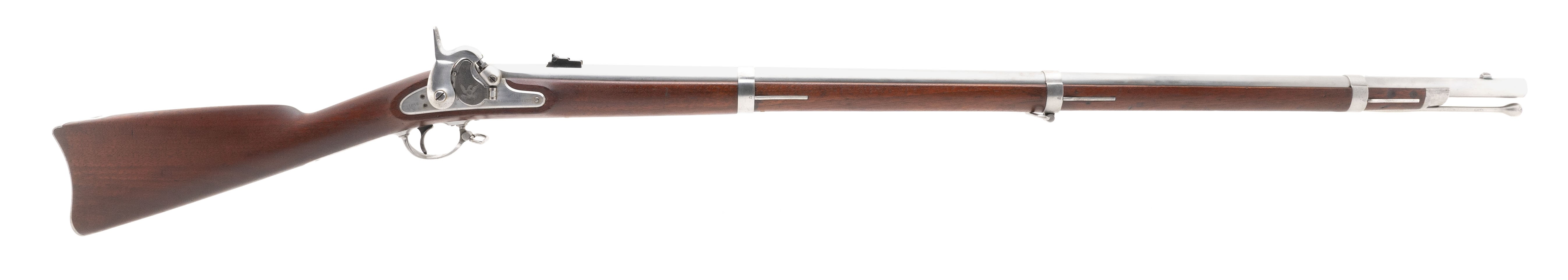 This 58 caliber percussion U.S. Model 1855 Rifle Musket was made by Springfield Armory in 1859. The 40" round barrel has a fine bore with strong rifling. The barrel has the V over P over eagle on the left flat at the breech and 1859 on the top flat. All the metal is polished bright. The stock is fine with no cracks or chips, sharp edges, very light issue wear, and a visible cartouche on the left flat. The action, including the Maynard tape priming mechanism, functions correctly. This is a very nice U.S. Model 1855 Rifle Musket. These are a must for any Civil War collection.