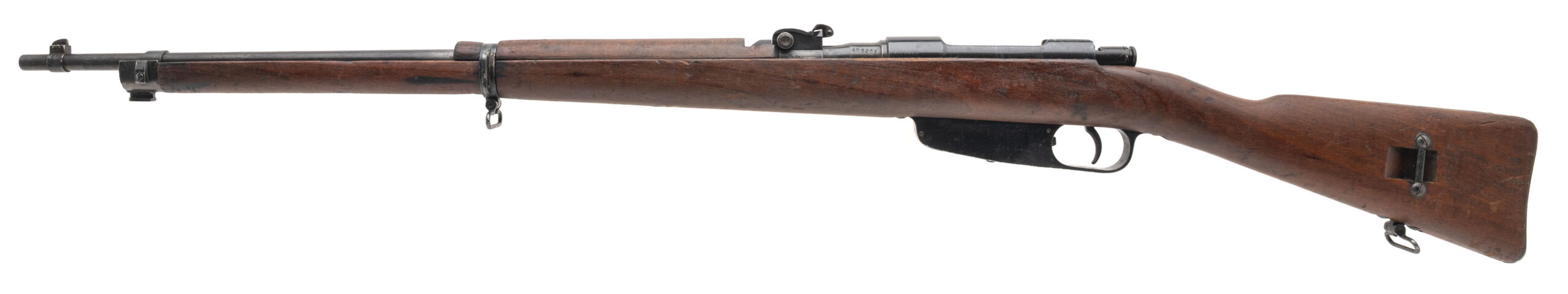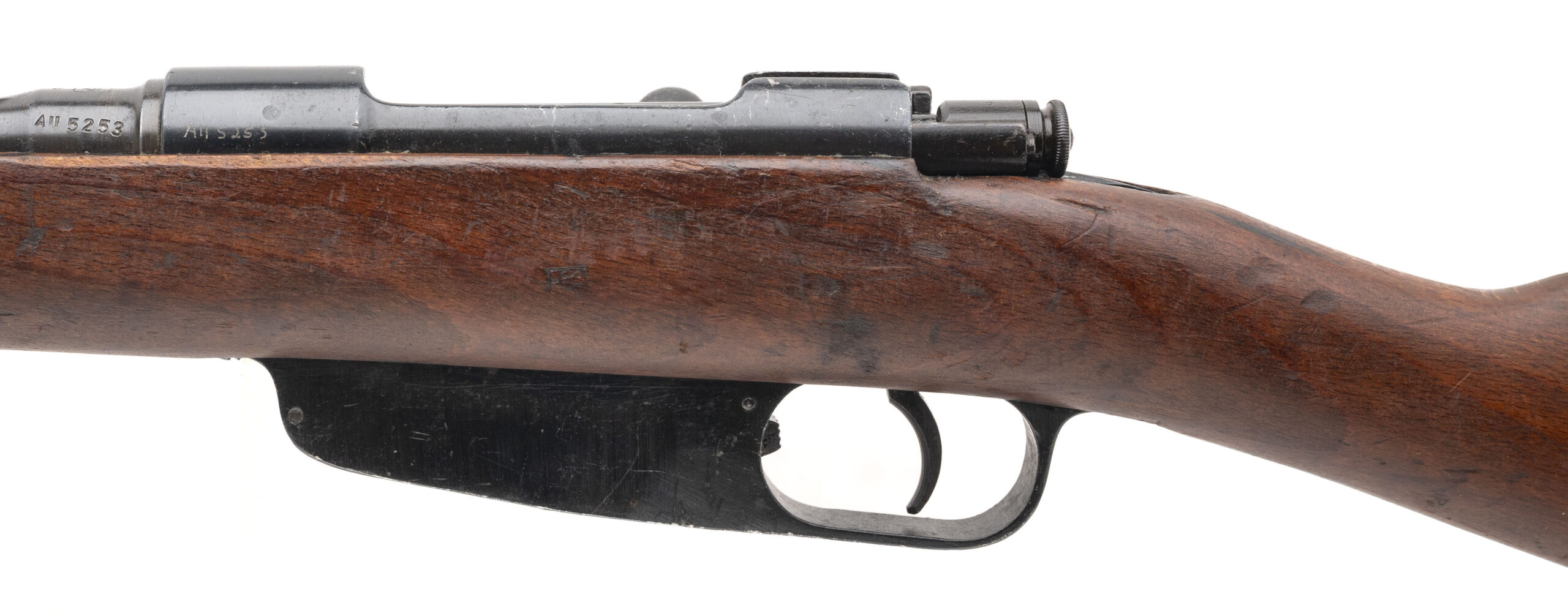 Serial No. AH5253, manufactured circa 1941, chambered in 6.5×52 Carcano with a 27" round barrel. The bore is good, showing light frosting in the grooves with strong rifling remaining. Serial numbers are matching throughout, and the bolt is unmarked. The stock shows expected handling marks from service use and is stamped “SA” on the left side, denoting Finnish capture and reissue. Overall condition is honest and representative of a rifle that saw wartime service beyond its country of origin. Action is smooth and functions correctly.