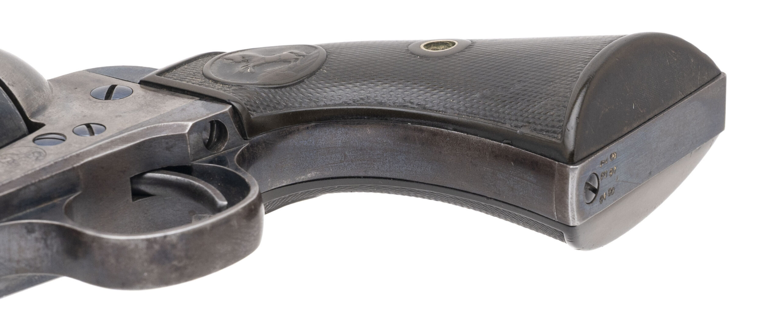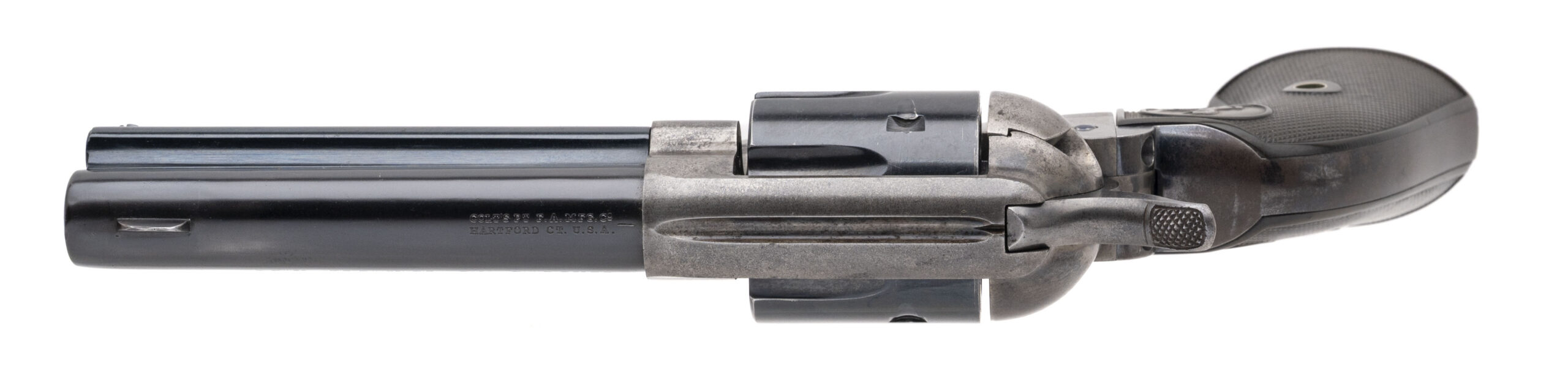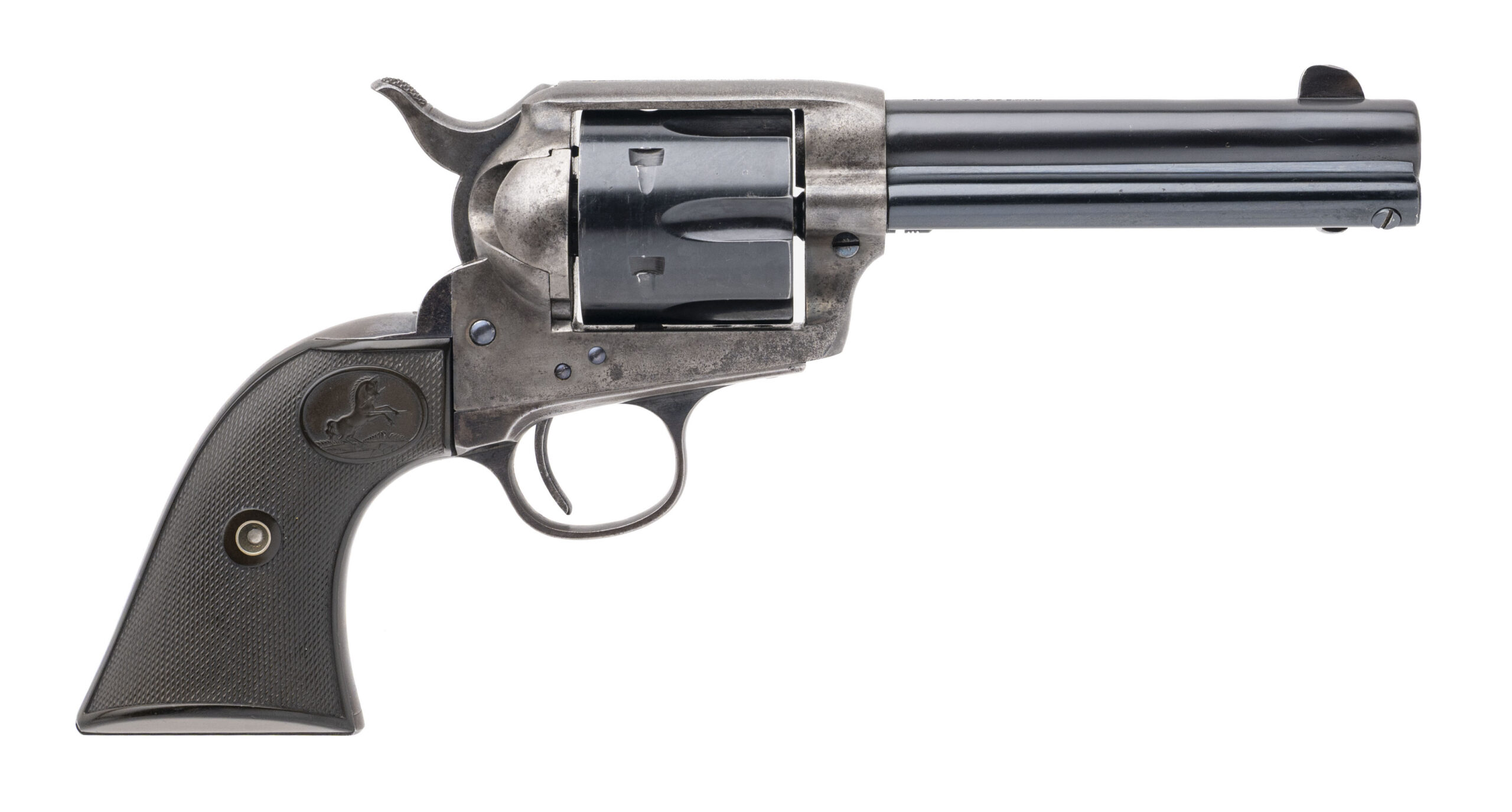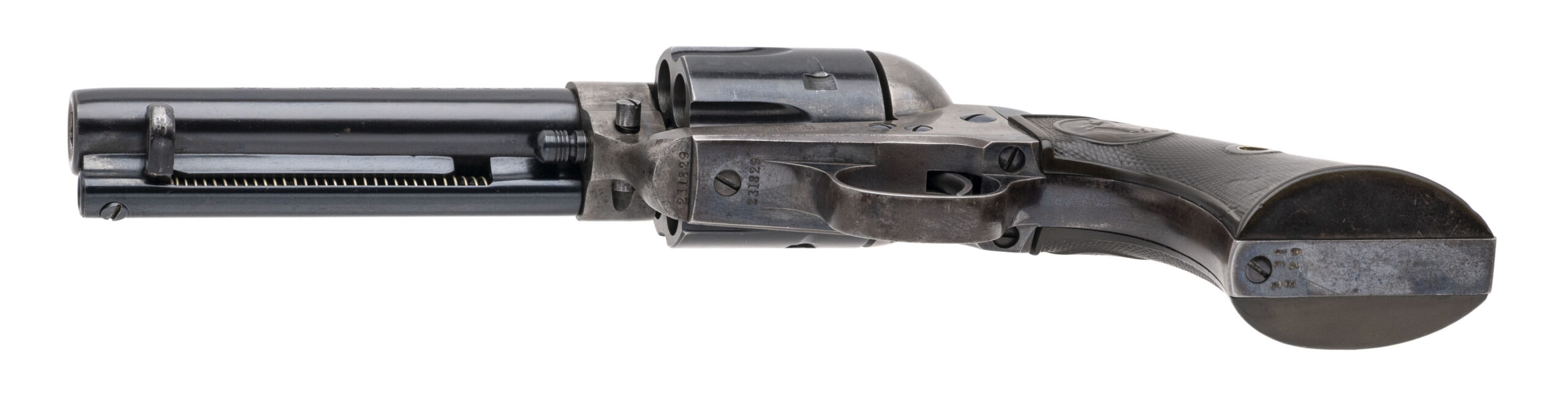 Serial number 231829. Made in 1902. 44-40 caliber with a 4.75” barrel. The barrel has been refinished. The cylinder is a later Colt replacement. The frame, trigger guard and back strap are all original. The frame still has some of the case colors. This is a very desirable configuration with a 4.75” barrel and in 44-40.