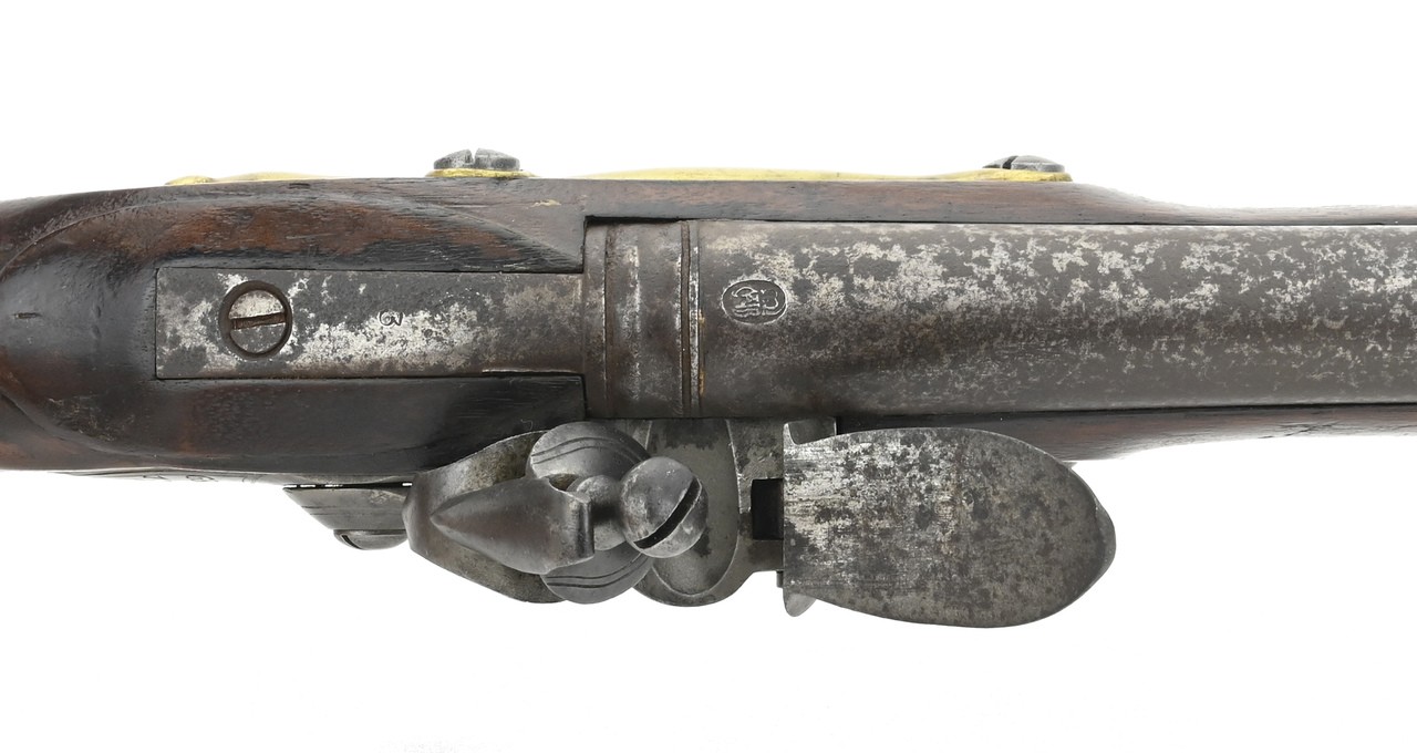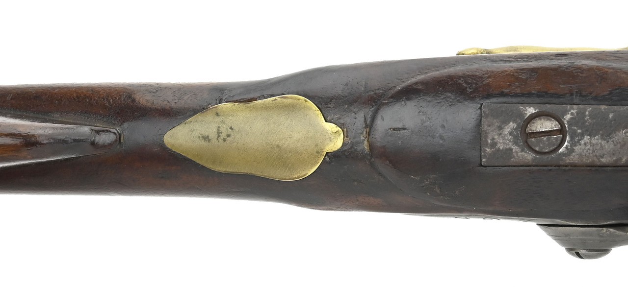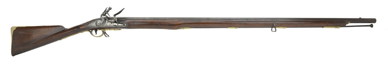 First Model Brown Bess musket, officially the Pattern 1756 Long Land musket. This is the pattern of musket that was carried by British forces at the start of the American Revolution. The overall length is approximately 62½”. The 46” round .75 caliber barrel has a good bore. The barrel has a proof crown / (?) at the chamber and a “3” on the tang. The barrel has a brown patina with light roughness overall. The lock with crown/GR at the center and “Grice/1762” at the tail is a modern replacement. The furniture is good with aged brass. The trigger guard is repaired to the rear of the bow. The stock is good with repairs around the lock and wrist. The brass nose cap is missing. The swivels and ramrod are present. The action functions correctly, fill that hole in your collection for a reasonable price. First model Brown Besses rarely turn up in any condition. As we mentioned, the lock is a modern replacement that looks very good, and, as a result, this musket won’t cost you $15,000.00.