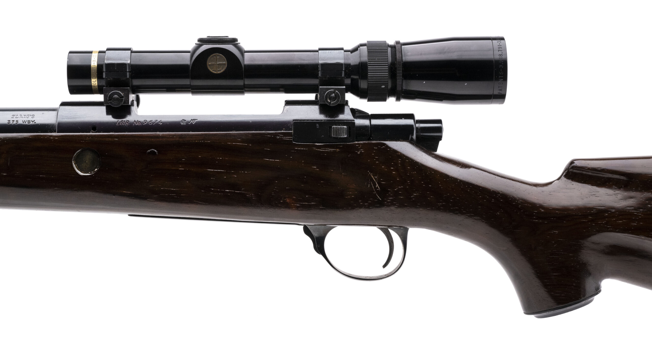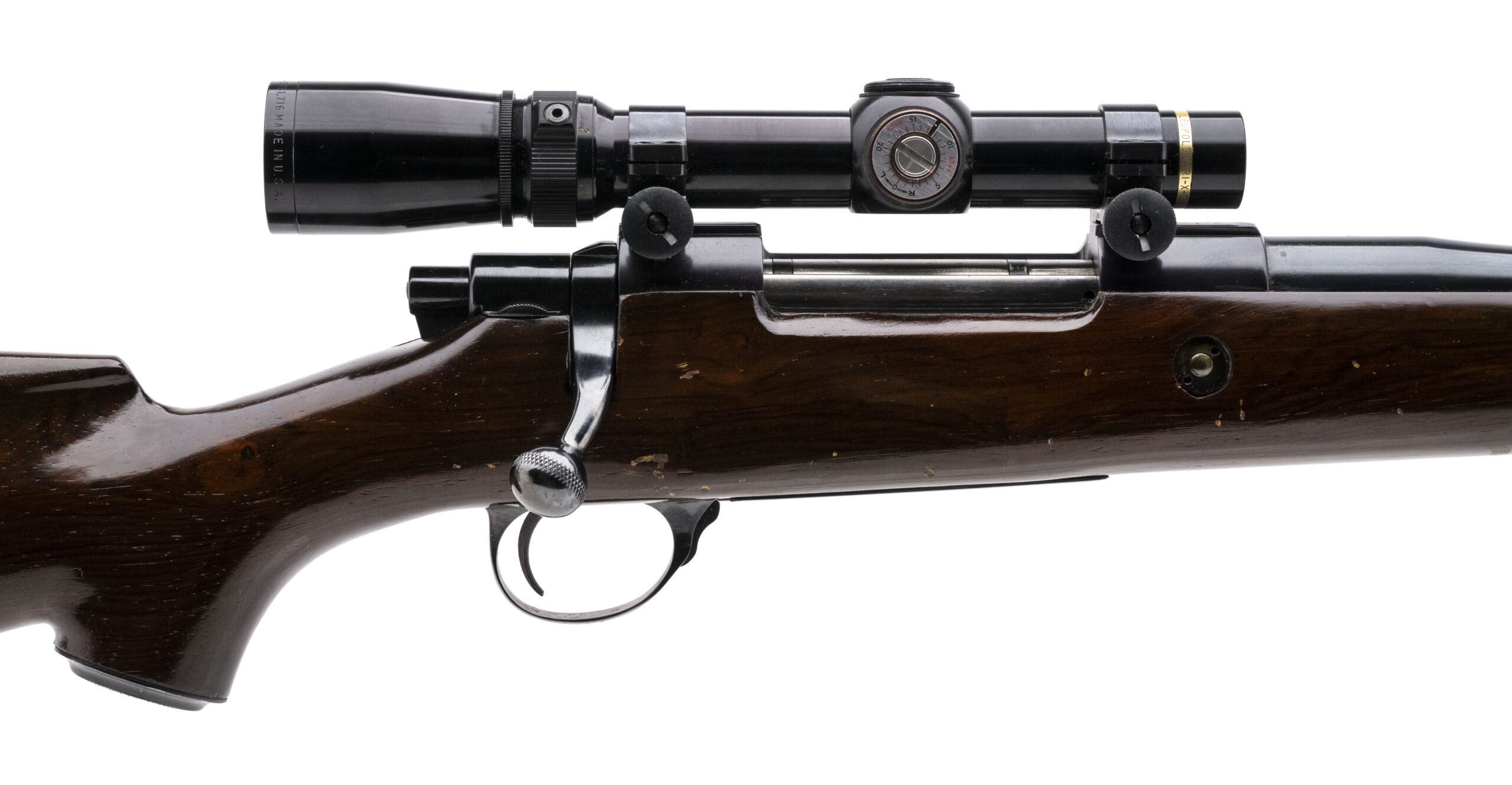 SN: 9674. Made circa 1960s, .375 Weatherby Mag with an 24" barrel. Bore is bright with excellent rifling. Custom bolt action rifle made by Flaig's. The .375 Wby Mag chamber also shoots .375 H&H if needed. Has a smooth uncheckered stock and a Leupold 1.5x5 scope. Finish is in very good condition with minor wear. Overall condition is very good.