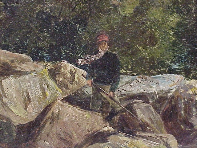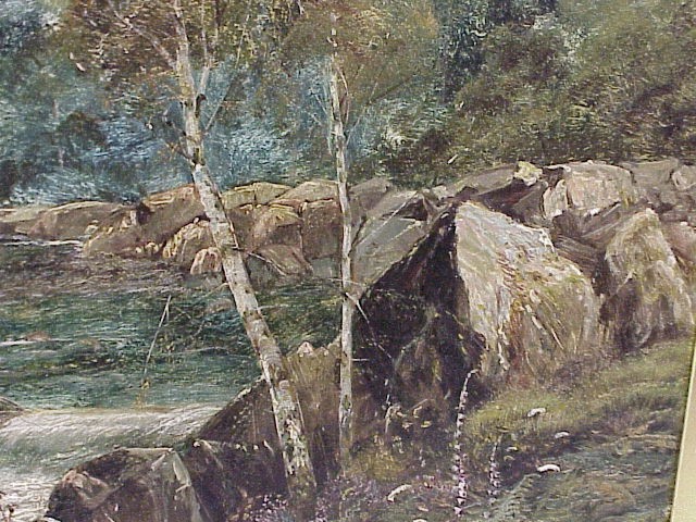 Fly Fishing In Scotland oil on canvas by Theodore Hines. Signed by the artist on the lower right hand corner. This is a recently cleaned painting in a nice frame. No damage or inpainting. Very pleasing with bright colors. The painting has a very nice perspective. Canvas measures 31.5" x 17.5".
