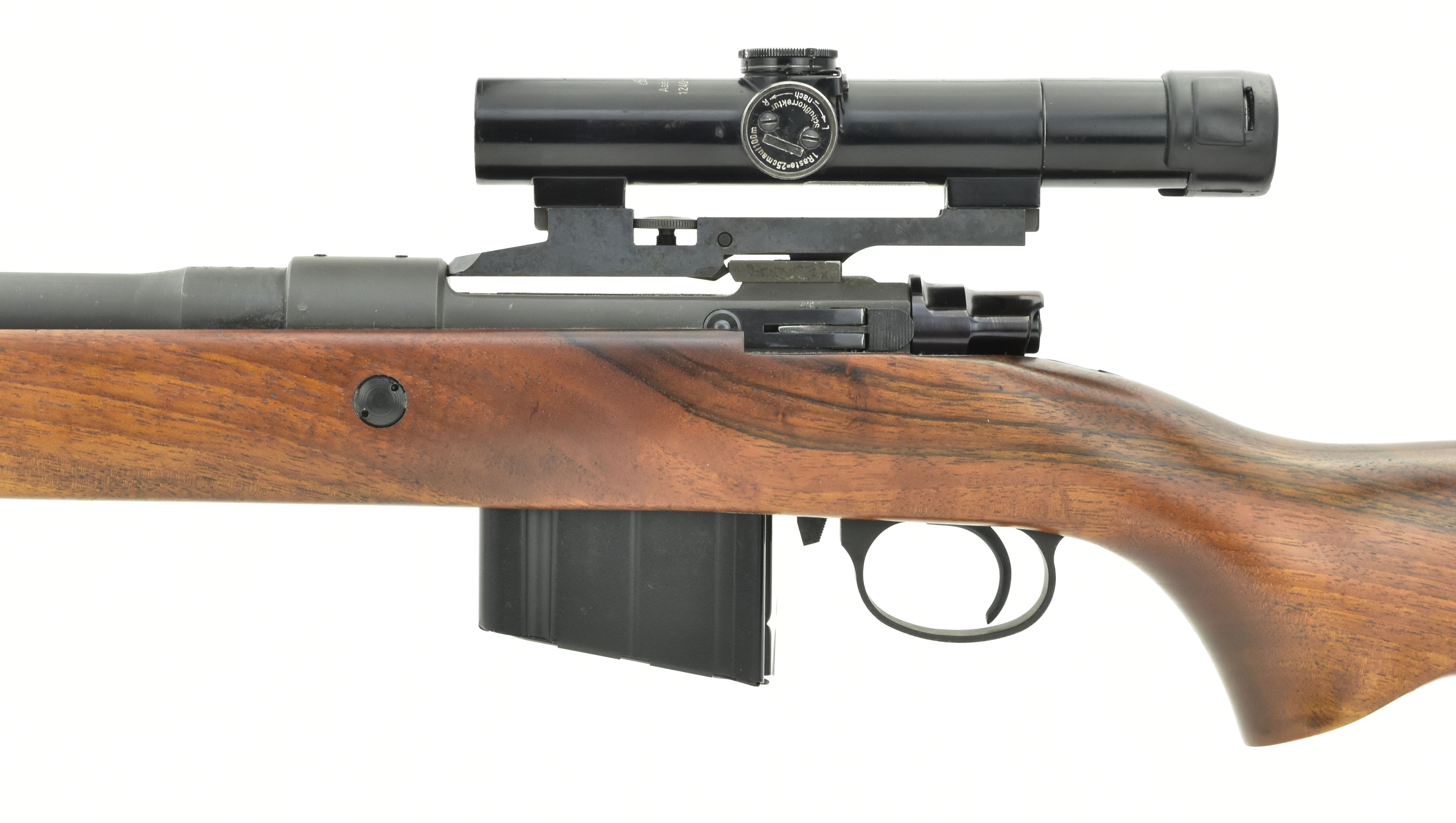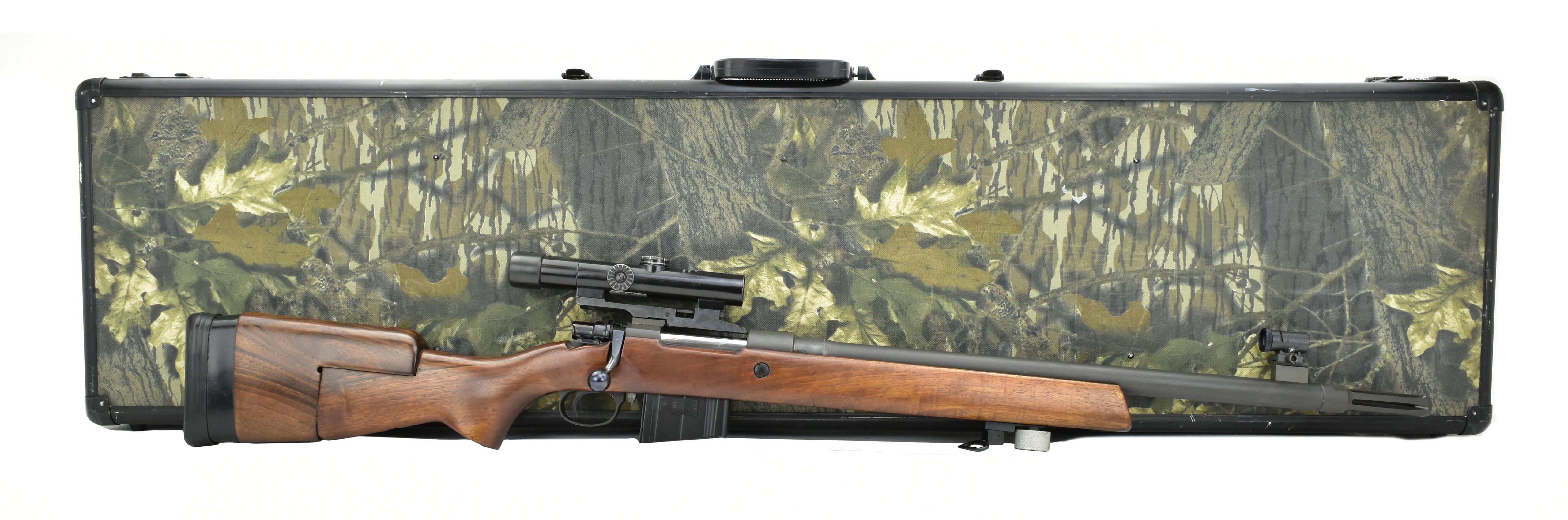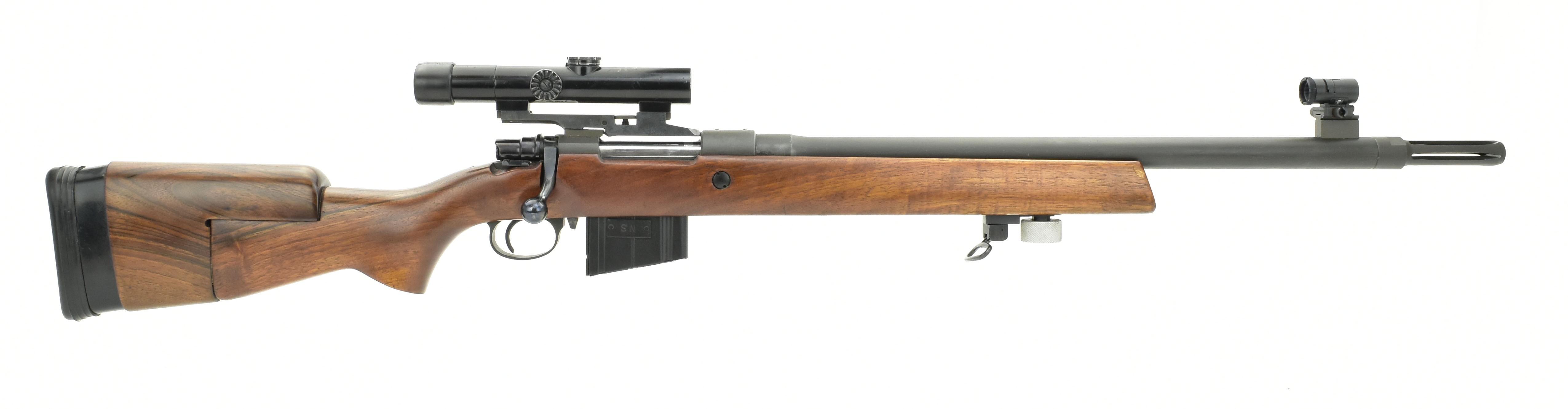 FN 30-11 Sniper.308 Win caliber rifle. Rare model 30-11 Belgian made sniper rifle, built on a Mauser action with 20” barrel, flash suppressor, adjustable stock and Karl Kaps scope. Has the correct Anschutz target sight, extra magazine, sling and an aftermarket bipod. Very good condition overall. A scarce and desirable vintage sniper rifle with case.