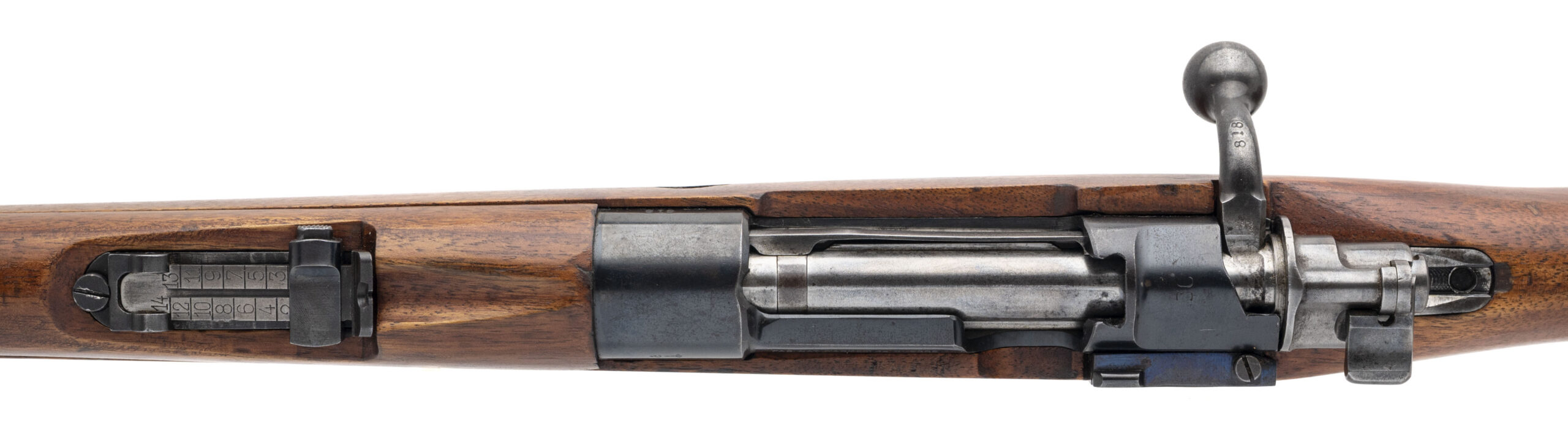 SN: 818. Belgian Mauser-action rifle made by FN. 17½" barrel chambered for .30-06 Springfield. Very good condition with finish wear and handling marks in the blue metal finish. Wood stock is great with some wear near the buttplate and handling marks in the dust cover. Bore is excellent. "CAI" import marks on either side of the barrel behind the front sight.