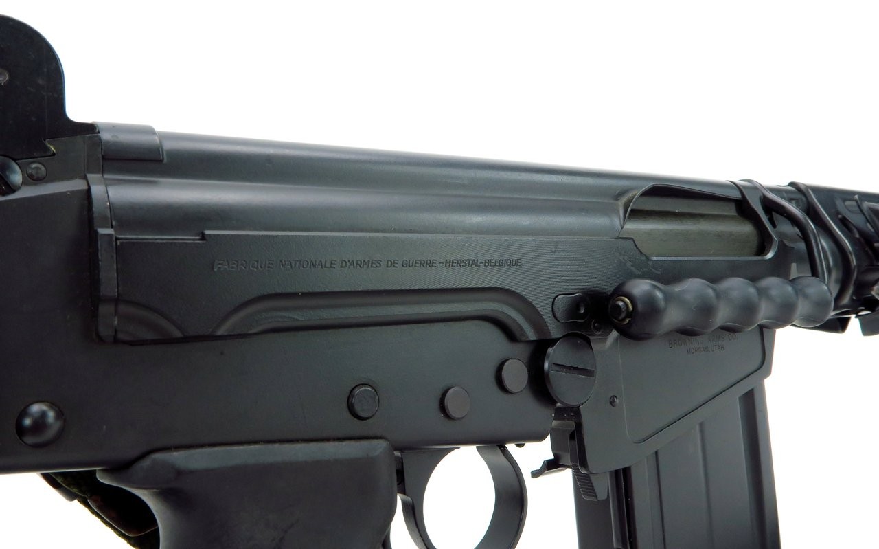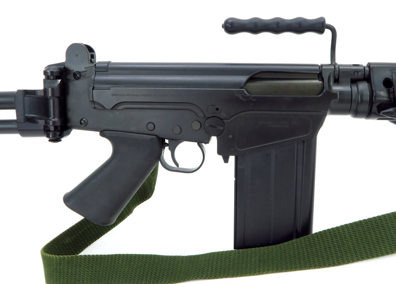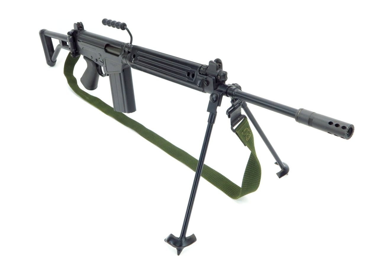 FN FAL .308 Win caliber rifle. FN FAL Belgian 50.61 Paratrooper. Rare lightweight hiduminium lower receiver Type II. FN designed this to be the lightest weight FAL produced. These rifles identified by serial number on usual places as well as the pistol grip. Browning only imported a small number of these rifles. A very desirable variation. All serial numbers are matching. GI pattern with metal handguard and bi-pod.