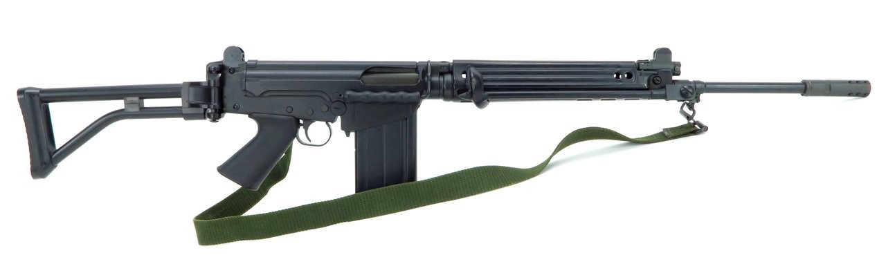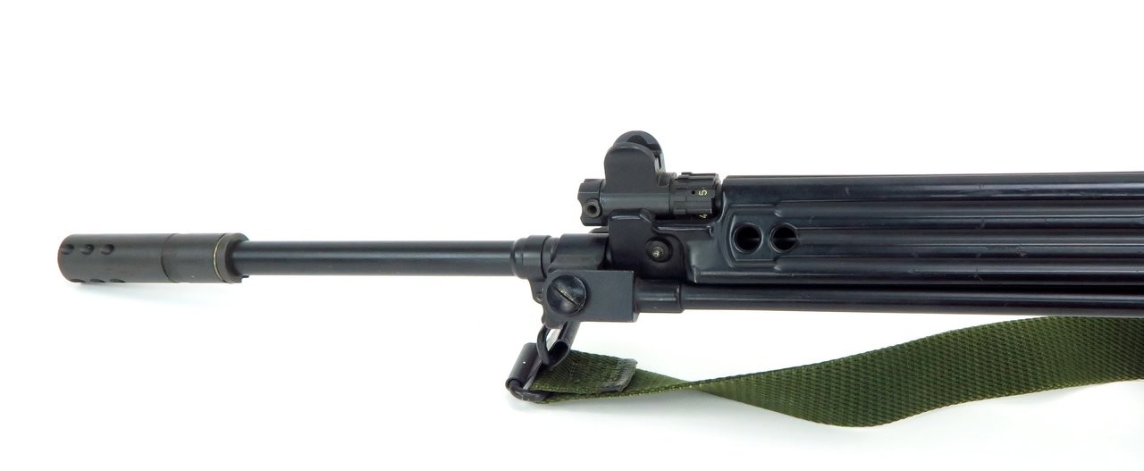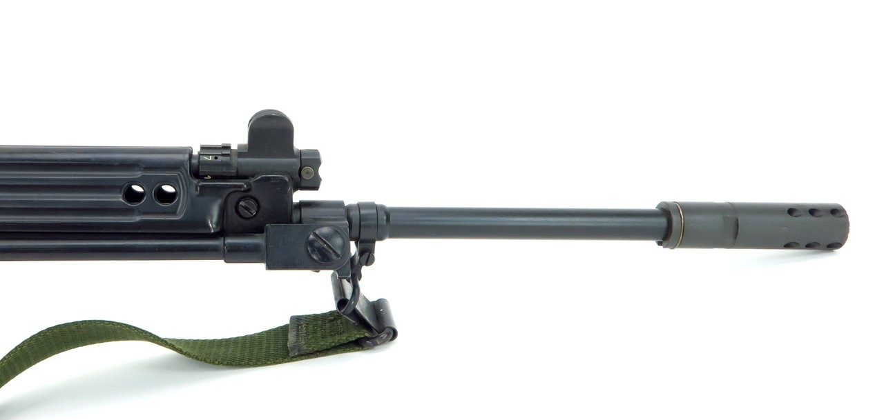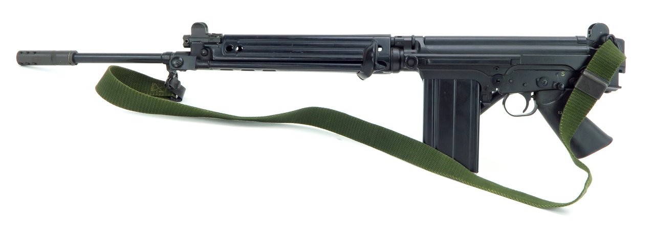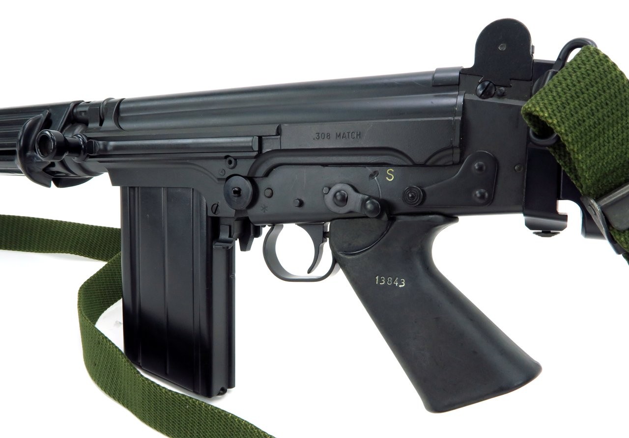 FN FAL .308 Win caliber rifle. FN FAL Belgian 50.61 Paratrooper. Rare lightweight hiduminium lower receiver Type II. FN designed this to be the lightest weight FAL produced. These rifles identified by serial number on usual places as well as the pistol grip. Browning only imported a small number of these rifles. A very desirable variation. All serial numbers are matching. GI pattern with metal handguard and bi-pod.