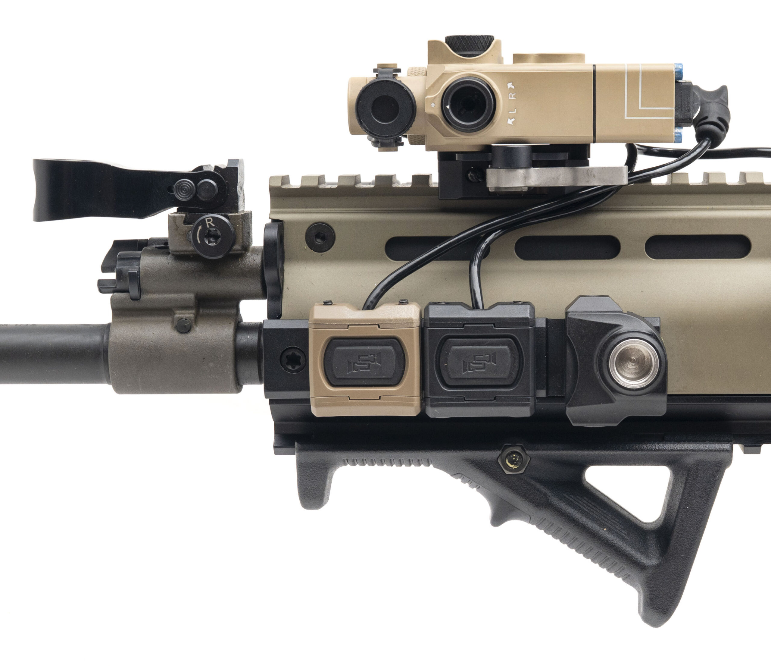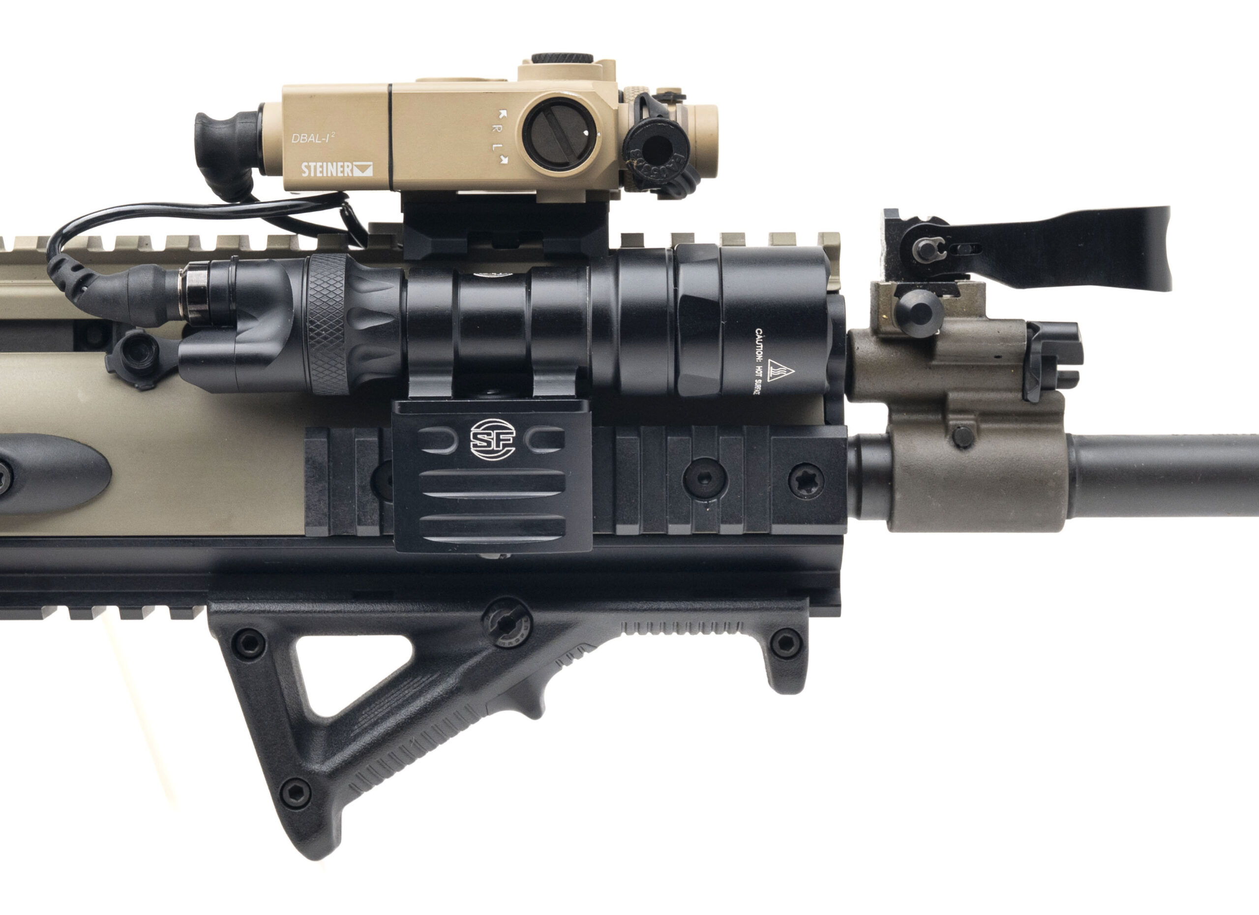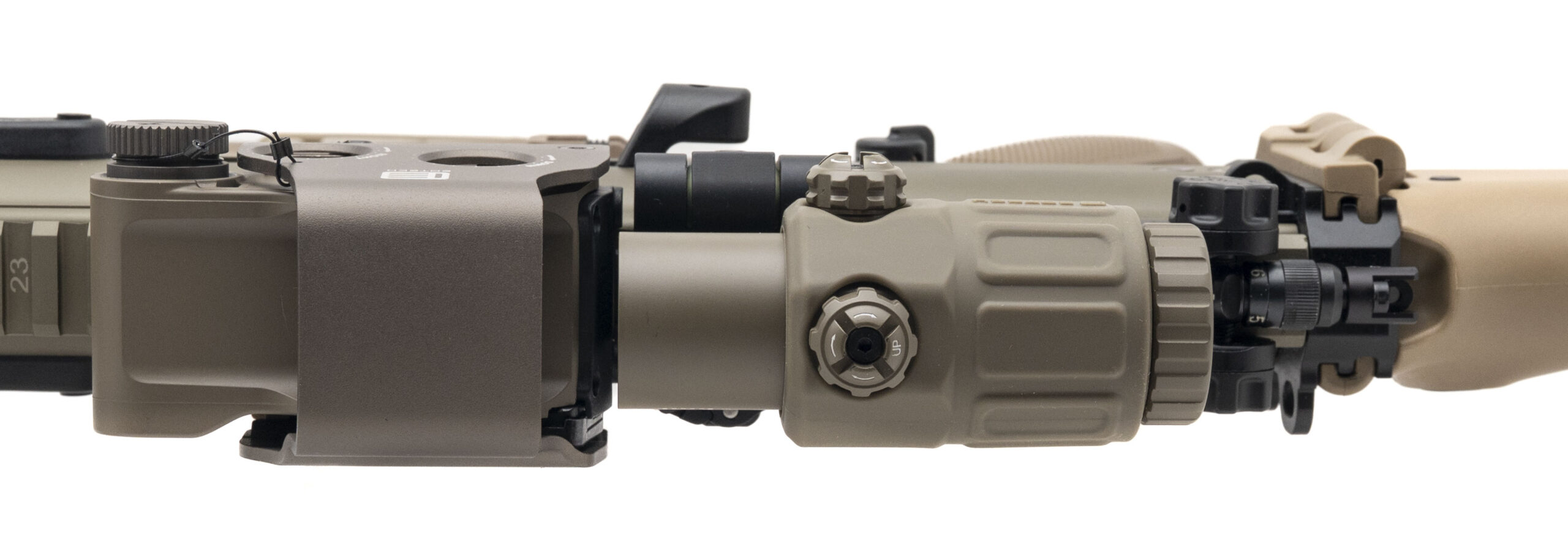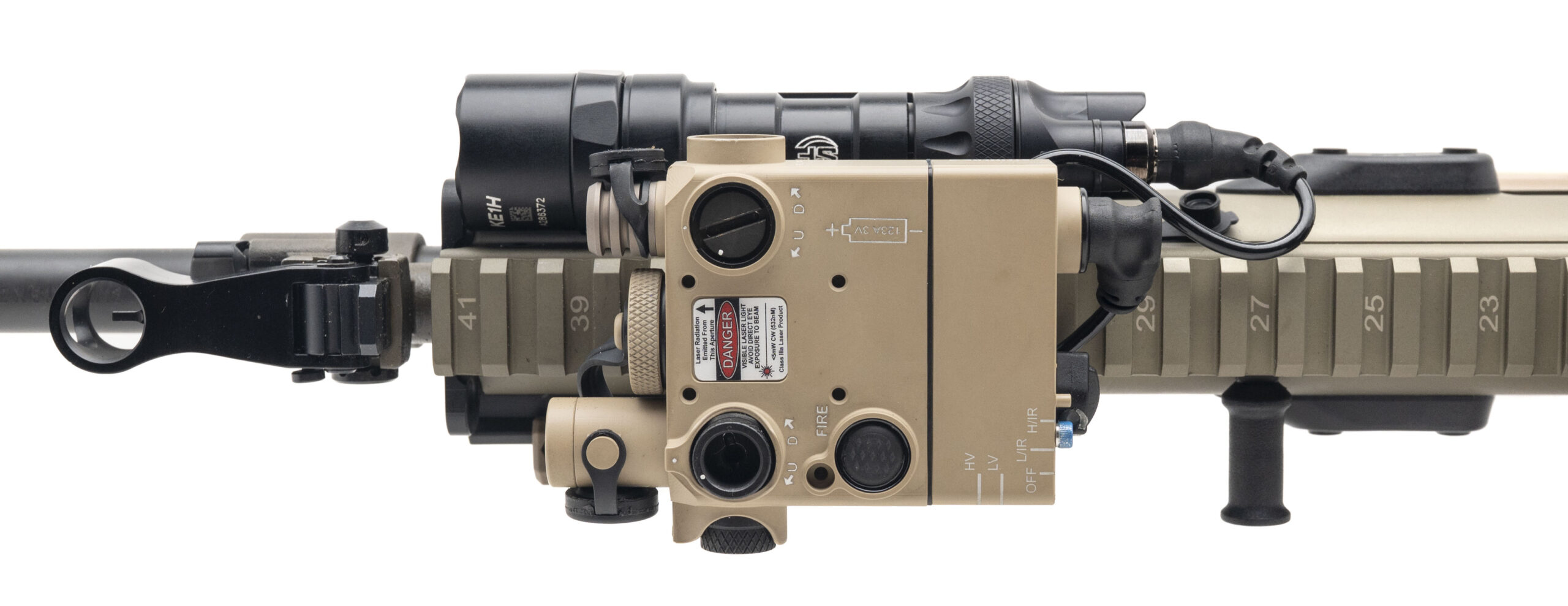 SN: H0C21072. Modern production, 7.62 NATO with a 16" barrel. Bore is bright with strong rifling. Semi-Auto tactical rifle with a Steiner DBAL-1 2 green beam IR laser w/taper switch, Eotech EXPS3 w/night vision mode and red circle dot reticle & G36 magnifier combo, and a Surefire Scout flashlight w/SF side mount adapter & taper switch. Overall condition is near excellent. Comes with a range bag and an extra magazine.