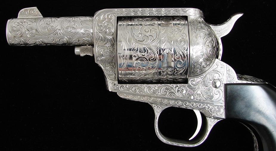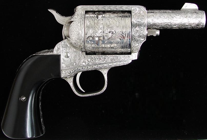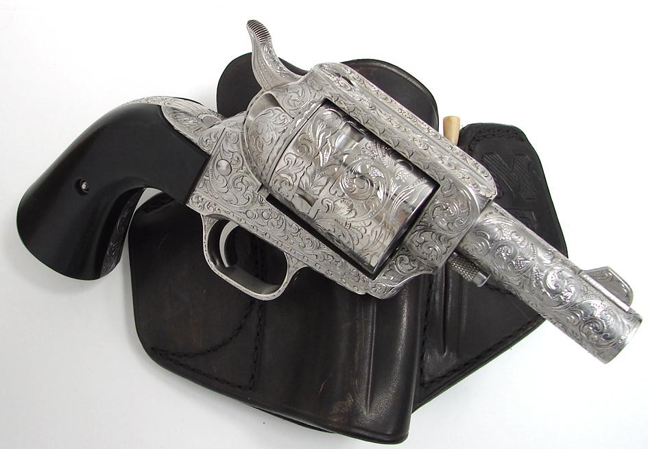 Freedom Arms 83 .454 Casull caliber revolver. Fancy custom engraved Alaskan model with 3 barrel. Has full coverage scroll engraving, bright nickel finish and black Micarta grips. Comes with a custom Thad Rybka holster with a slot for the manual ejector rod. A great gun for Saturday night in bear country.