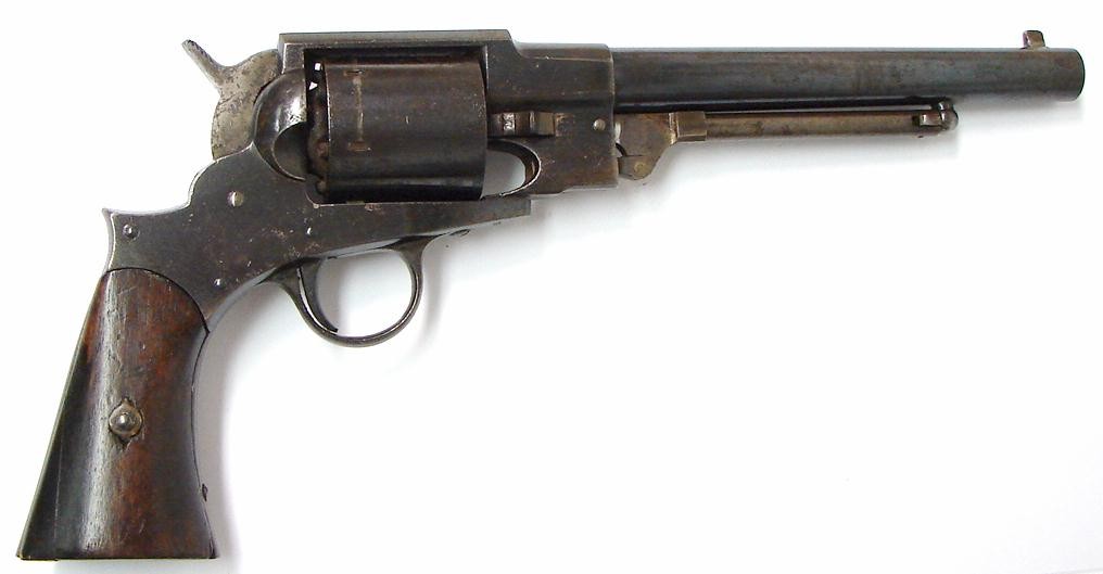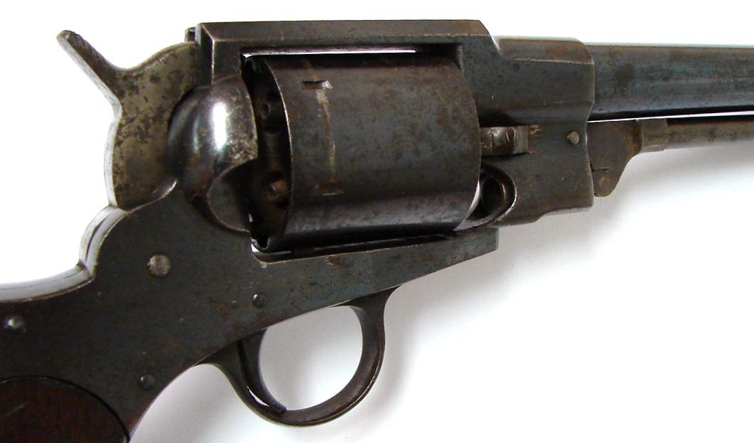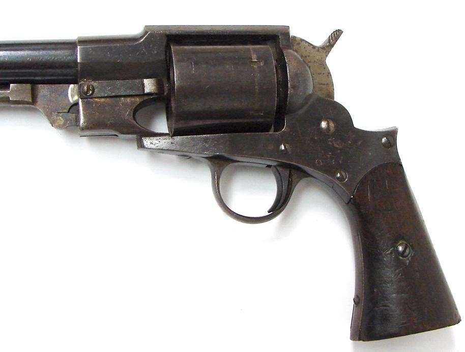 Freeman Civil War revolver .44 caliber. Manufactured in 1863-64 with approximately 2000 made by Hoards Armory in Watertown, New York. Gun has an excellent bore. Gun has approximately 90-93% original blue. Front sight has a solder repair and right side grip has a repair at the heel of the butt. This is an exceptionally fine example. These revolvers are hard to find in nice condition and this one is exceptional.