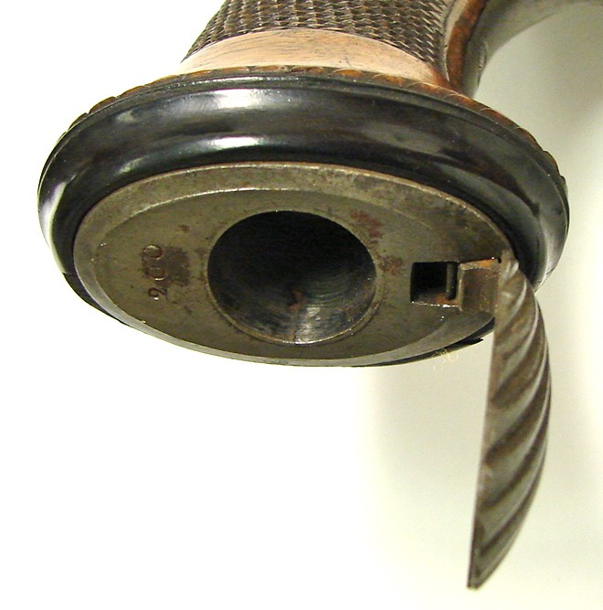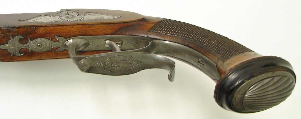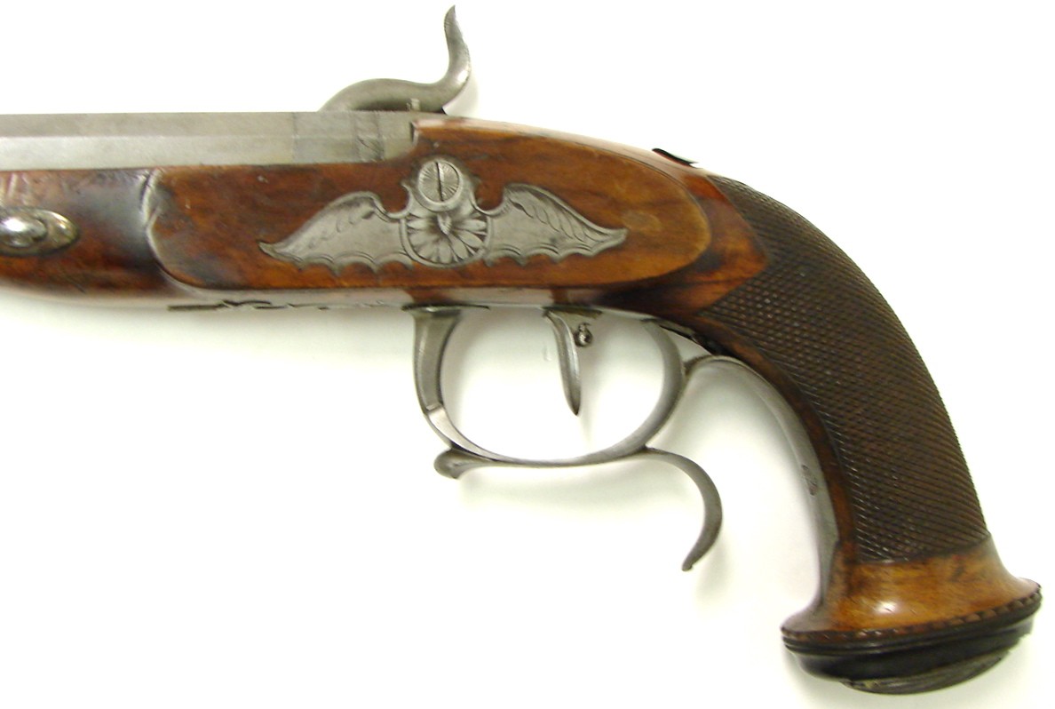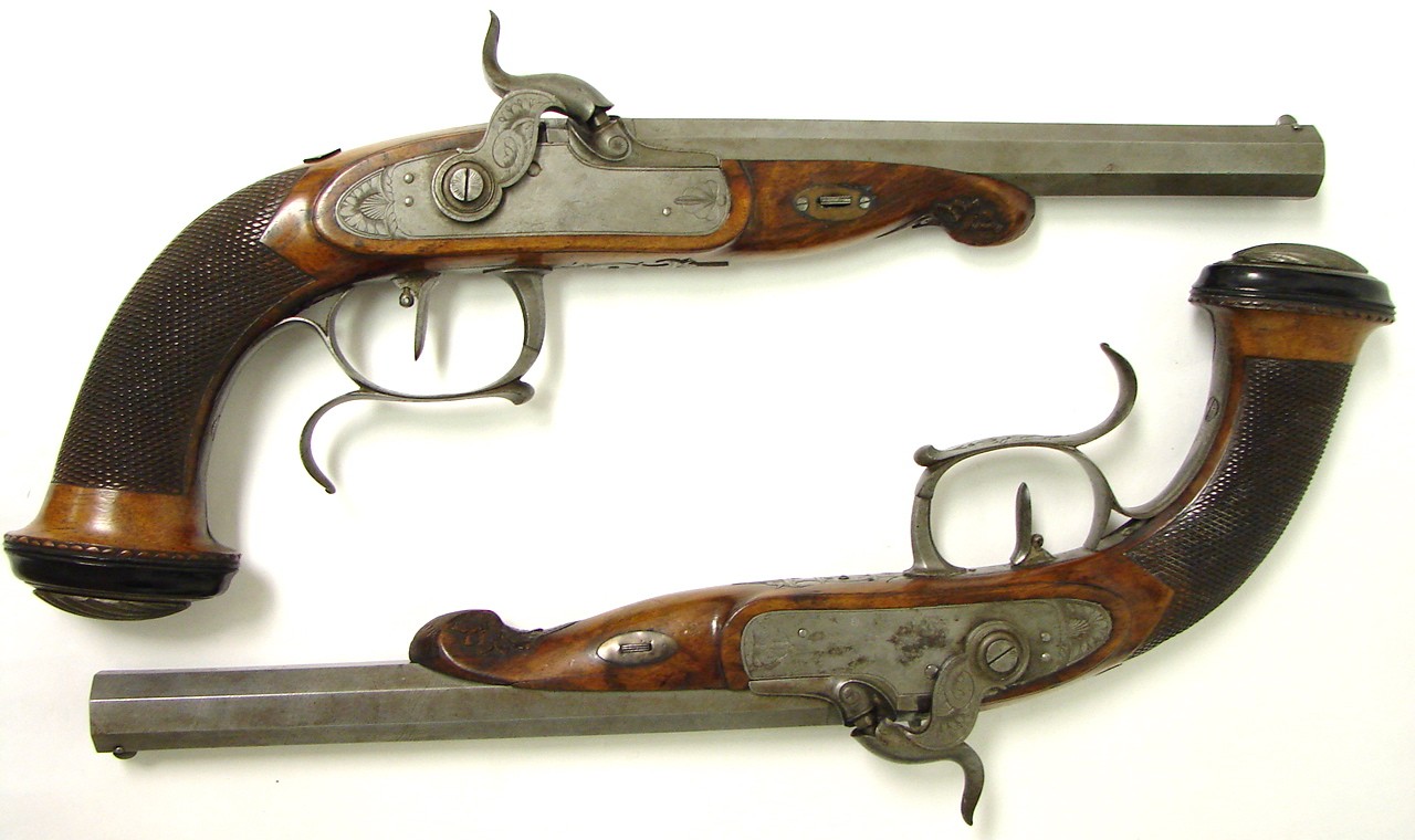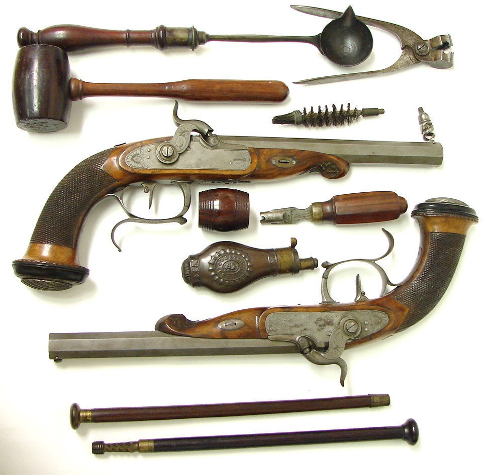 French cased pair of Officers Target pistols. Large rifled bores. Barrels are 8" long and overall length is 13 1/2" Guns have a subdued French grey finish with two distinct patterns of Damascus. Guns have adjustable set triggers. Guns are unmarked. Gus, case and accessories are all excellent.