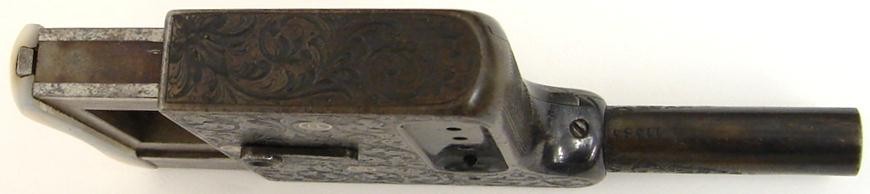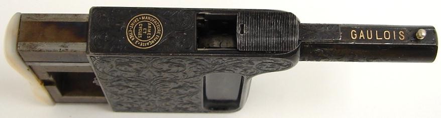 French Gaulois Palm Squeeze pistol. Blued and case hardened finish. Factory engraved. Manufacture Francais logo, Gaulois name and safety position are gold inlaid. Has pearl handle. Very desirable pistol for oddity collector.