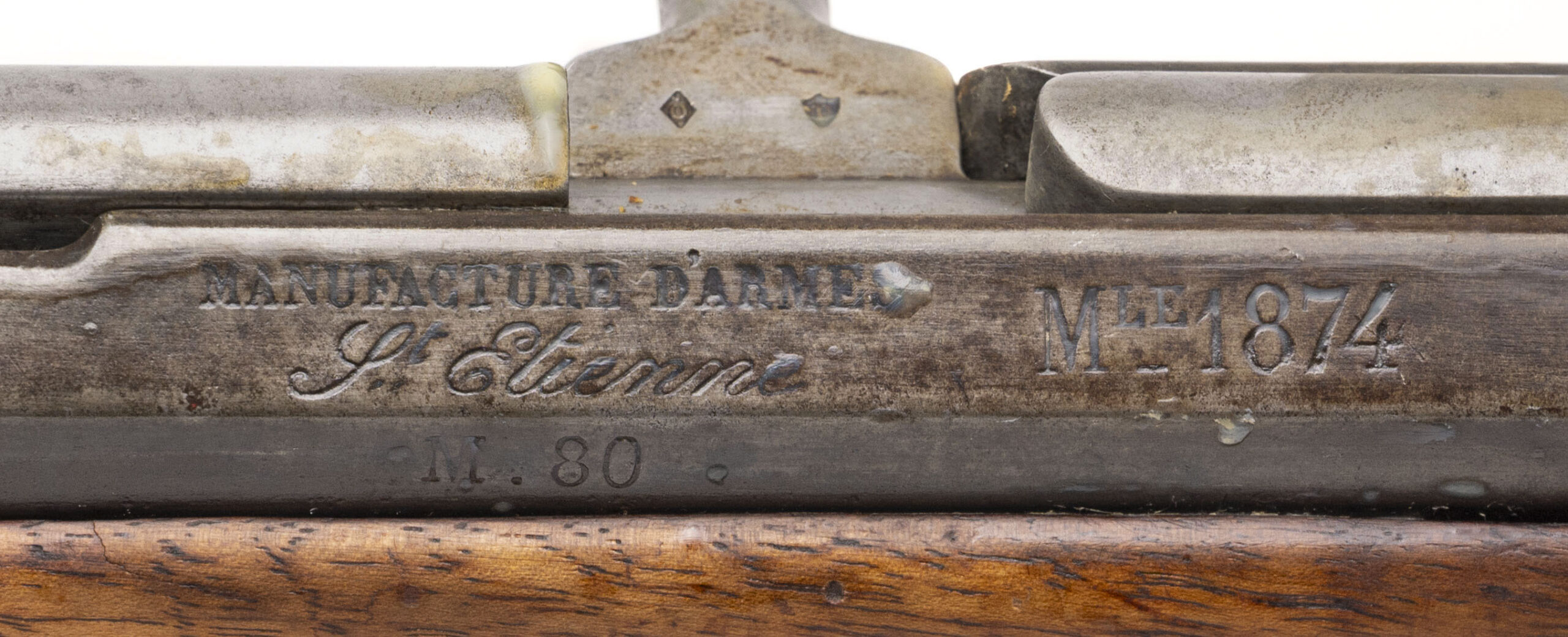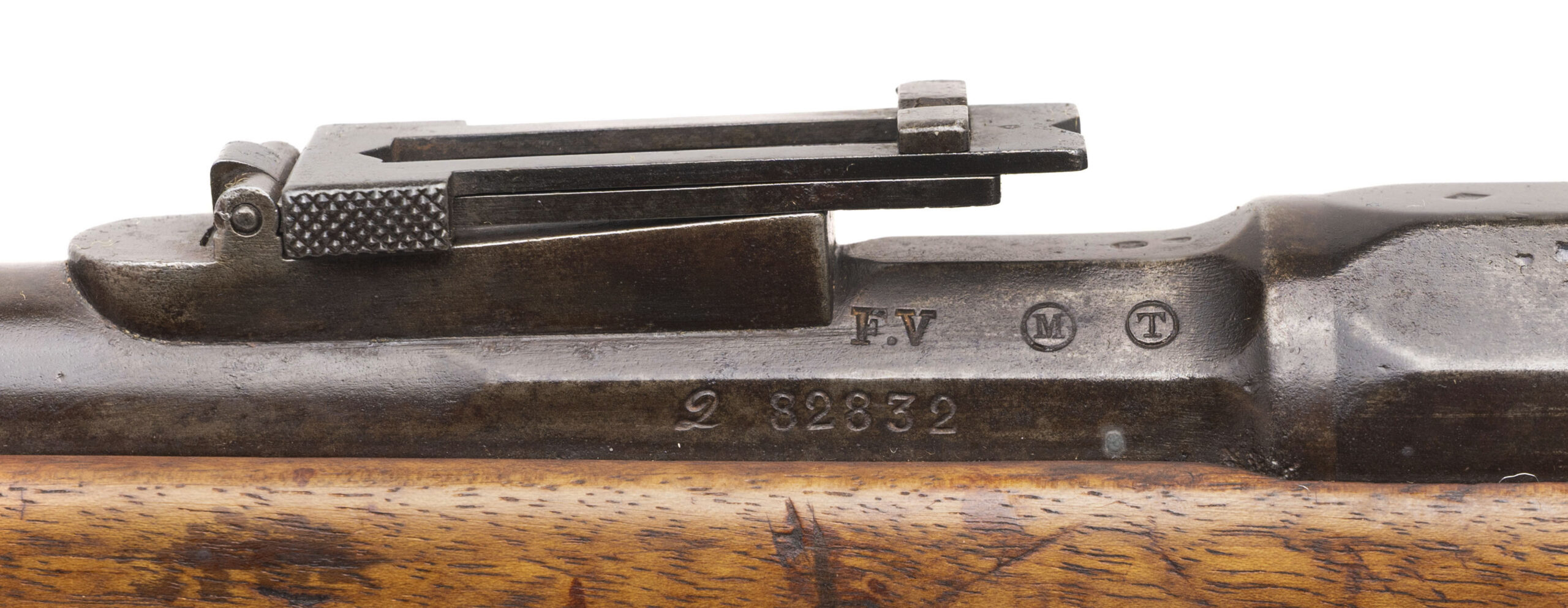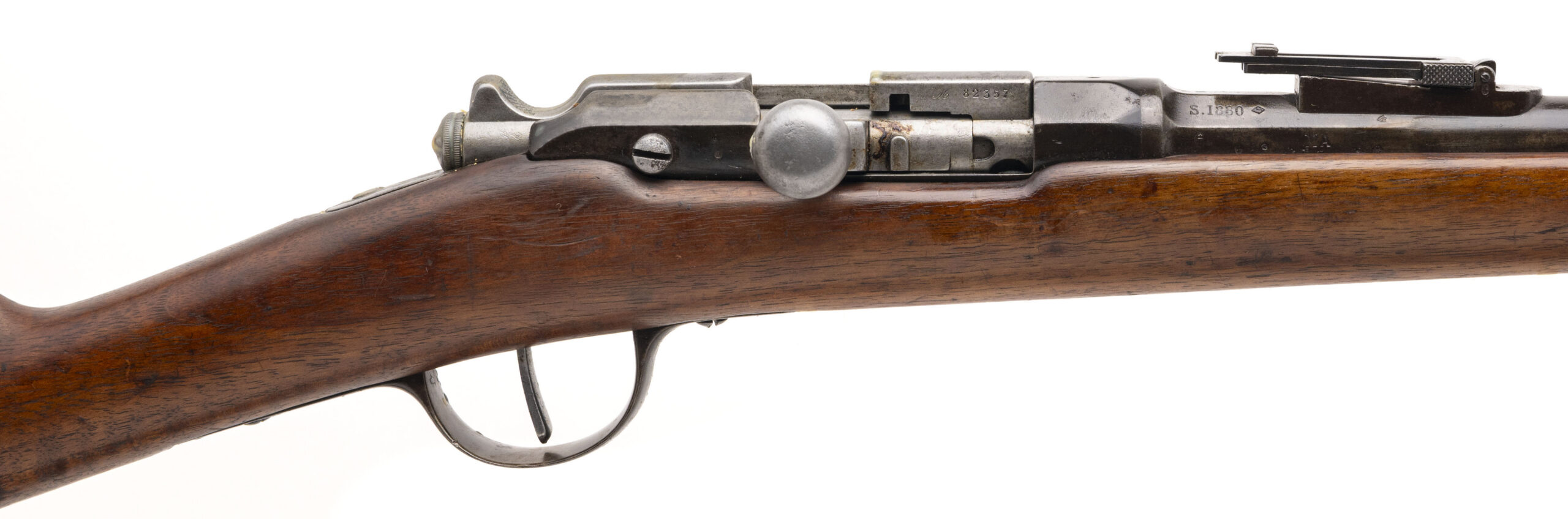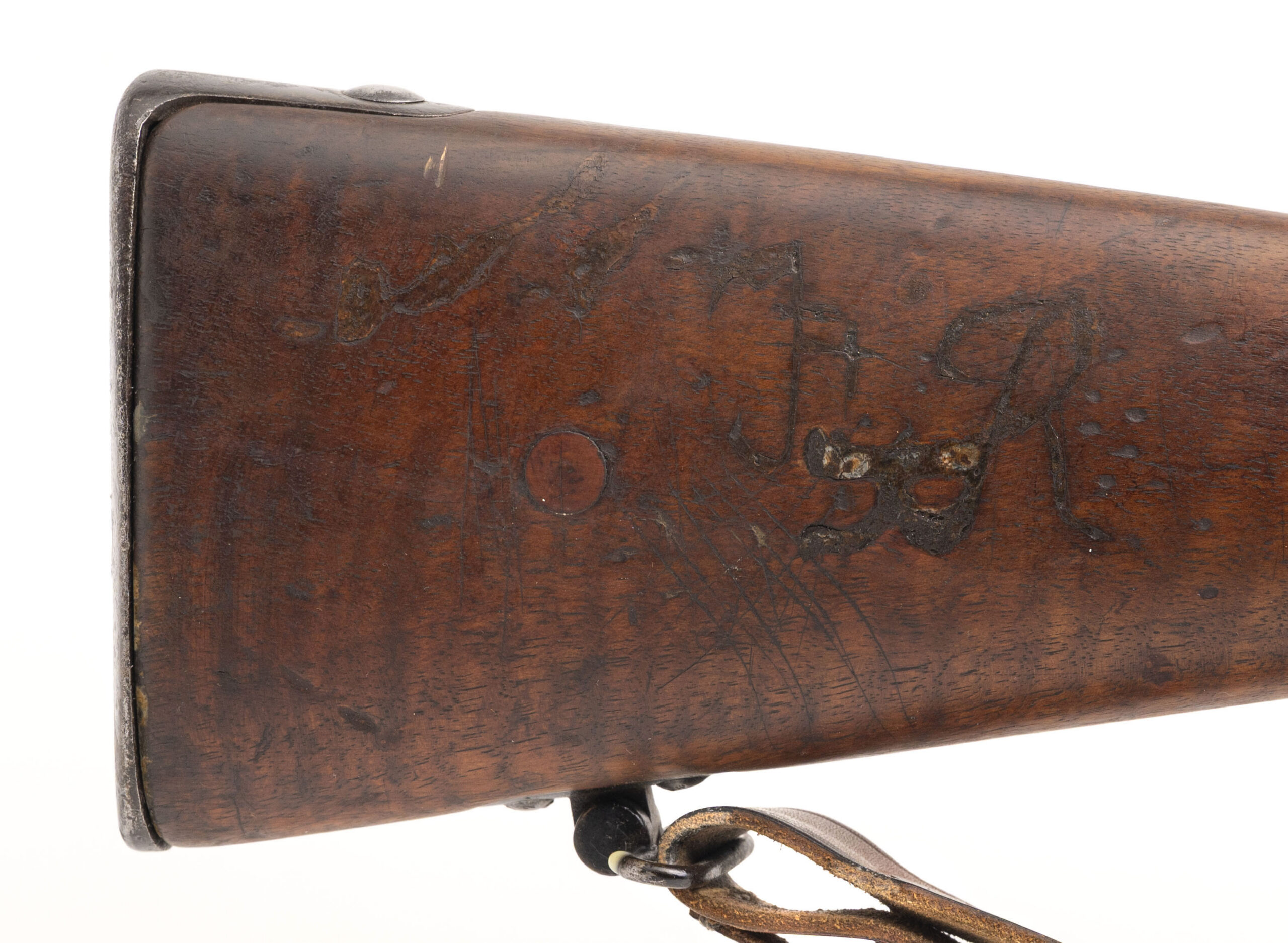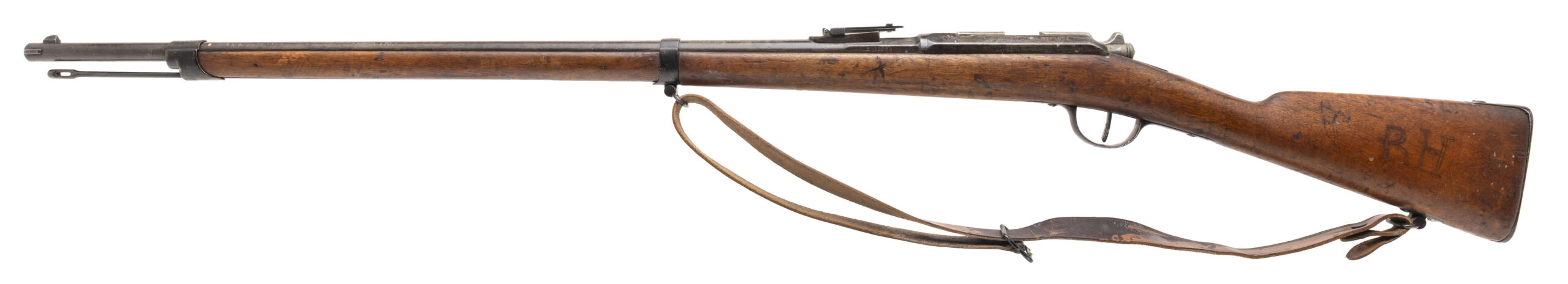 Serial No. 82832, manufactured in 1880, chambered in 11x59mmR with a 32 ½” round barrel. Bore is very good with strong, well-defined rifling. Serial numbers are non-matching. Metal surfaces have aged to a smooth, dull dark grey patina consistent with long service. The stock shows expected handling and service marks, with period-carved initials present on both sides of the butt, adding character and individuality to the piece. Overall, it remains a solid example of France’s primary service rifle of the late 19th century. Action is smooth and functions correctly.
