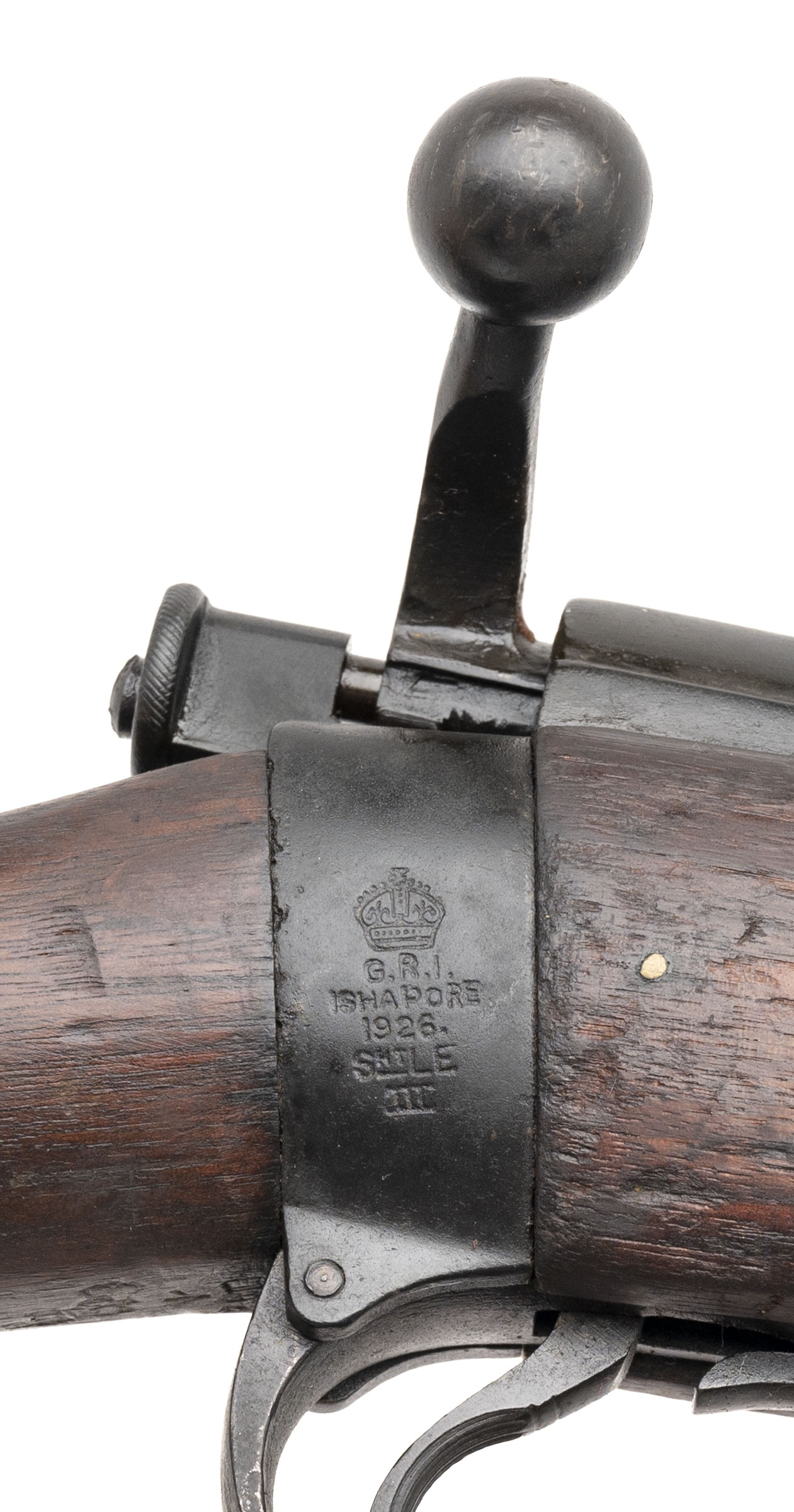 Serial No. 45206c, manufactured in 1926 at the Ishapore Rifle Factory, .303 British, 25” round barrel. Bolt is non-matching to the receiver. Rifle remains in good overall condition, showing expected handling and service wear consistent with long-term military use. Metal finish has toned to a uniform grey patina, and stock exhibits light surface impressions from use. Some internal mechanical components retain traces of cosmoline, indicating extended storage. Action is smooth and functions correctly. A solid example of an early post-WWI Indian-manufactured SMLE, reflecting both British design heritage and Ishapore craftsmanship.