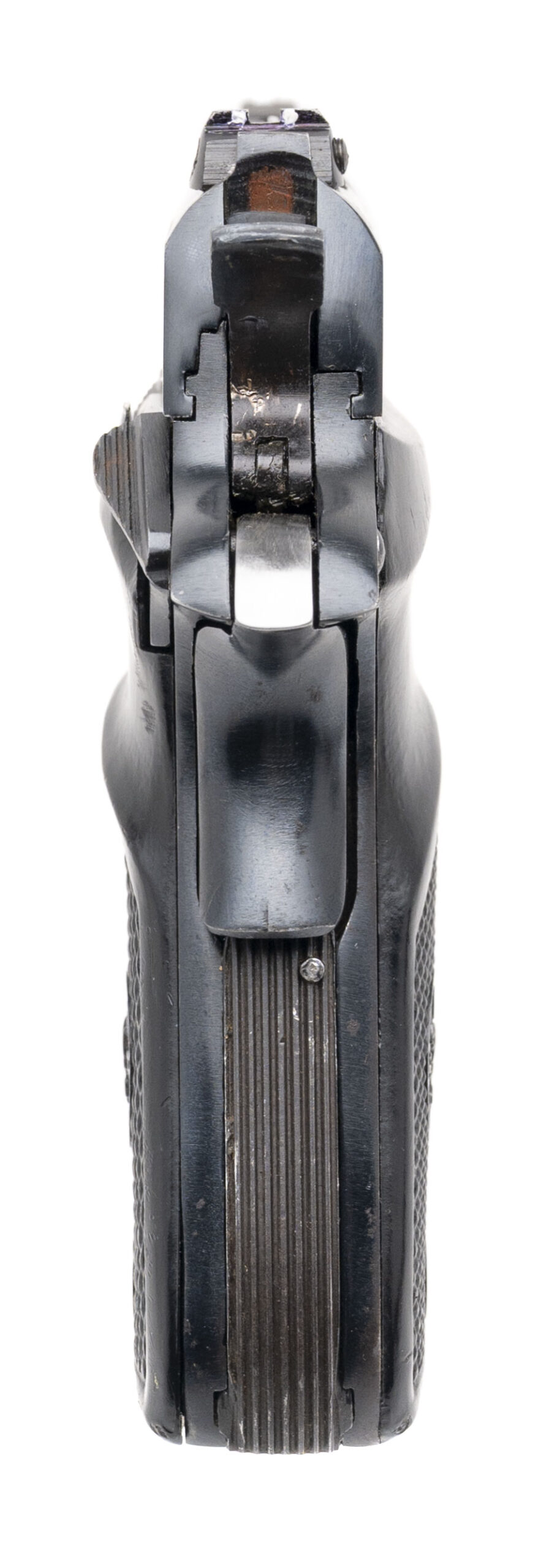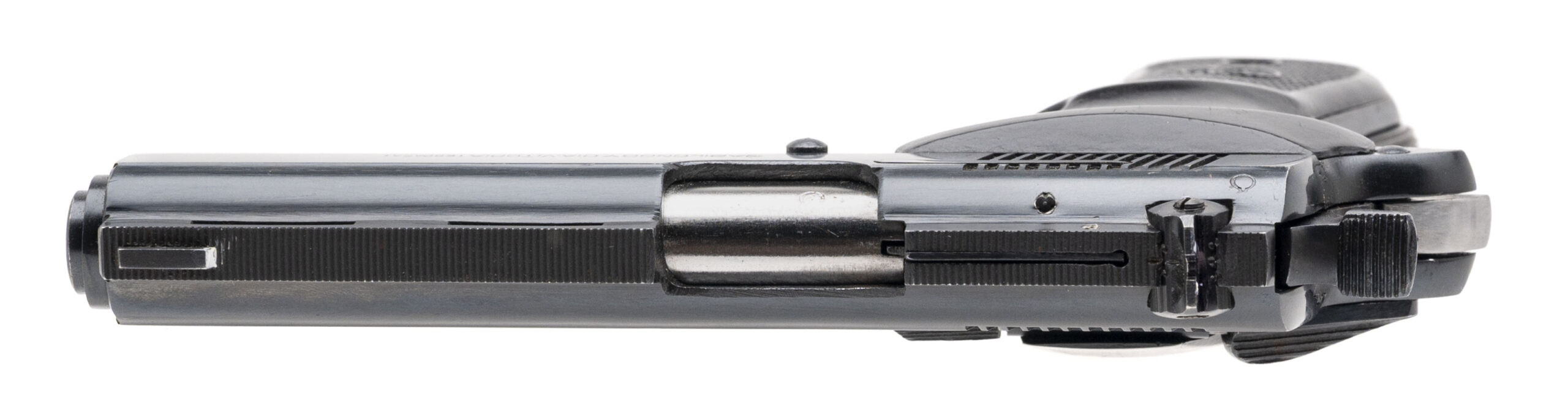 SN: 833592. Made in 1979, .32 ACP with a 3.75" vent rib barrel. Bore is excellent. Spanish made pistol imported by Stoeger with an adjustable rear sight, manual thumb-safety, blued finish, and checkered black plastic grips. Finish & grips show minor handling marks throughout. Overall condition is very good.