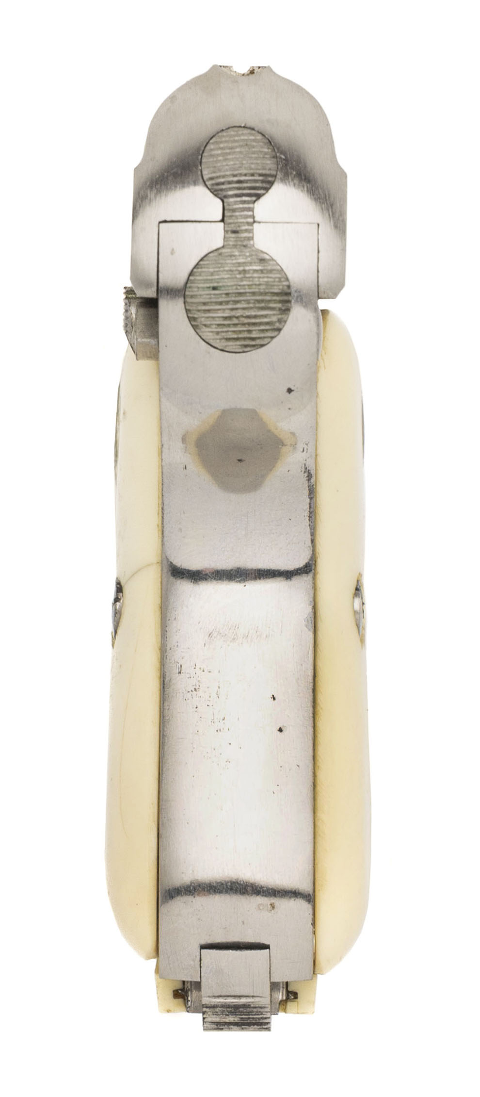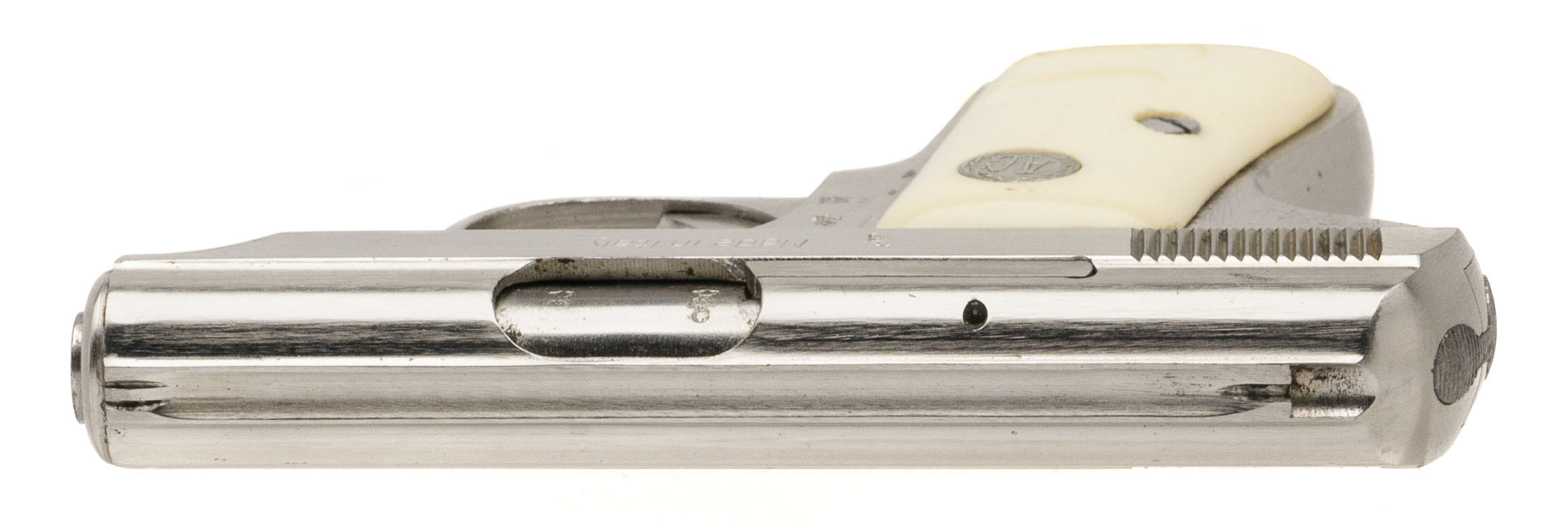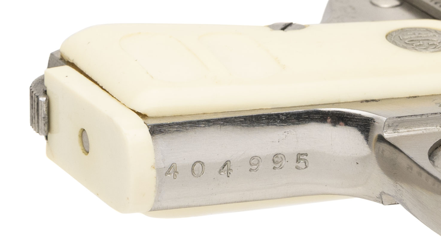 SN: 404995. 1960s vintage, .25 ACP with a 2" barrel. Bore is very good. Italian made stainless steel pocket pistol with manual thumb-safety, and faux ivory medallion grips. Metal & grips show wear & minor marks throughout. Overall condition is good.