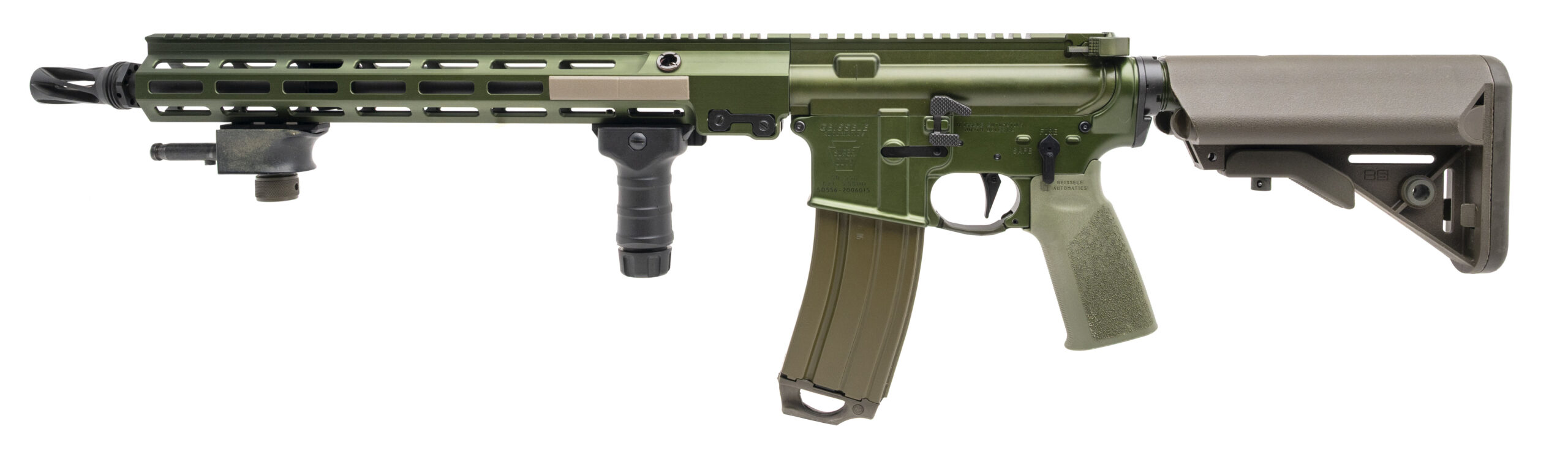 SN: SD556-2006015. Modern production, 5.56 NATO with an 16" barrel w/Huxwrx flash hider. Bore is bright with strong rifling. Semi-auto tactical rifle with a Tangodown vertical grip, flat-faced two stage Geissele trigger, and a bi-pod mount. Discontinued model with odg finish. Excellent condition overall. Comes with box and two extra magazine.