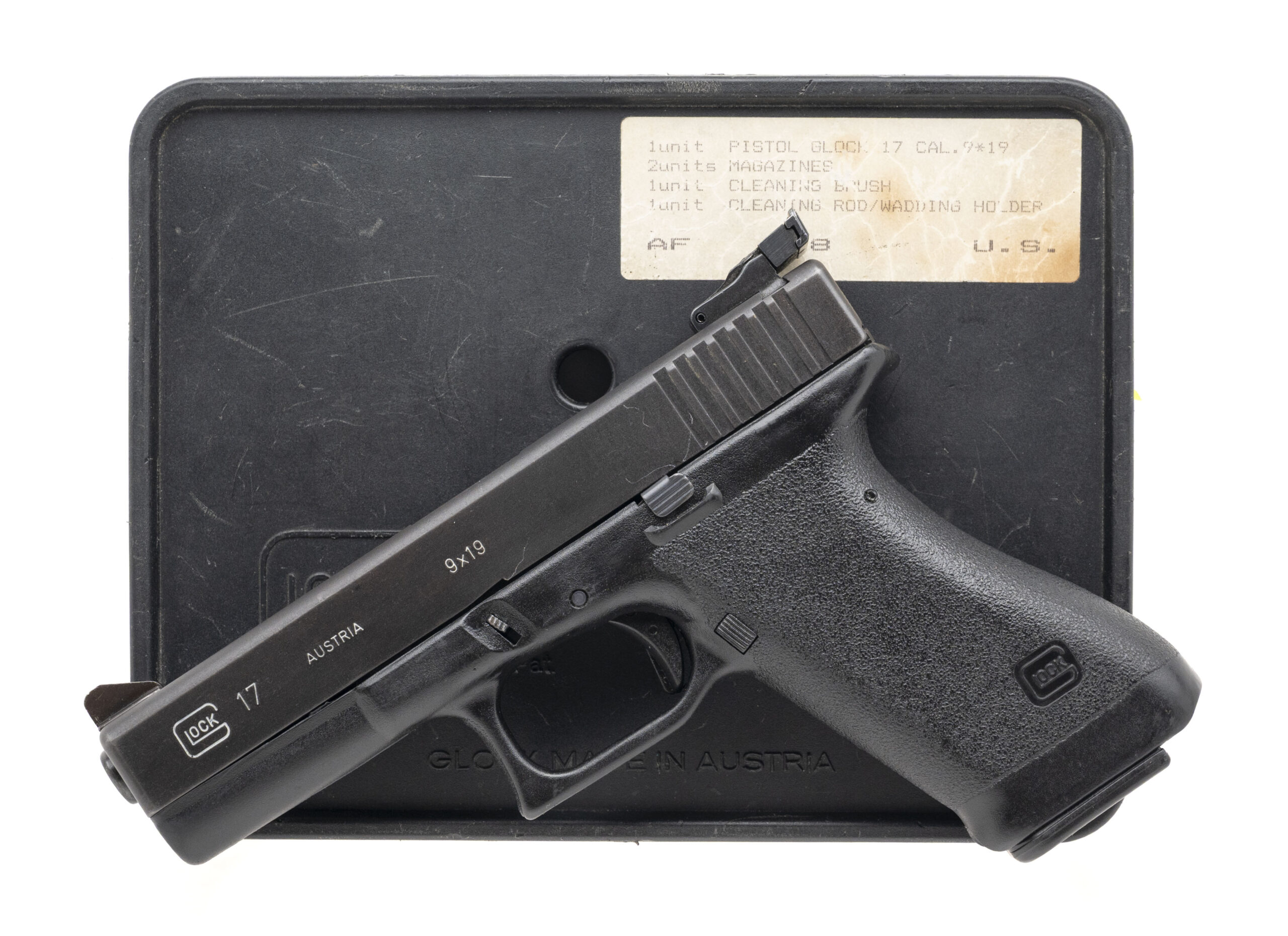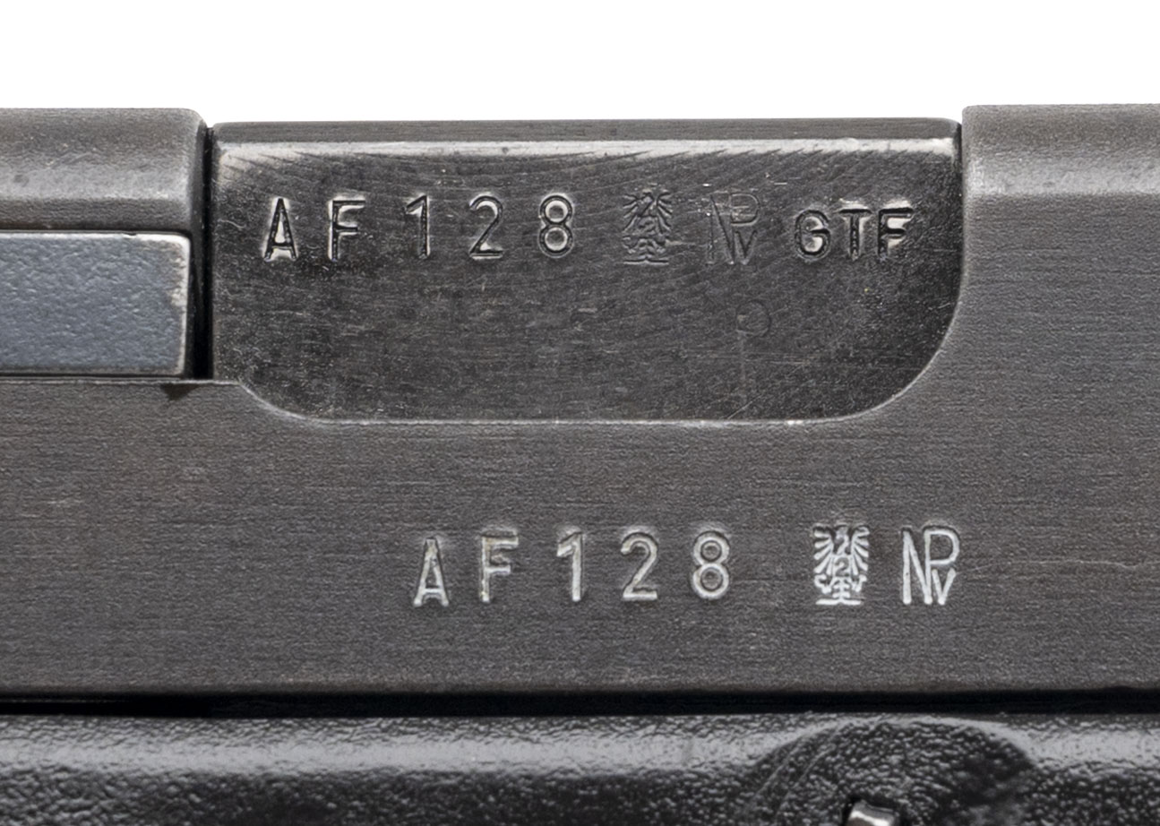 Serial number AF128US. Made in July 84 with a 4.49-inch barrel that has a bright bore with strong visible rifling. This early first generation G17 is equipped with a pencil barrel & it has pebble texturing on the grip frame. There are Austrian proof marks on the barrel & slide. The original factory rear sight has been replaced with a Millett Series 100 Adjustable Rear Sight assembly & the original front sight has been replaced with an oversized blade with an orange high visibility reflective insert. Overall condition is very good with only light handling & holster wear on the slide. Comes with an original numbers matching Glock "tupperware" case, cleaning rod, bore brush & an early U-notch 17-round Glock logo magazine that has no retention hole.