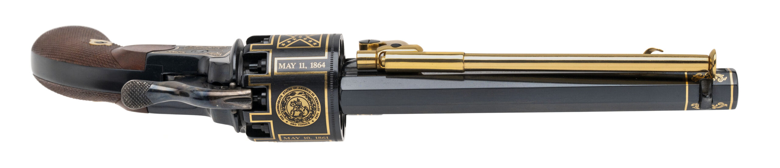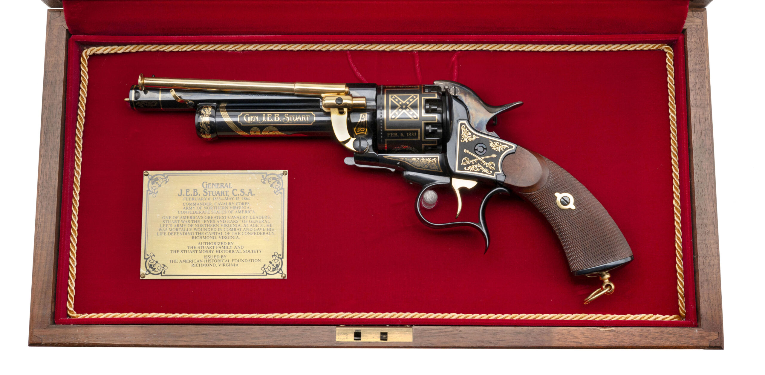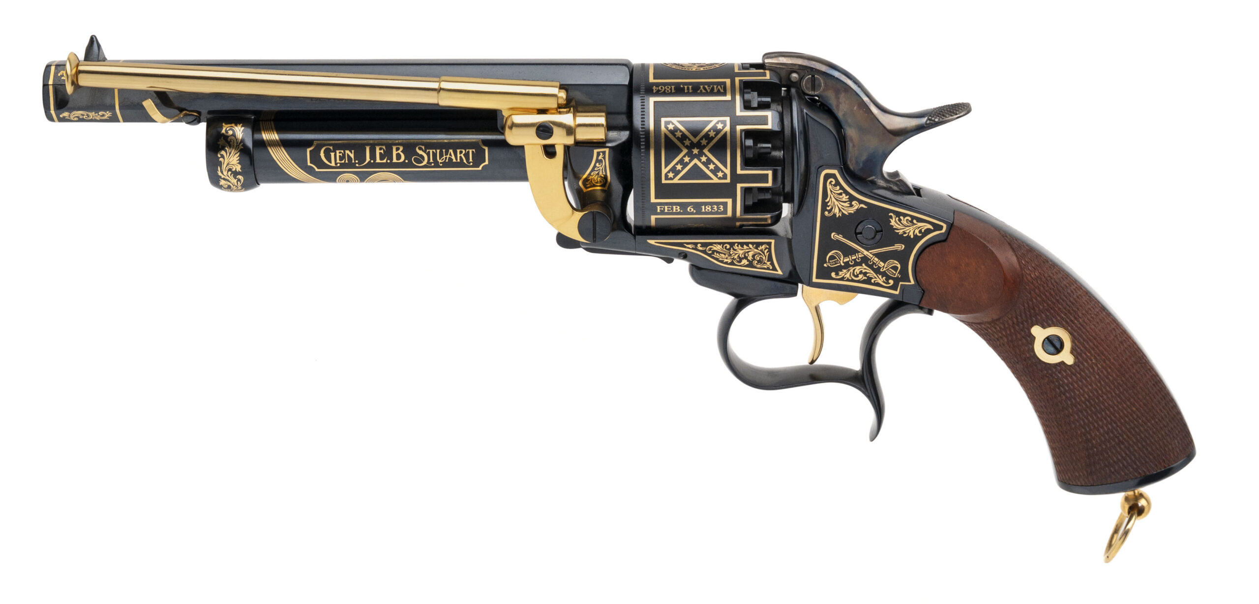 SN: 199 modern production commemorative Lemat black powder percussion revolver made as a tribute to Confederate Cavalry General J.E.B. Stuart. 6.75" 44 caliber octagon barrel over a 20 gauge black powder shotgun barrel. High polish blue with gold inlay and walnut grips in excellent condition. Comes in commemorative case. Dallas Location