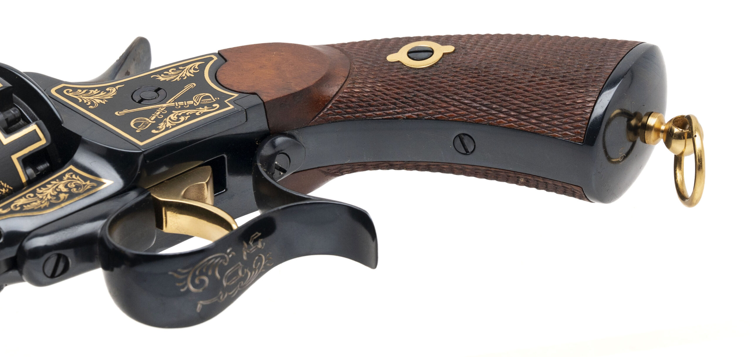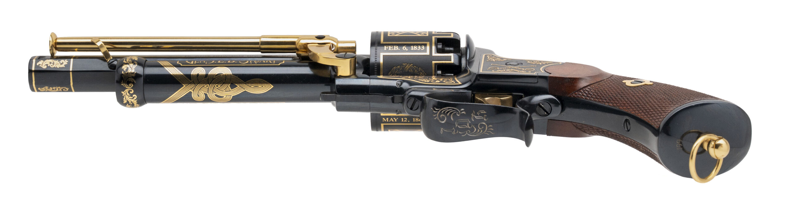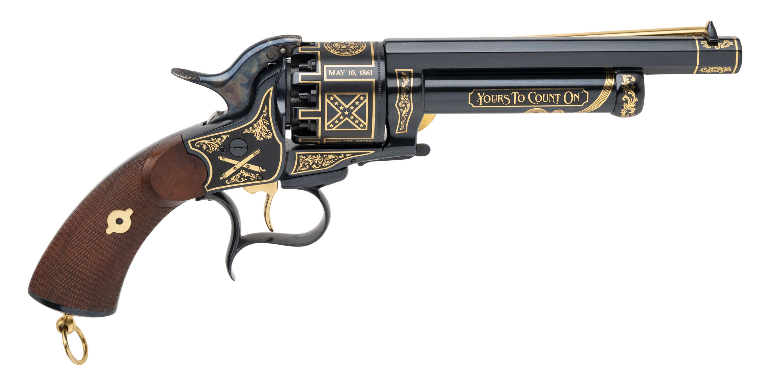 SN: 199 modern production commemorative Lemat black powder percussion revolver made as a tribute to Confederate Cavalry General J.E.B. Stuart. 6.75" 44 caliber octagon barrel over a 20 gauge black powder shotgun barrel. High polish blue with gold inlay and walnut grips in excellent condition. Comes in commemorative case. Dallas Location