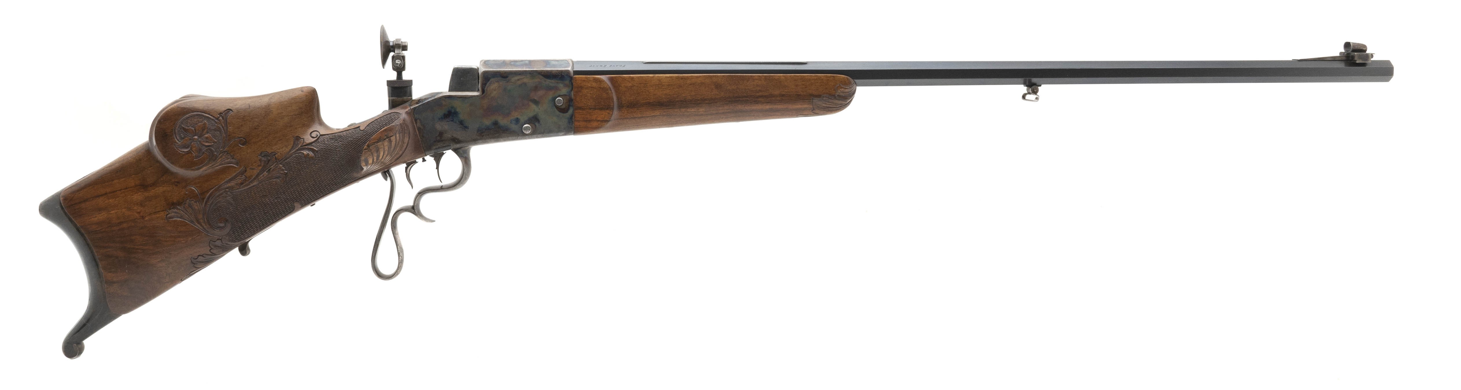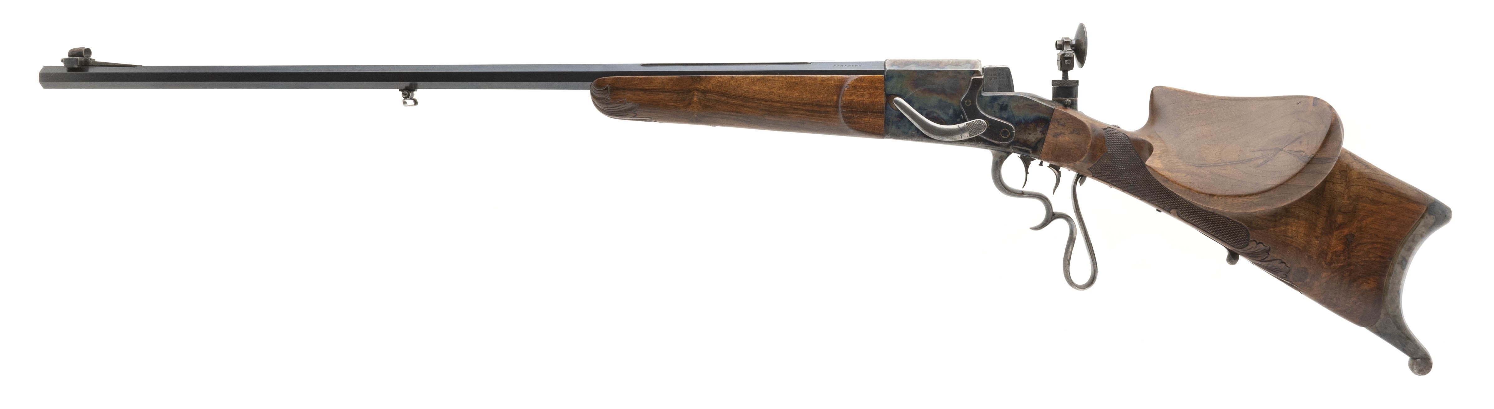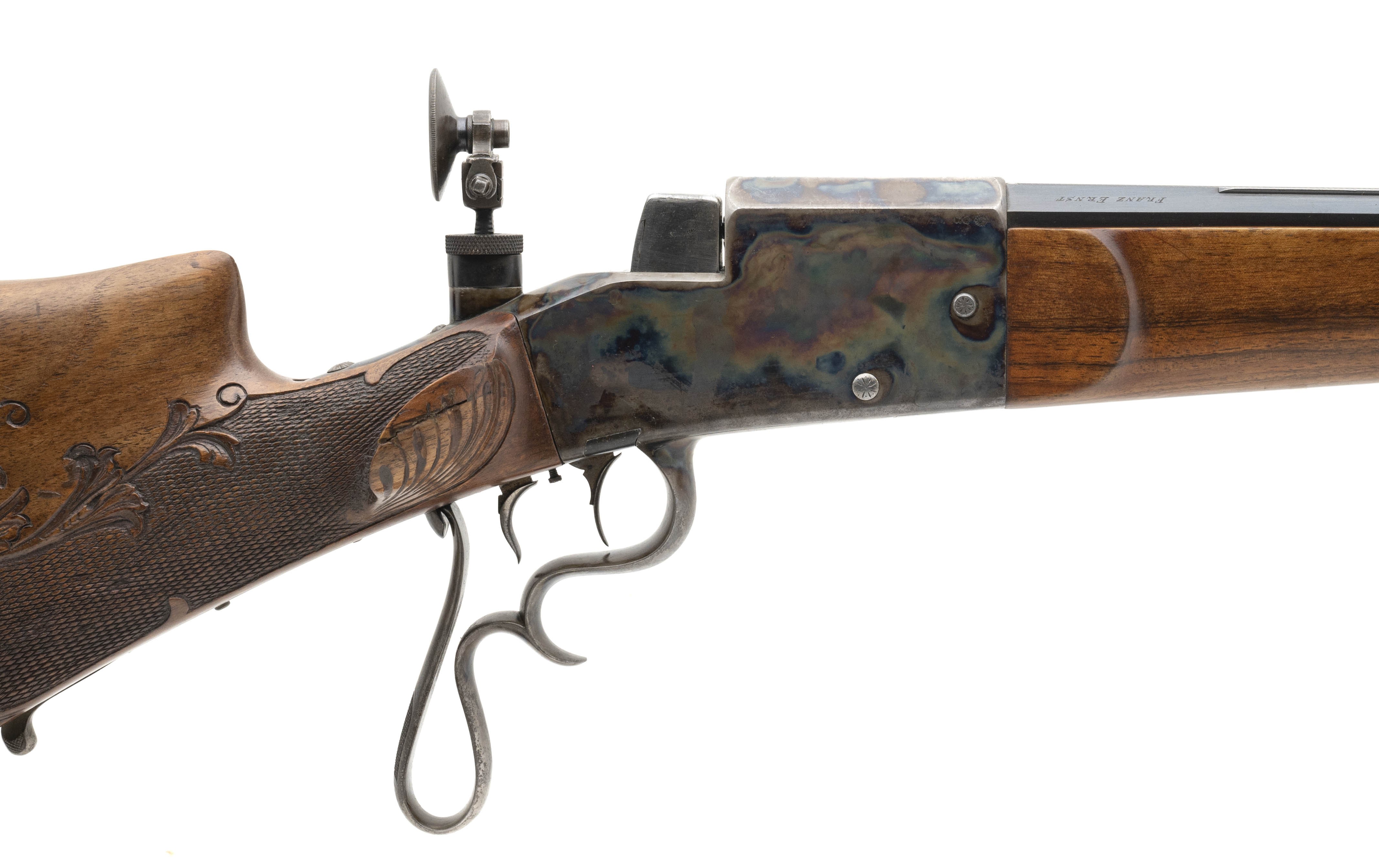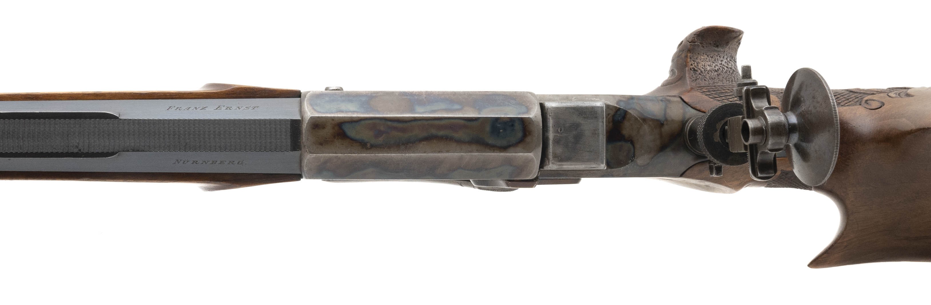 This very nice example of the German Schutzen rifle was made by the well known maker Franz Ernst of Nurnberg. The overall length is approx. 47". The 31.5" octagon 8X42Rmm caliber barrel has an excellent bore with bright, strong rifling. The top of the barrel is matted with a wider area for mounting telescopic sights. The right side flat at the receiver is marked FRANZ ERNST and the left is marked NURNBERG. The breech block is stamped on the left ORIGINAL over SYST-AYDT over 7045 (the serial number). The matted ramp front sight has ears with a small adjustable blade centered below them. The rear sight is an elaborate adjustable tang peep sight. The barrel has approx. 98% of its original blue finish. The massive color casehardened receiver has approx. 98% colors. The lever and other small parts including the buttplate have approx. 92% case colors. The buttstock is excellent with no cracks or chips. extensive carving and checkering, very large cheekpiece, opposite side thumbrest (with repaired side chip), and Swiss buttplate. The forearm, with carved flutes at the tip, is fine. The rifle is equipped a European size swivel on the barrel. The double set trigger action functions correctly. This very fine Franz Ernst Schutzen target rifle is ready for your single shot target rifle or Schutzen rifle collection.