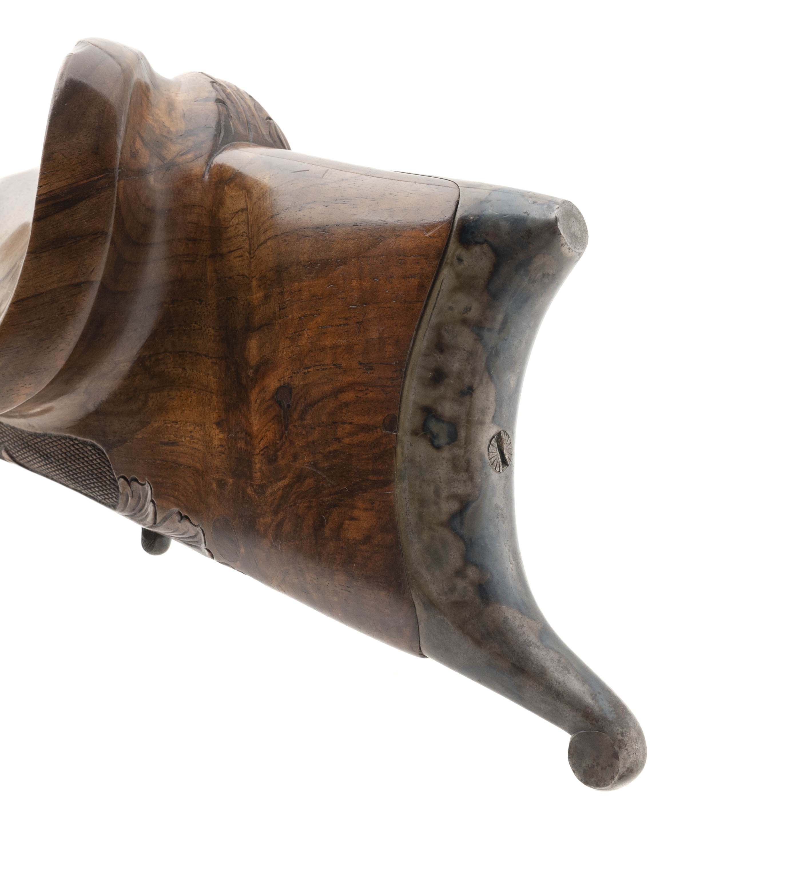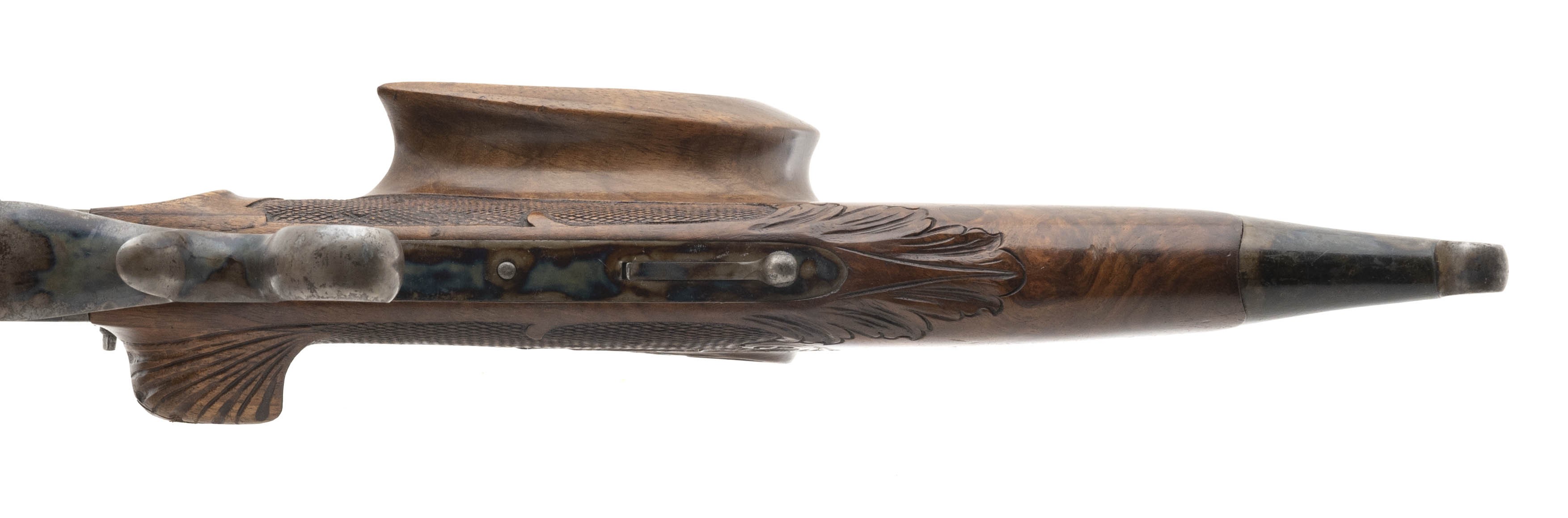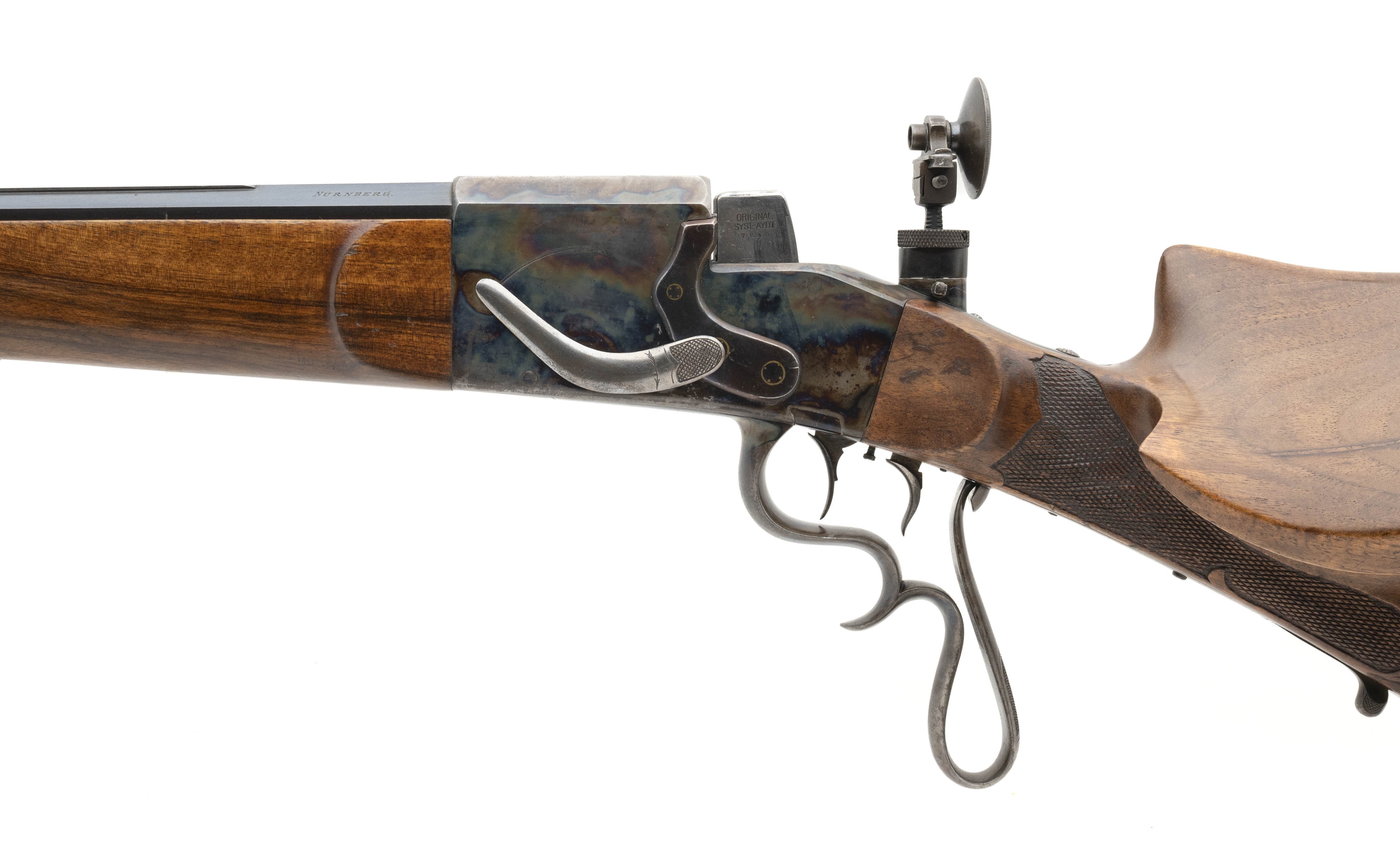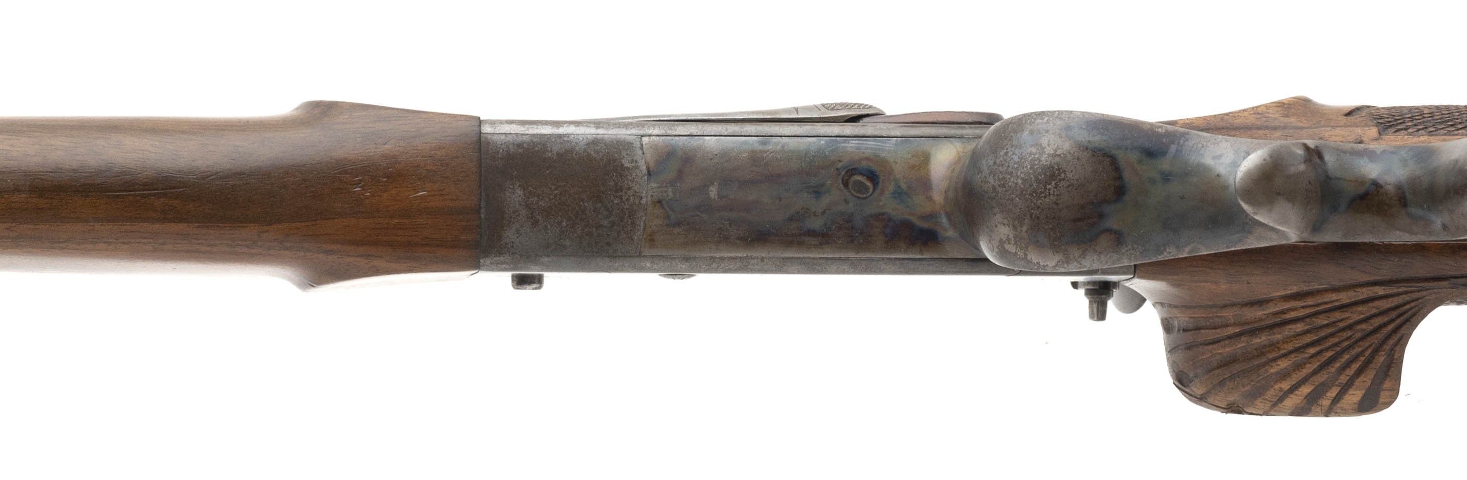 This very nice example of the German Schutzen rifle was made by the well known maker Franz Ernst of Nurnberg. The overall length is approx. 47". The 31.5" octagon 8X42Rmm caliber barrel has an excellent bore with bright, strong rifling. The top of the barrel is matted with a wider area for mounting telescopic sights. The right side flat at the receiver is marked FRANZ ERNST and the left is marked NURNBERG. The breech block is stamped on the left ORIGINAL over SYST-AYDT over 7045 (the serial number). The matted ramp front sight has ears with a small adjustable blade centered below them. The rear sight is an elaborate adjustable tang peep sight. The barrel has approx. 98% of its original blue finish. The massive color casehardened receiver has approx. 98% colors. The lever and other small parts including the buttplate have approx. 92% case colors. The buttstock is excellent with no cracks or chips. extensive carving and checkering, very large cheekpiece, opposite side thumbrest (with repaired side chip), and Swiss buttplate. The forearm, with carved flutes at the tip, is fine. The rifle is equipped a European size swivel on the barrel. The double set trigger action functions correctly. This very fine Franz Ernst Schutzen target rifle is ready for your single shot target rifle or Schutzen rifle collection.
