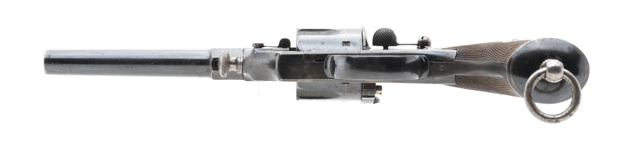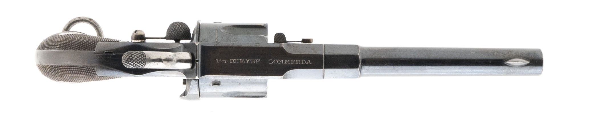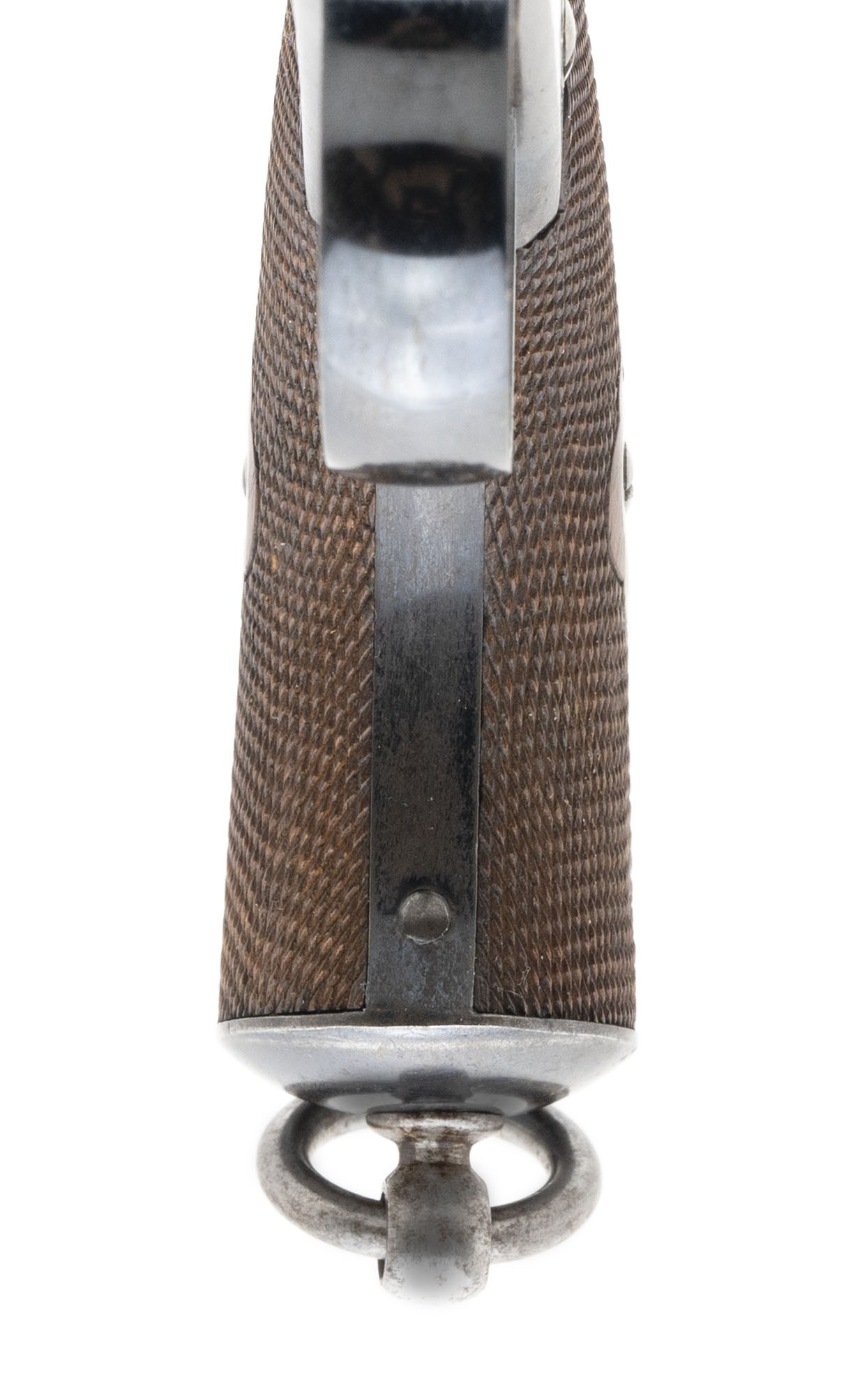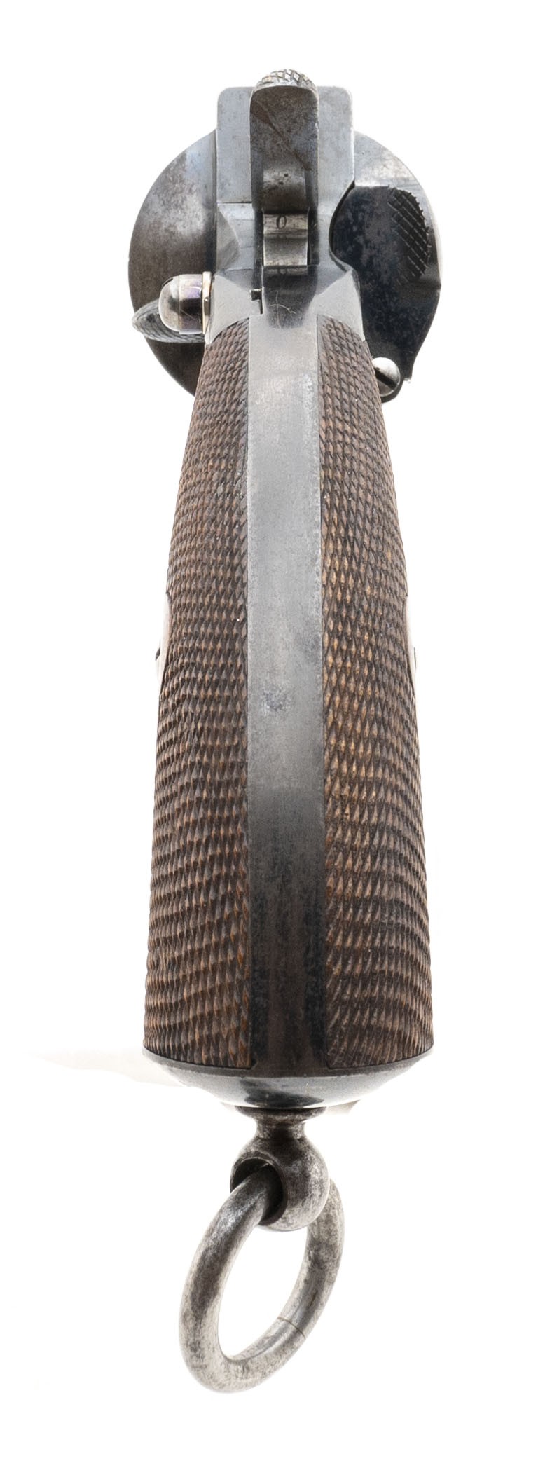 The Model 1879 Reichsrevolver, or Reichs-Commissions-Revolver Modell 1879, was used by the German army until it was replaced by the P08 Luger in 1908. We call this Model 1879 Reichsrevolver an Officer's model based on the low serial number of 99 (frame and cylinder), the shorter than standard barrel, the high polish blue finish, the finely checkered grips, and the silver-outlined manufacturer's name. It was manufactured by F. von Dreyse of Sommerda. Franz von Dreyse was the son of Johann Nicholas von Dreyse, the inventor of the German needle fire rifle. These revolvers are single action only and are fitted with a safety lever on the left side of the frame. It functions differently depending on the hammer position. If it is fully cocked, the safety locks it completely. If it is i n half-cock, the hammer is locked there but the cylinder can be loaded or removed. The Model 1879 also has a ring on the bottom of the grip so it can be secured to the uniform. The 6" round 10.55X26R mm centerfire barrel has an excellent bor with bright, strong rifling. The revolver retains approx. 95% blue with fading in a few areas. The top strap is marked in silver inlay F.V. DREYSE SOMMERDA. The finely checkered grips are excellent with no cracks or chips and very light wear. The action functions correctly. This is a great example of a rarely seen Dreyse revolver. It is the only one of this type we have seen.