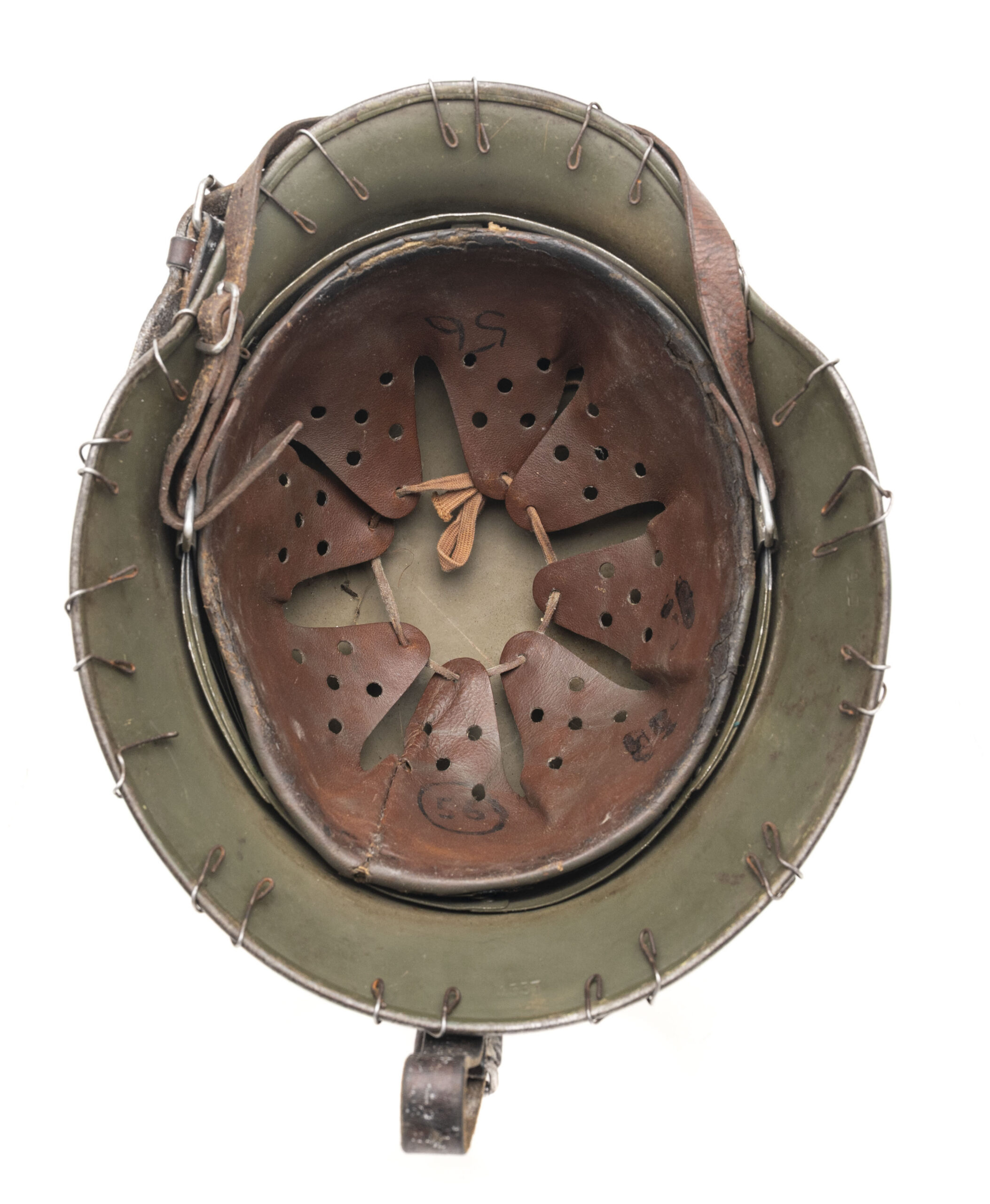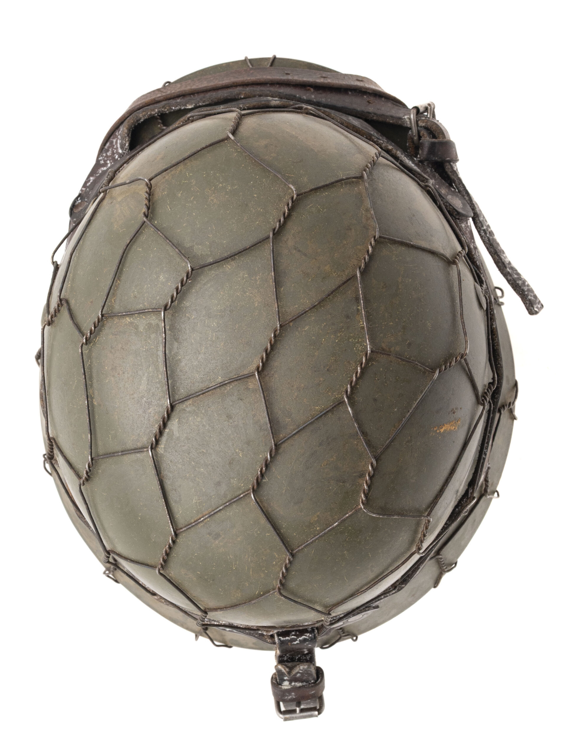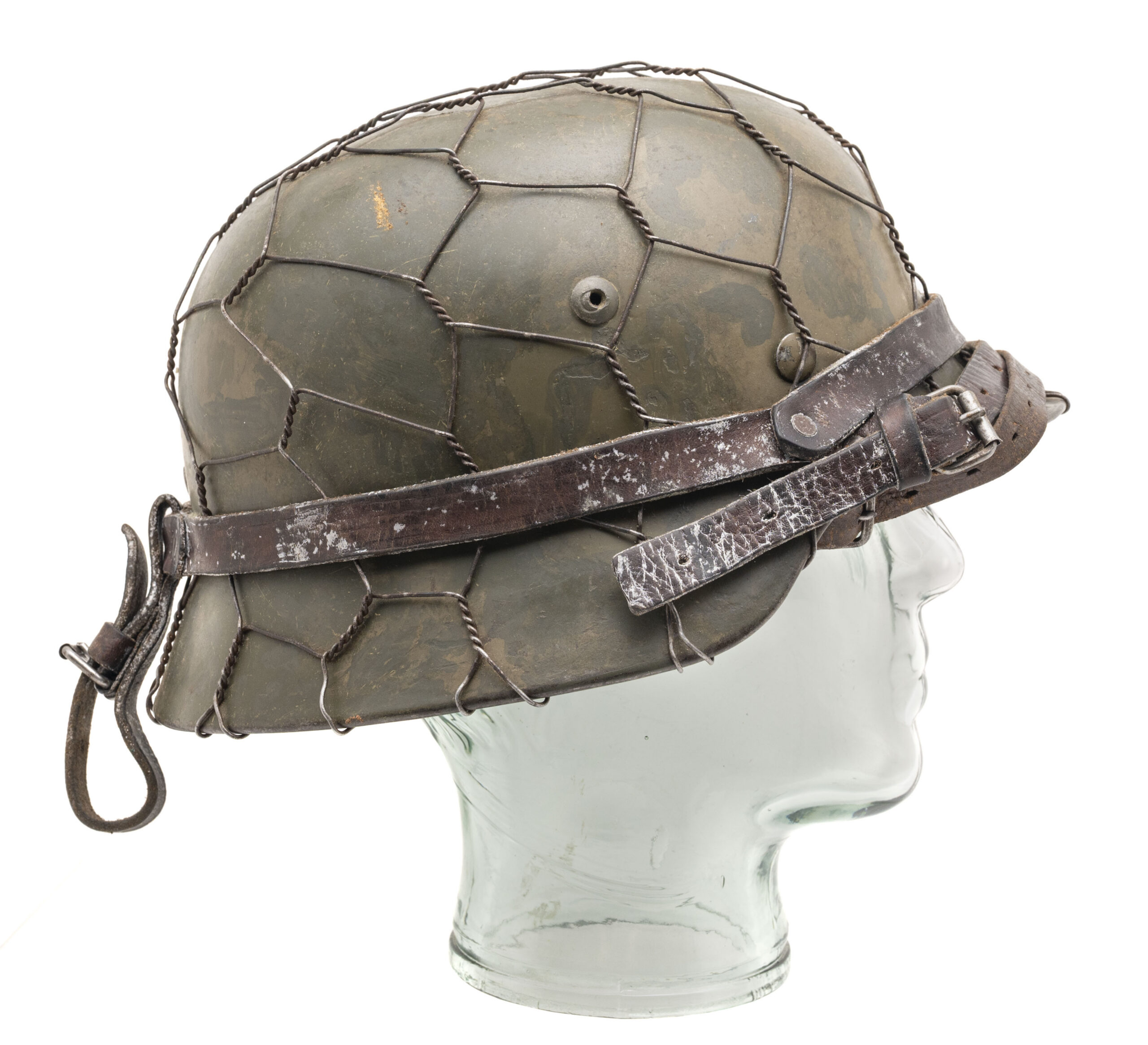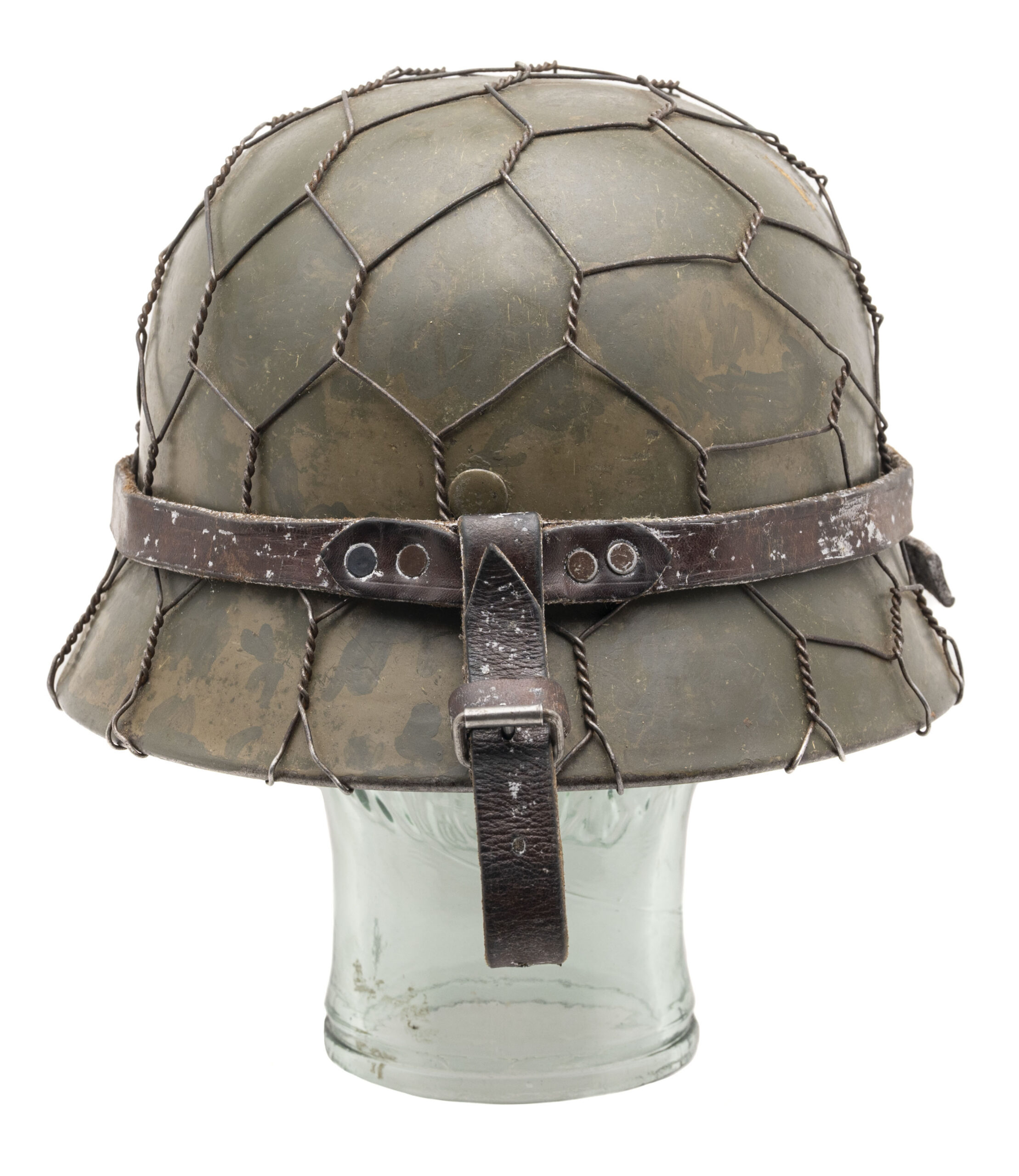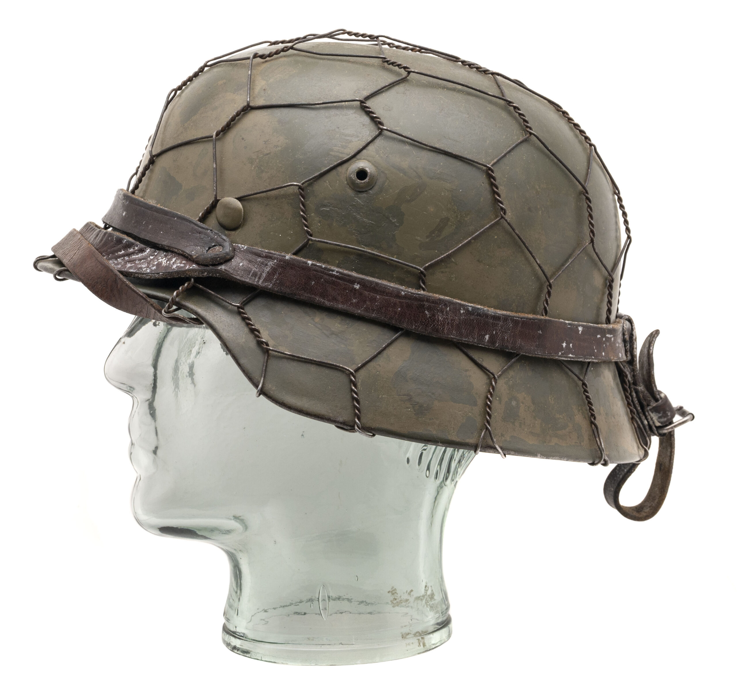 This German World War II M35 rolled-edge "Stalhelm" (steel helmet) was made by Eisenhüttenwerke in Thale, Saxony-Anhalt in 1940. The shell size is 64 & the liner size is 56. A layer of dull greenish camouflage has been applied to exterior & it is covered by fitted chicken wire. Shell, liner & liner chinstraps are in very good condition.