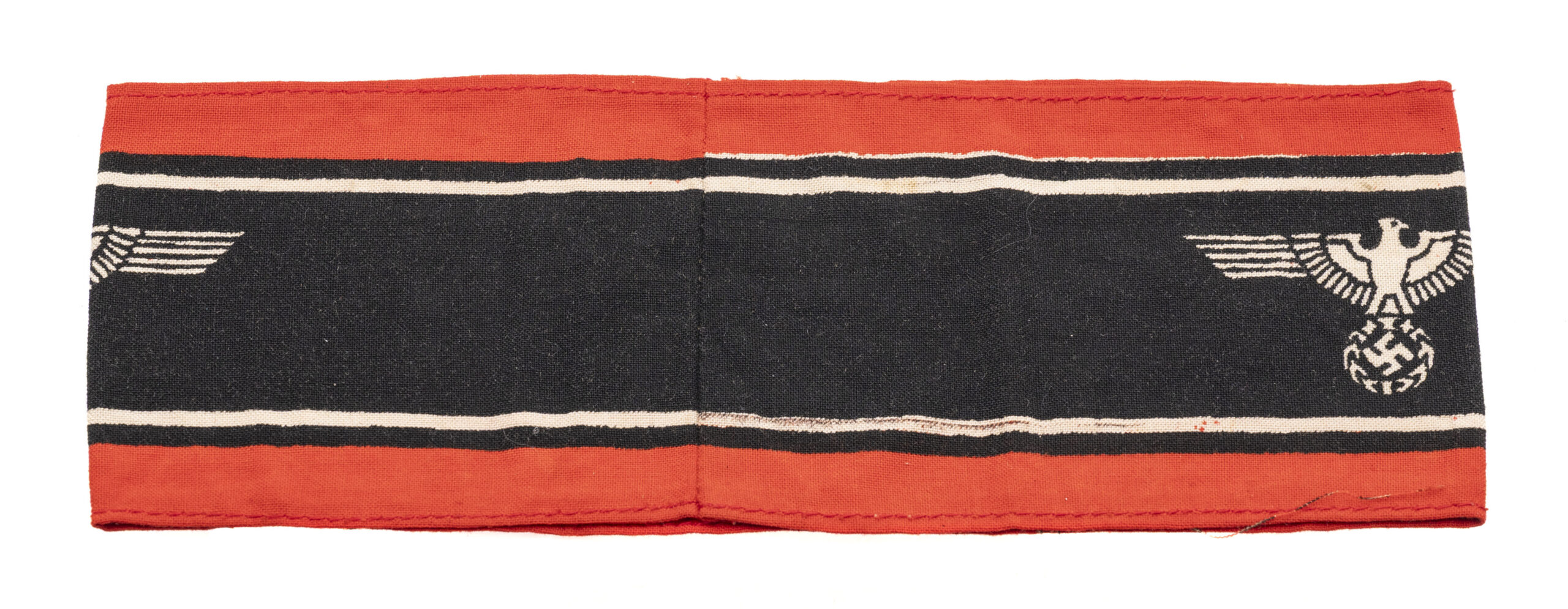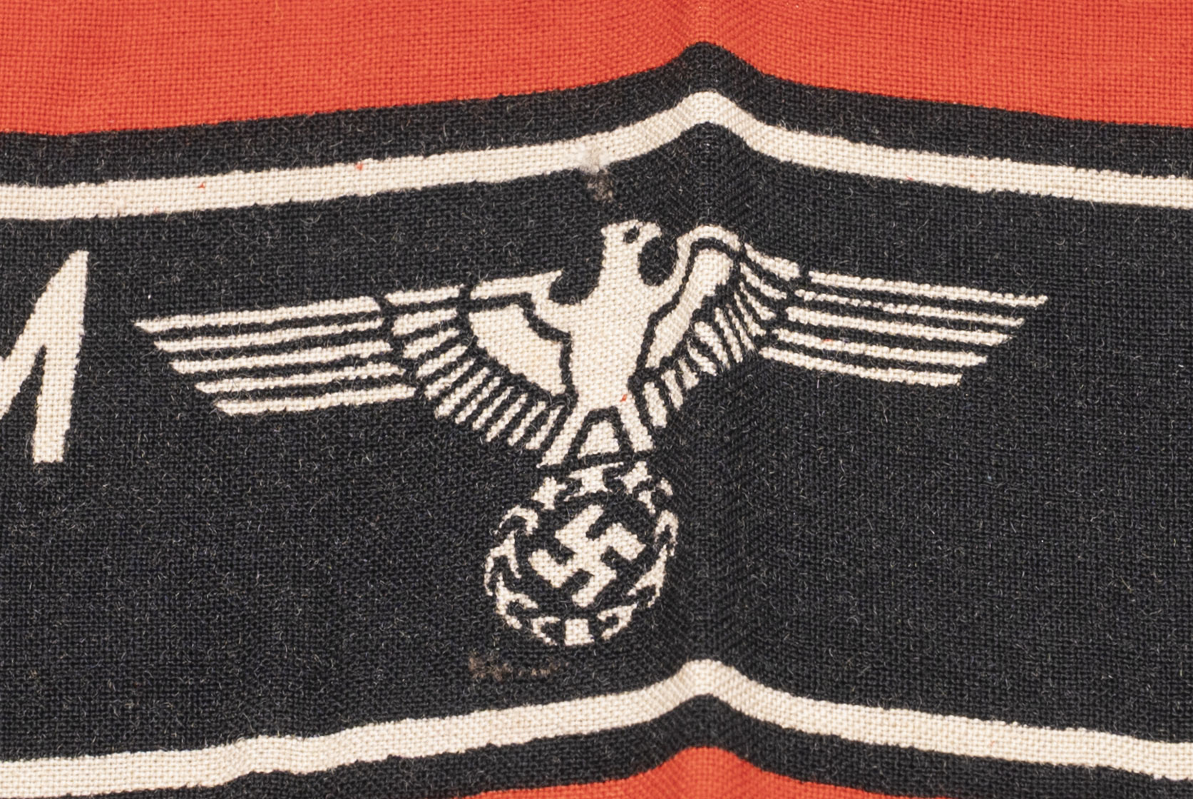 The Deutscher Volksturm ("People's Assault Troops") was a National Socialist paramilitary militia, created during the closing months of the Second World War by decree of Adolf Hitler on October 18, 1944. All the able-bodied men between the ages of 16 and 60 were called to arms with the hopes that they would change the outcome of the war. This type of armband was issued to members as a means of identifying them as they often wore civilian clothes instead of uniforms. It was made using the "BeVo" (Bandfabrik Ewald Vorsteher) machine-weaving technique & it is in unissued condition.