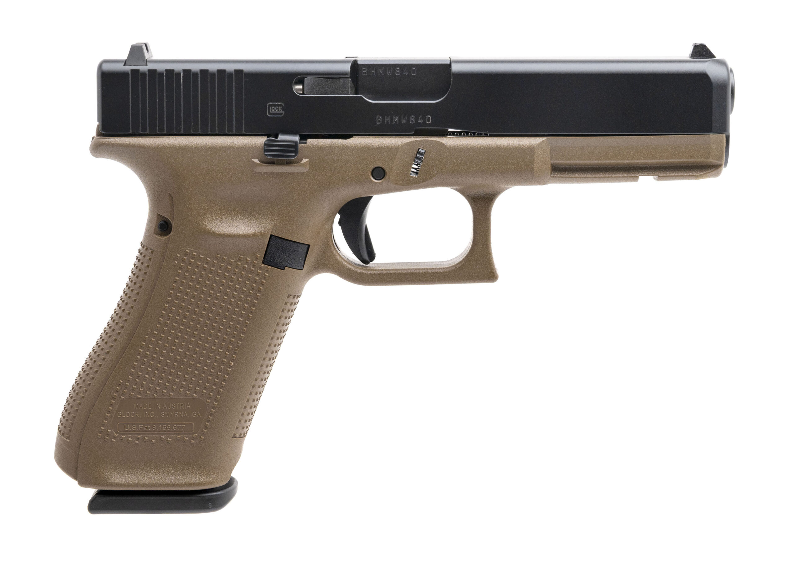 SN: BHMW840. Modern production, 9mm with a 4.49" marksman barrel. Bore is bright with strong rifling. Desirable two-tone full size striker fired pistol with FDE polymer frame. Excellent condition with case and two extra magazines.