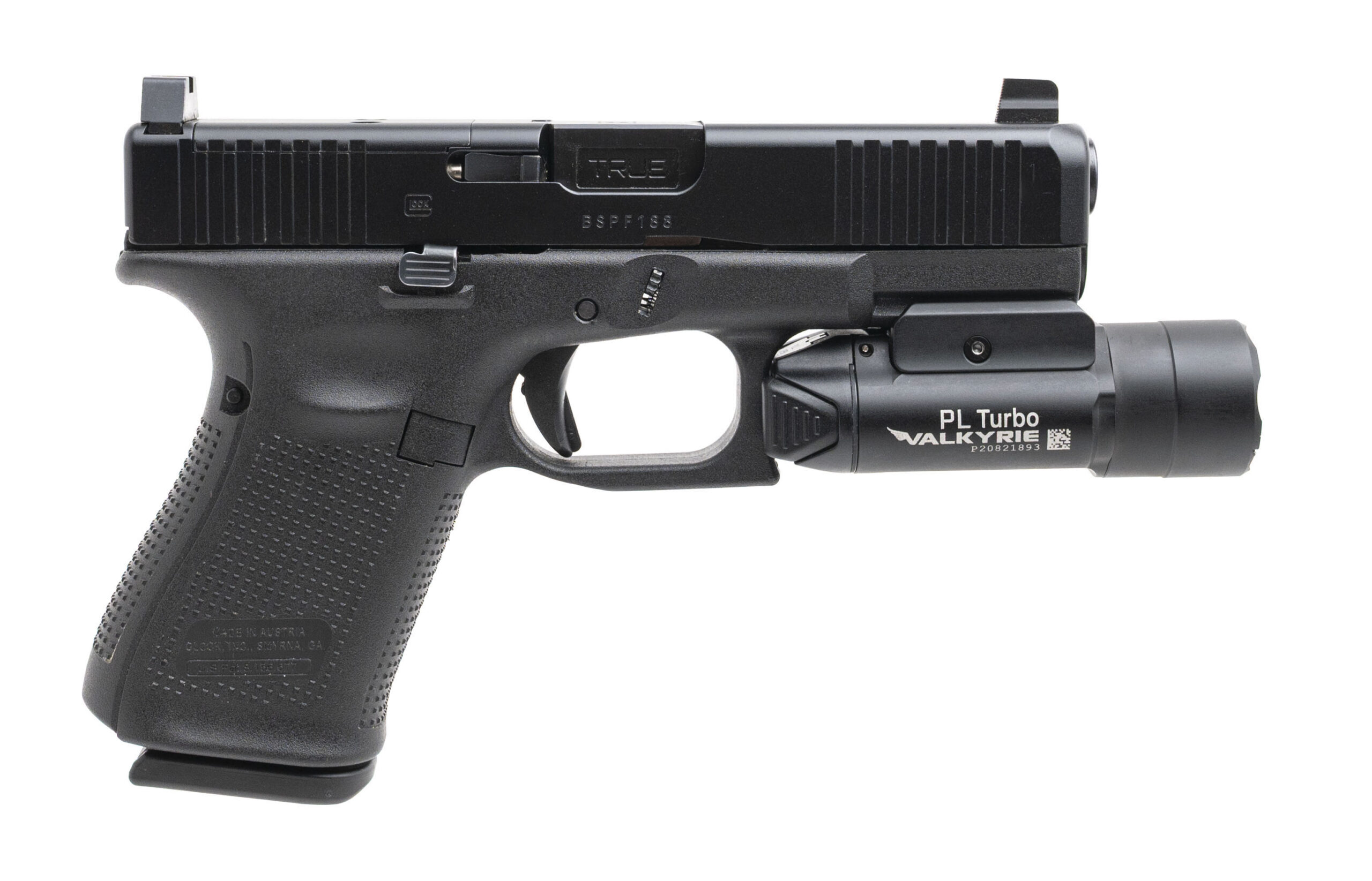 SN: BSPF188. Modern production, 9mm with a 4.02" TRUE barrel. Bore is very good. Compact striker fired pistol with an optic cut, blacked out suppressor height sights, and an Olight PL Turbo Valkyrie flashlight. Frame has been shaved down by the trigger guard. Excellent condition overall. Comes with case, optic adapter plate kit, OEM barrel, and an extra magazine.