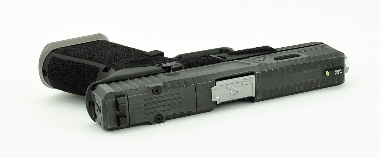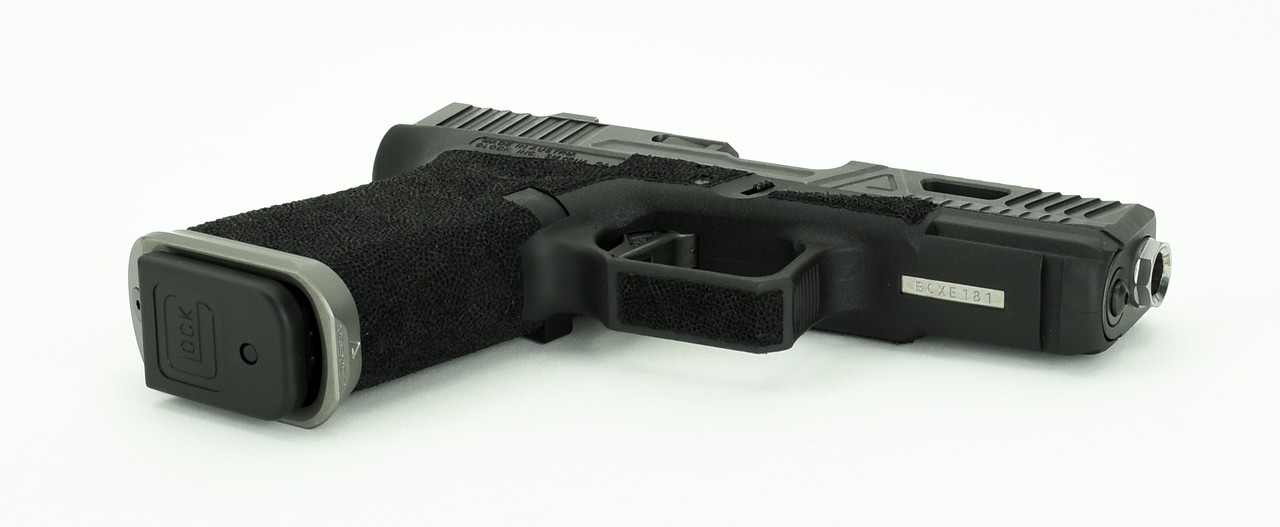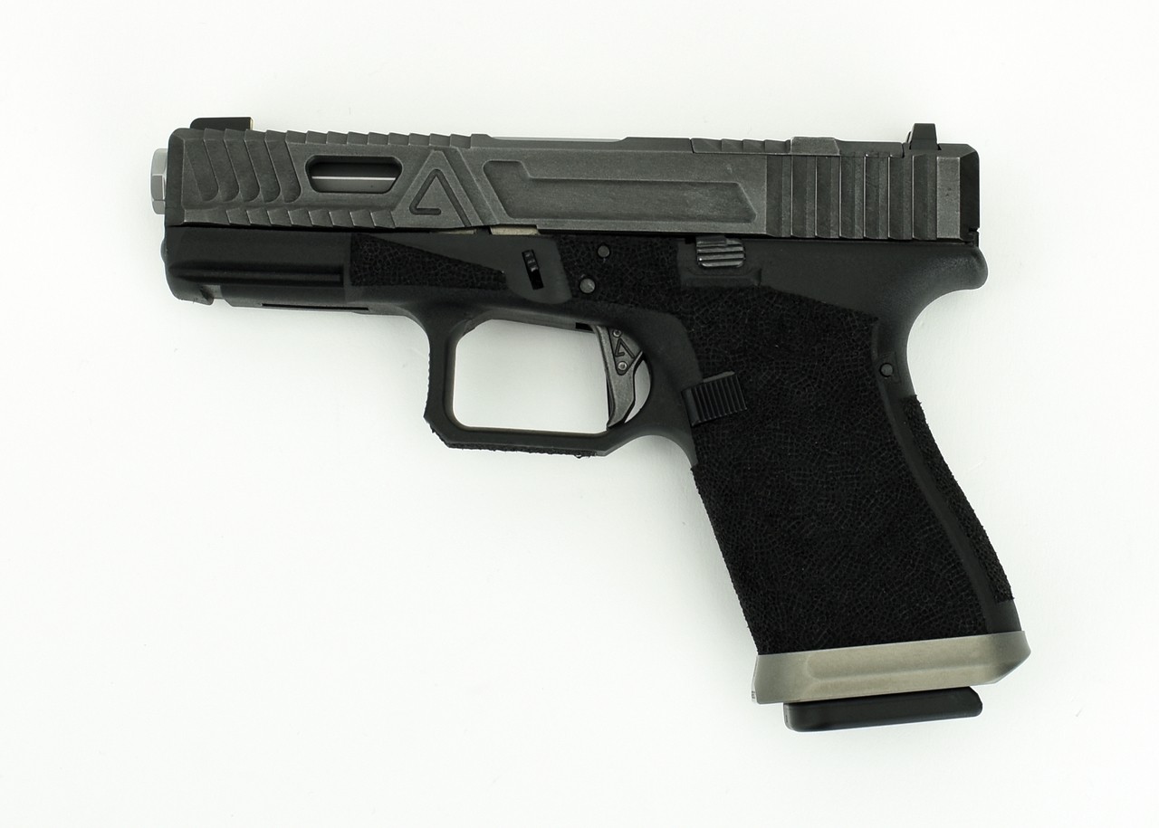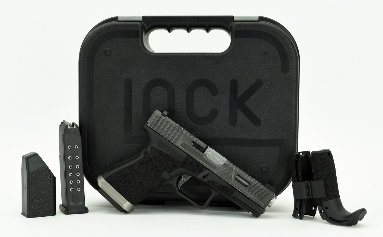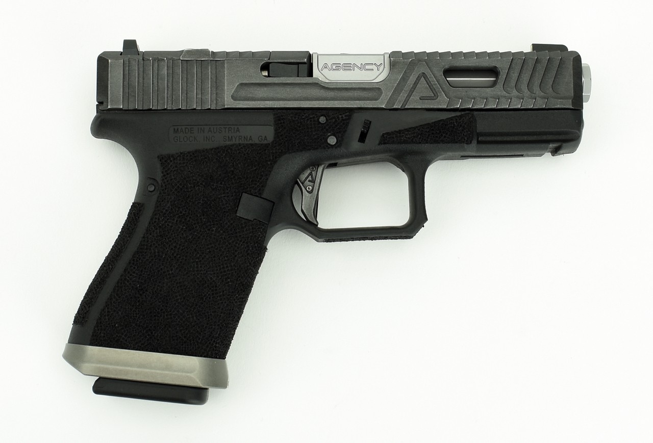Glock 19 Generation 4 9mm caliber pistol. Agency Arms “Bone-Saw” with slide reduction cuts, gray wartorn finish, night sights, upgraded trigger, RMR cut, Magwell and grip stippling in excellent condition with box and extra magazine. An outstanding custom job.