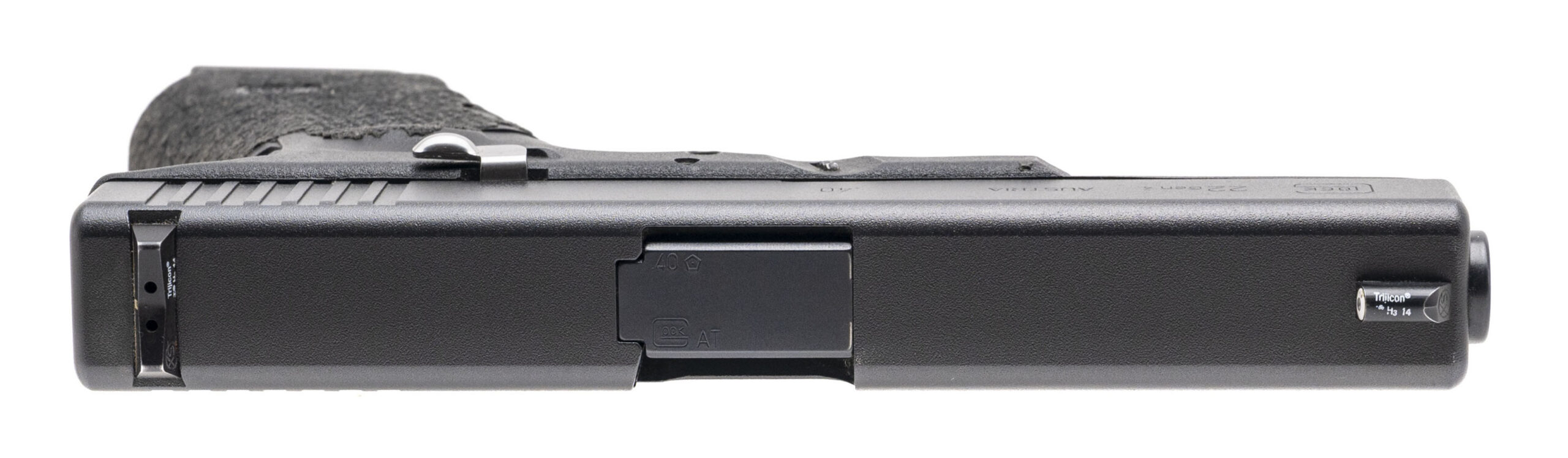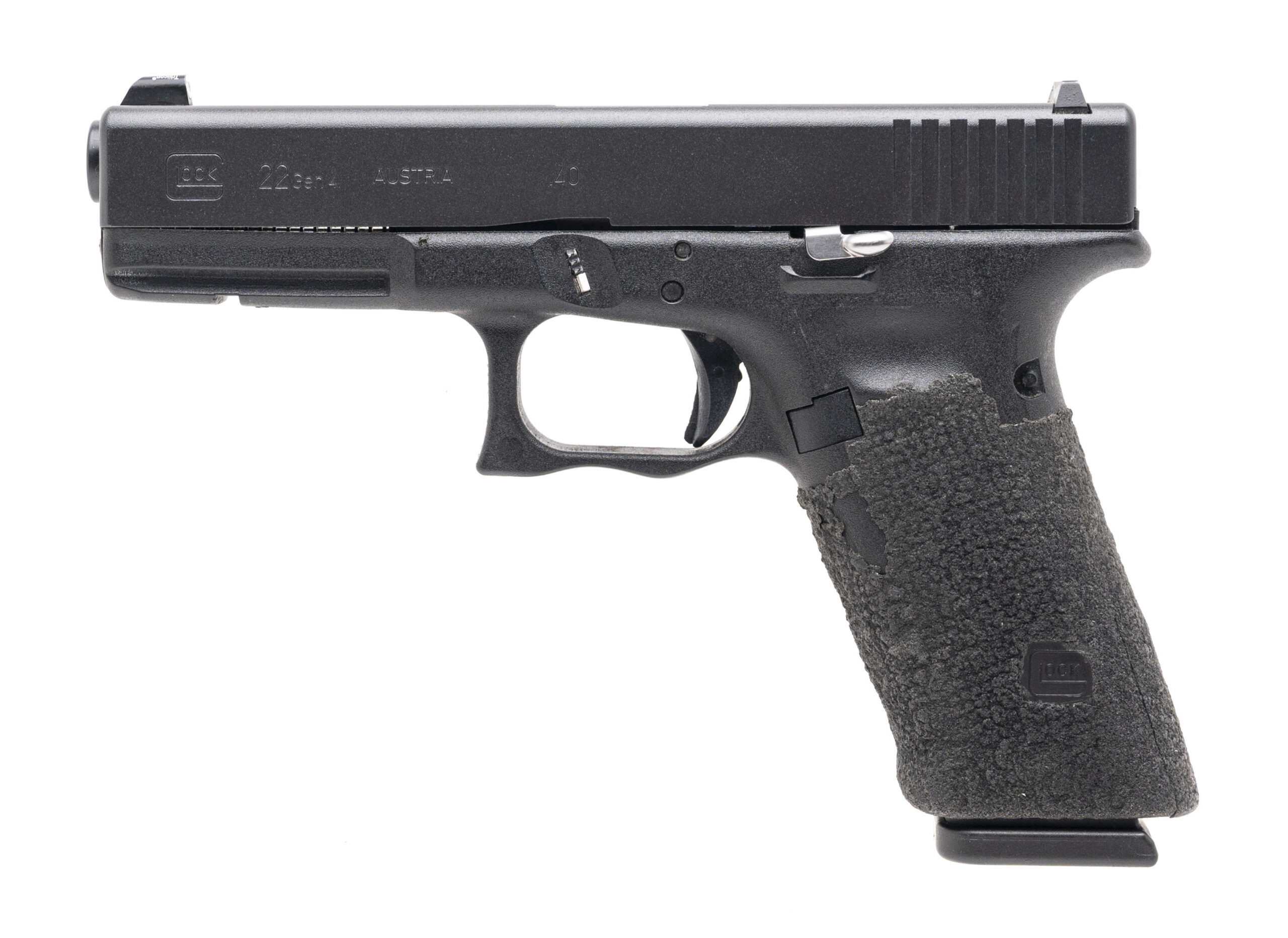 SN: TCT314. Modern production, .40 Cal with a 4.49" barrel. Bore is very good. Full size striker fired pistol with night sights and a right hand palm swell. The grip tape on the the frame is worn but the overall condition is very good.