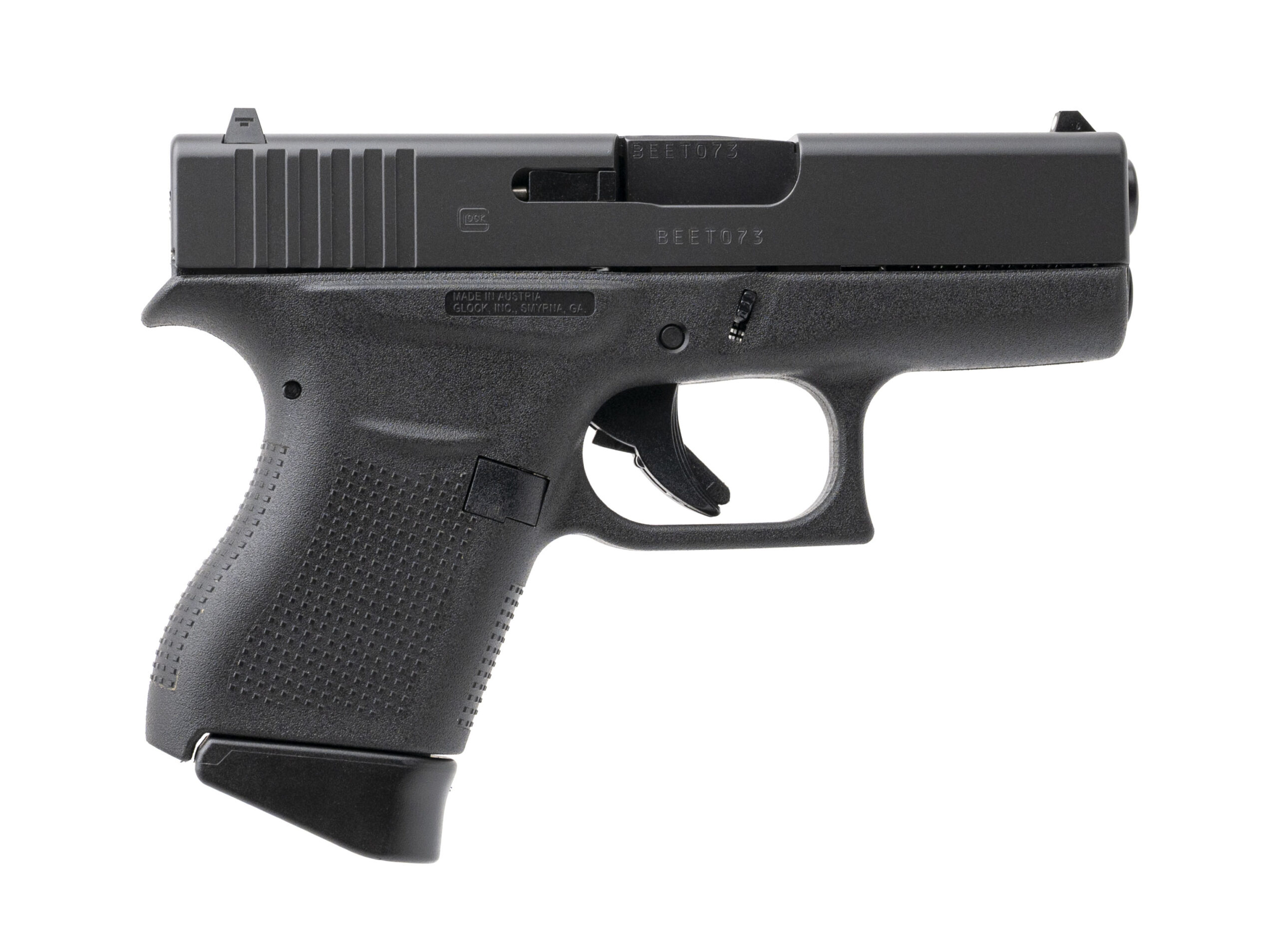 SN: BEET073. Modern production, 9mm with a 3.41" barrel. Bore is excellent. Sub-compact striker-fired pistol with matte black finish, and black polymer frame. Overall condition is excellent. Includes an additional magazine, and original case.