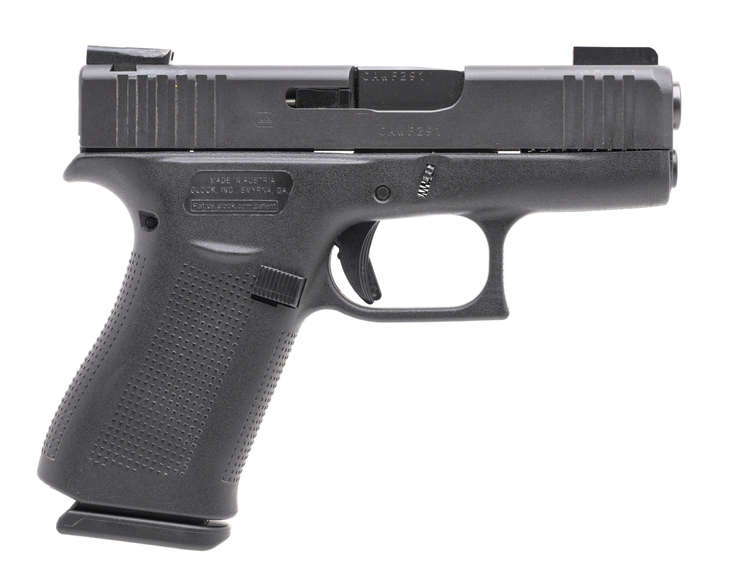 SN: CAWF291. Modern production, 9mm with a 3.41" barrel. Bore is excellent. Sub-compact striker-fired polymer frame pistol with tritium fiber-optic front & rear sights, and matte black finish. Finish shows light holster wear. Overall condition is very good. Includes 2 additional magazines, IWB holster, and original case.