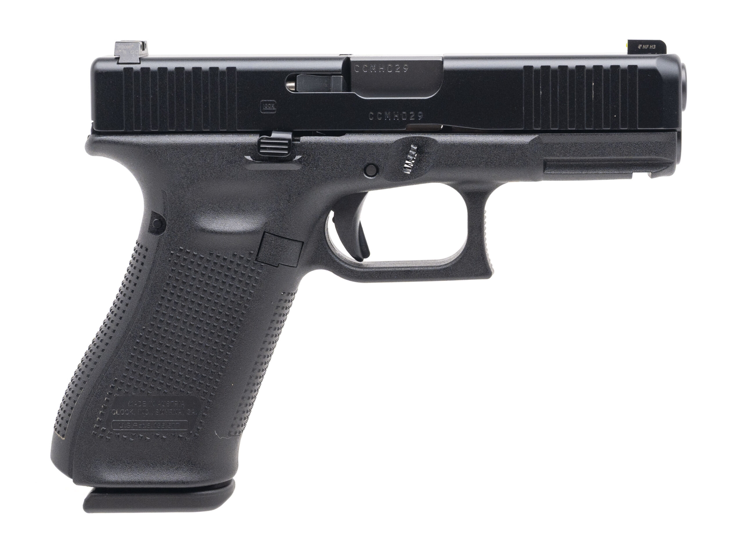 SN: CCMH029. Modern production, 9mm with a 4.02" marksman barrel. Bore is excellent. Compact polymer frame striker-fired pistol with front & rear night sights, ambidextrous slide release, accessory rail, and nDLC finish. Overall condition is excellent. Includes 2 additional magazines, and original case.