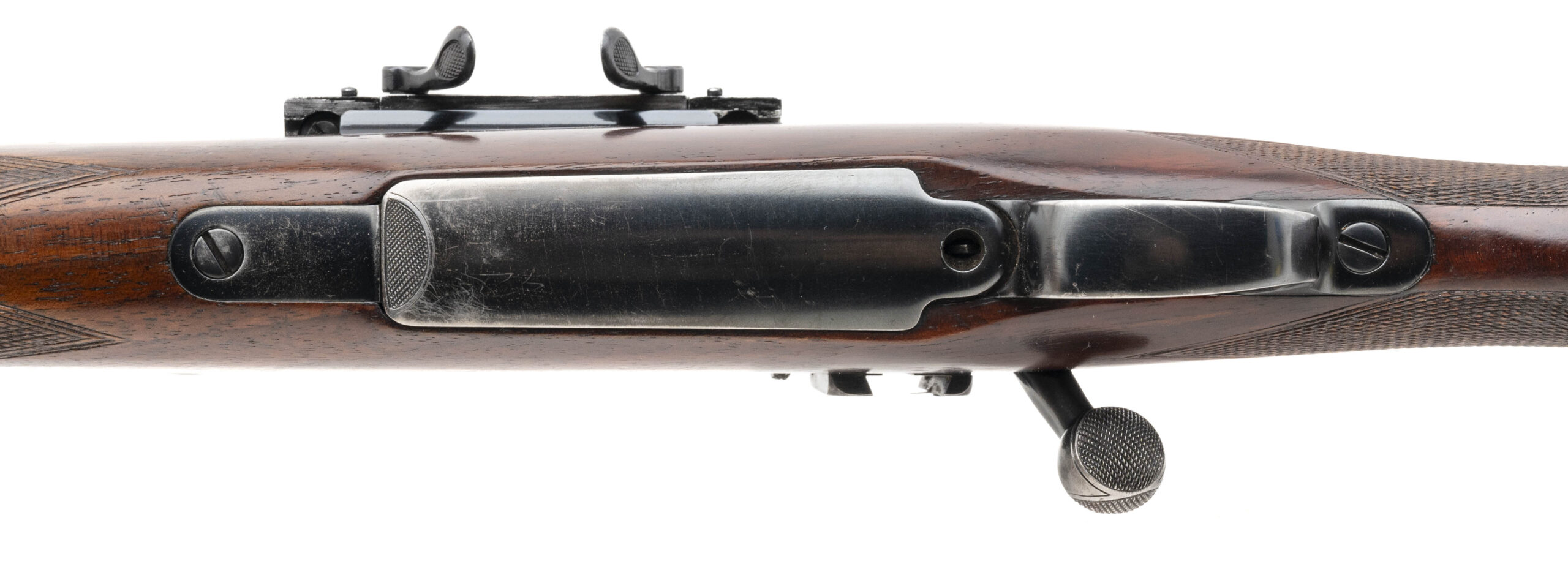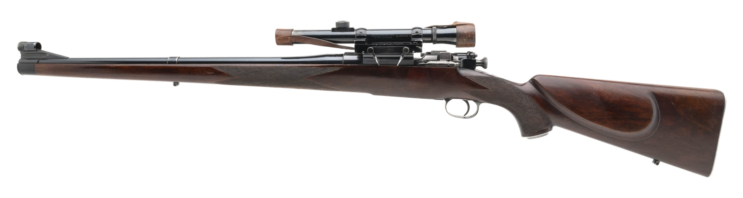 G&H serial # 2171 built in 1955 in Manhattan NY on a Springfield 1903 action with a 21” barrel and a Mannlicher style stock. This rifle features the classic Griffin & Howe detachable side mount with a Lyman Alaskan 2 ½ power scope with post reticle. Designed to allow the option of a scope or iron sights it is also fitted with a Lyman 48 peep sight that can be used when the scope is removed. The barrel is fitted with a barrel band sling swivel and a banded ramp front sight. The metal is in very good condition with normal wear and a small blemish on the back of the scope mount. The hand-made stock is in very good condition with minimal handling marks and has a classic G&H style cheek piece with a Winchester model 70 style checkered butt plate, steel grip cap with engraved screw and an ebony forend tip. A unique configuration as most G&H rifles in 30-06 had 24” barrels and are seldom seen with Mannlicher style stocks.