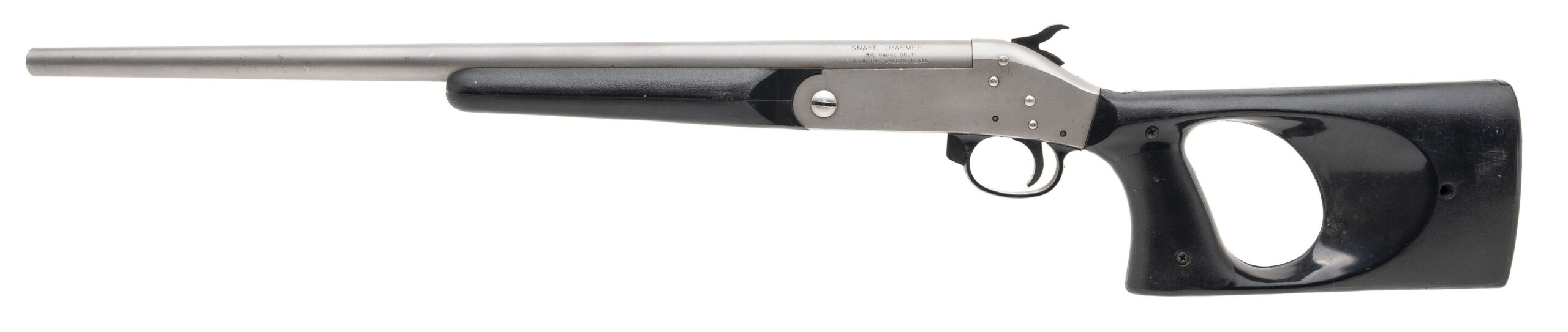 SN: 71026. 1970s vintage, .410 gauge with an 18" barrel. Bore is excellent. Stainless steel single-shot break action shotgun with a black molded polymer forend & pistol grip stock with a 9" LOP. Metal shows moderate marks throughout. Overall condition is very good.