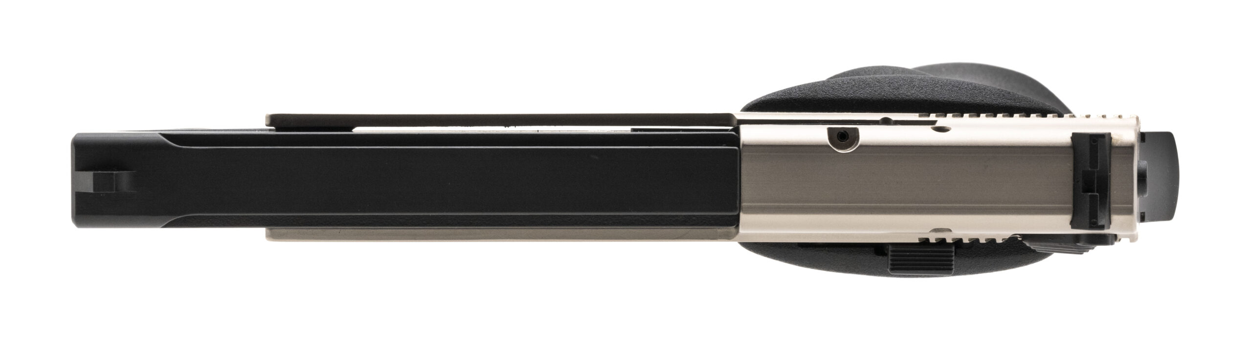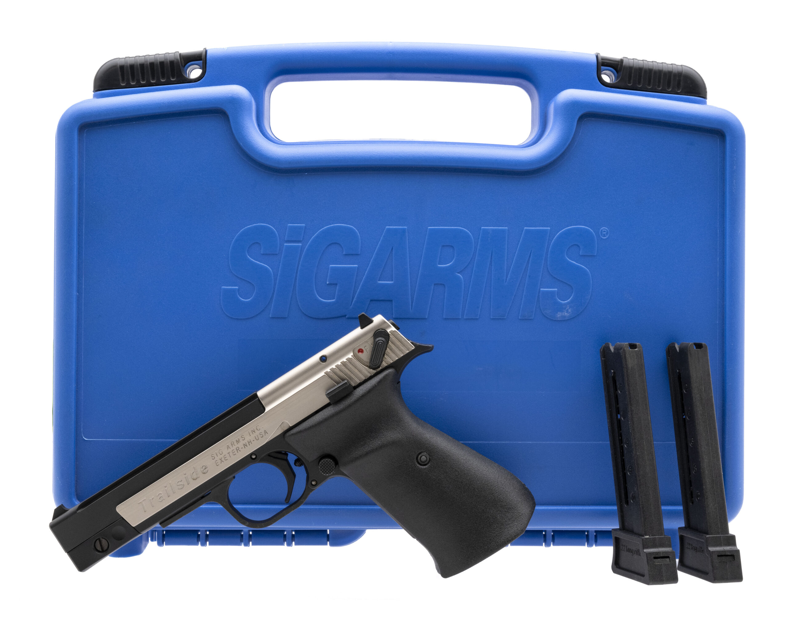 SN: E0053903. Made circa early 2000s, .22LR with a 4.5" barrel. Bore is bright with strong rifling. Sig Sauer manufactured rimfire pistol with thumb safety. Two tone finish is in excellent condition. Polymer grips are in excellent condition. Comes with case and two extra magazines.