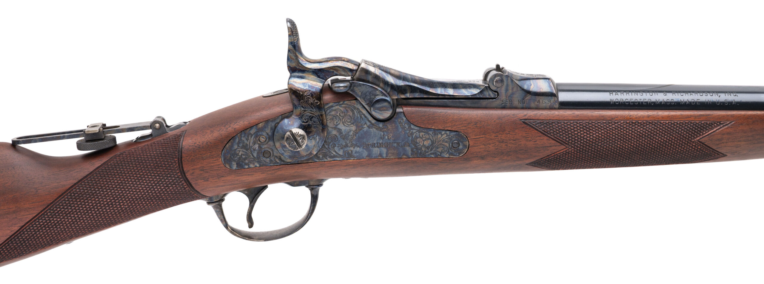 SN: 4694 modern production 45-70 single shot trap door rifle with a 26" blued round barrel, case hardened action, lock plate, trigger guard and curved steel butt plate with a tangent sight in a checkered walnut stock with brass plaque on the side in near excellent overall condition with an excellent bore.