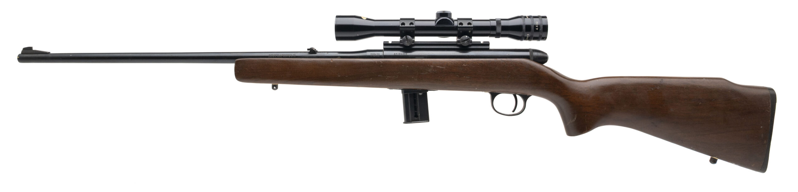 SN: AX491282 made circa late 1970's-early 80's. Semi-auto H&R rifle chambered in 22 WMRF with a 22" round barrel with ramped front sight, dovetailed flip up rear sight, detachable 10 round magazine and Kassnar 4x32 scope in a walnut stock with the factory butt plate. Some light patina and handling marks but overall in very good condition for the age with an excellent bore.