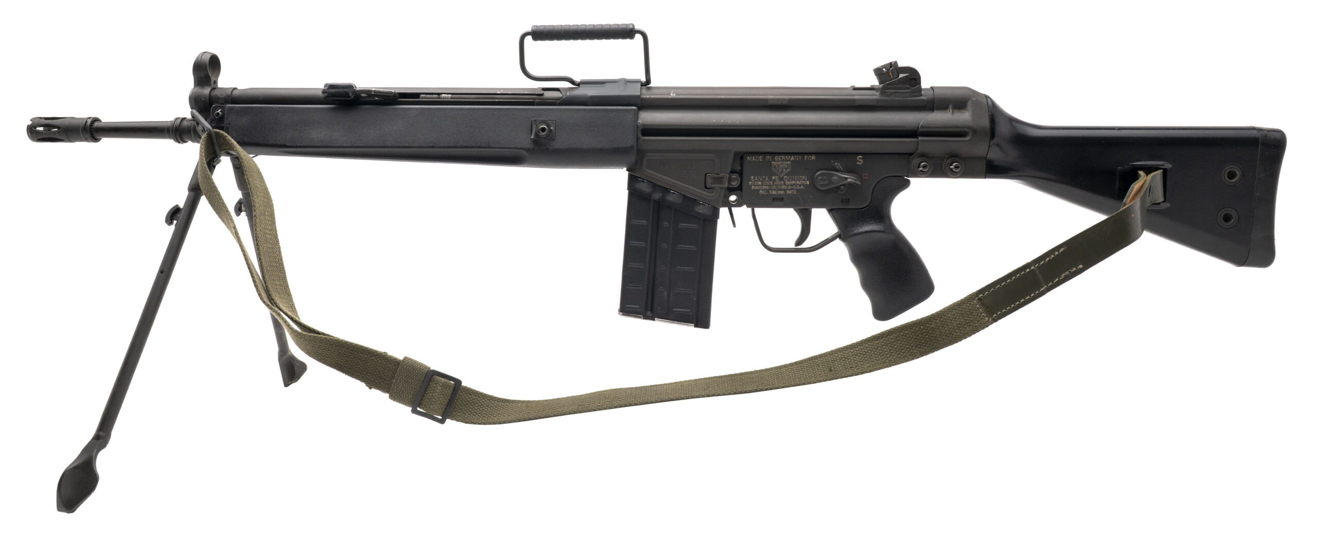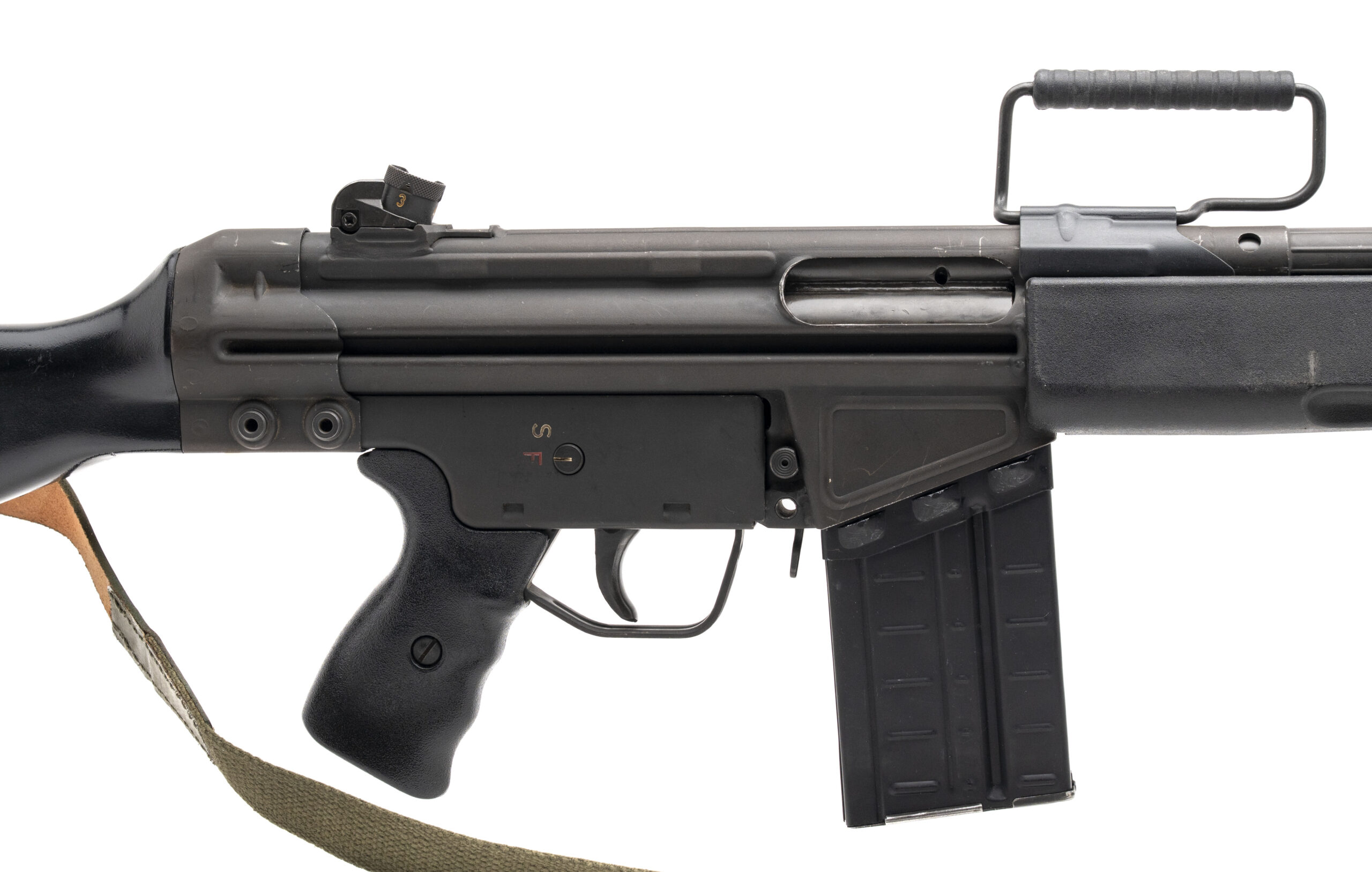 SN: 10B929 made in Germany in1966. A very rare semi-automatic version of the G3 made for civilian sales and Bundeswehr reservists to practice with. Less than 1350 were produced and less than 400 were imported into the US. This is a scarce early 1966 variation with the push pin hole in the receiver, seldom seen as most were used as hosts for full auto conversions prior to the May 1986 Machine gun ban. Overall in very good condition with some light handling marks. Comes with 20rd magazine and original sling.