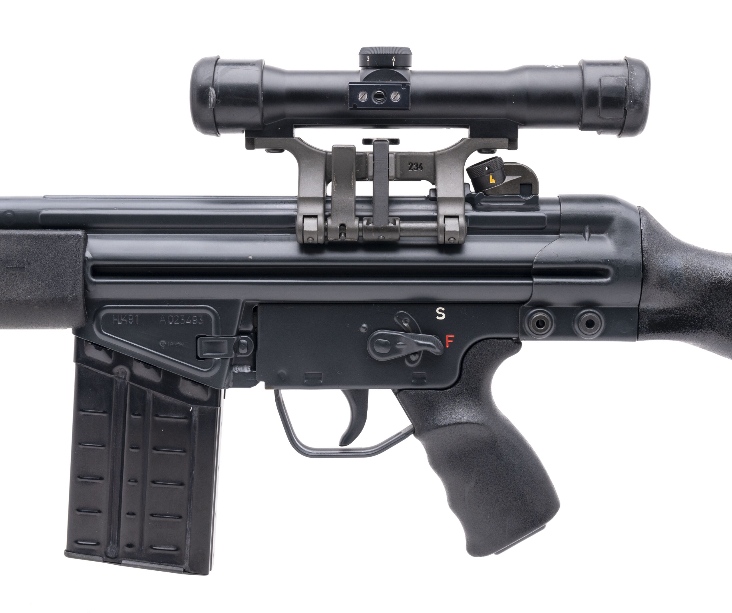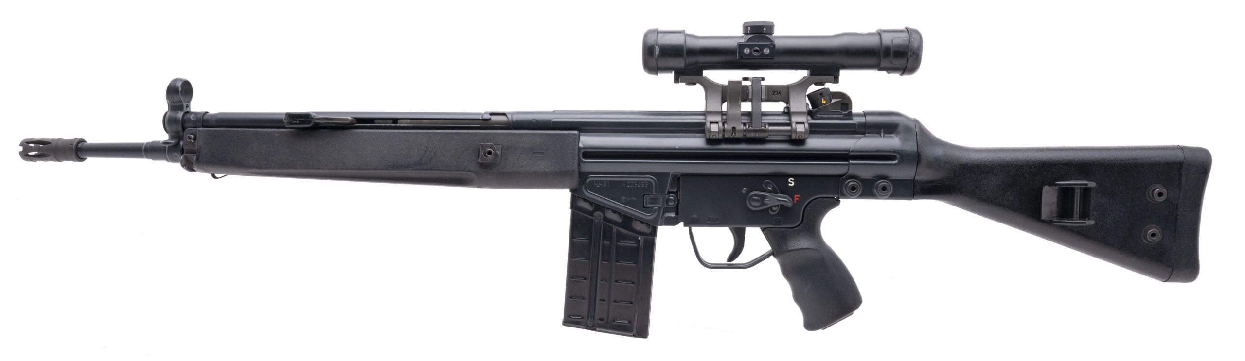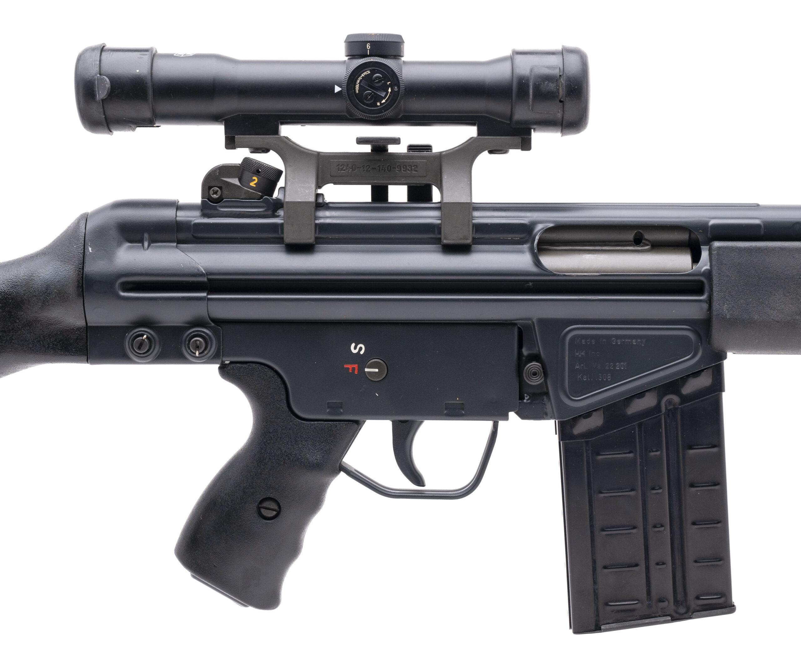 SN: A023493. Made in 1981. .308 with a 18.5" barrel. Bore is bright with strong rifling. Desirable German made roller-delayed blowback rifle. Finish and furniture are in excellent condition. Comes with a Flambeau case, sling, Schubrichtung scope & mount, and scope case. Overall excellent condition.