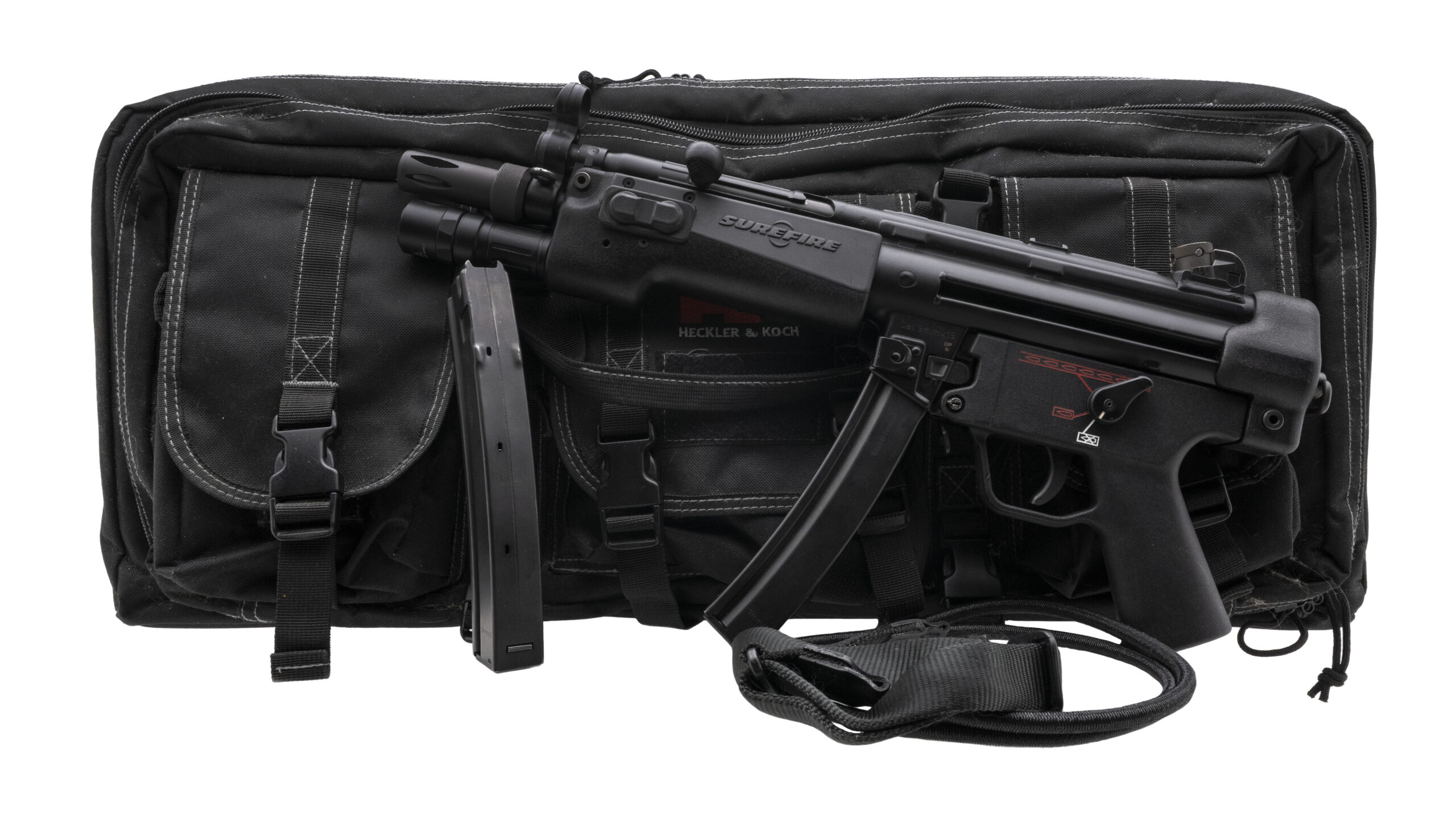 SN: 271-012438. Modern production, 9mm with a 8.9" threaded barrel. German made tactical pistol with a Franklin Armory HK MP5 lower w/ binary trigger group & 3 position ambidextrous controls and a SureFire 628LMF-B forend flashlight. Overall condition is very good. Comes with HK carry bag, sling, and an extra magazine.