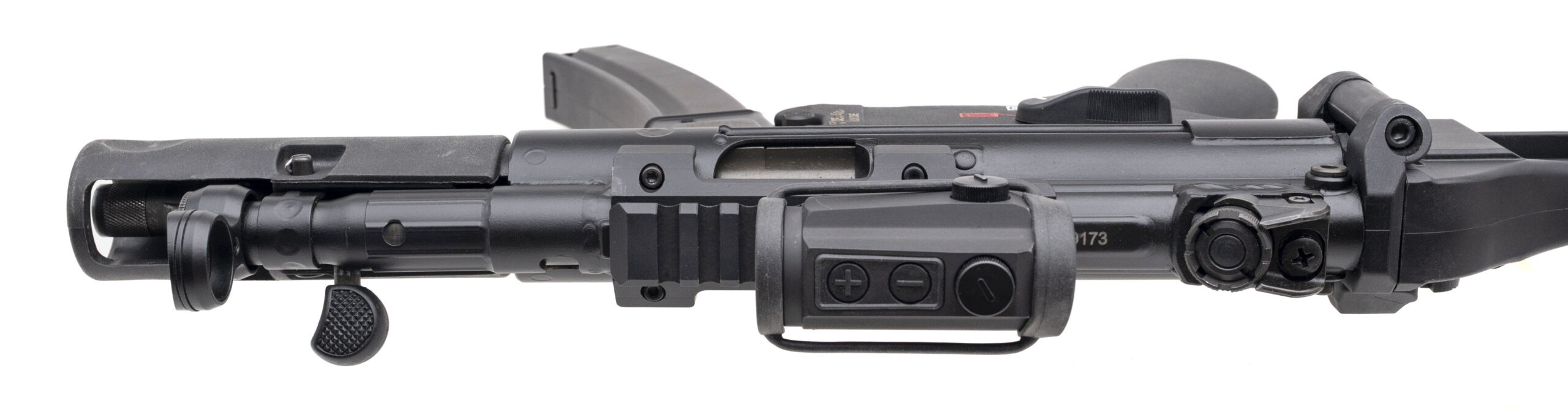 SN: 273-009173. Modern production, 9mm with an 5.83" tri-lug barrel. German made roller-delayed tactical pistol with a Holosun 403B red dot optic on a Midwest Industries mount, and a side-folding SB Tactical brace. Excellent condition. Comes with H&K carry bag, Maglula speedloader, two-point padded bungie sling, and 3 extra magazines.