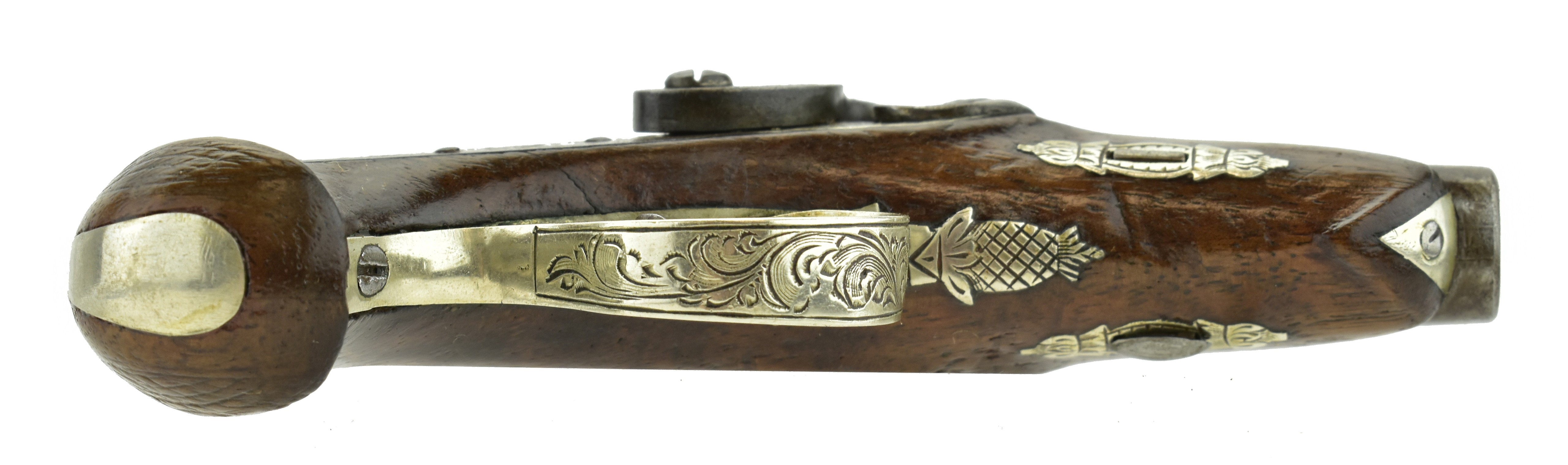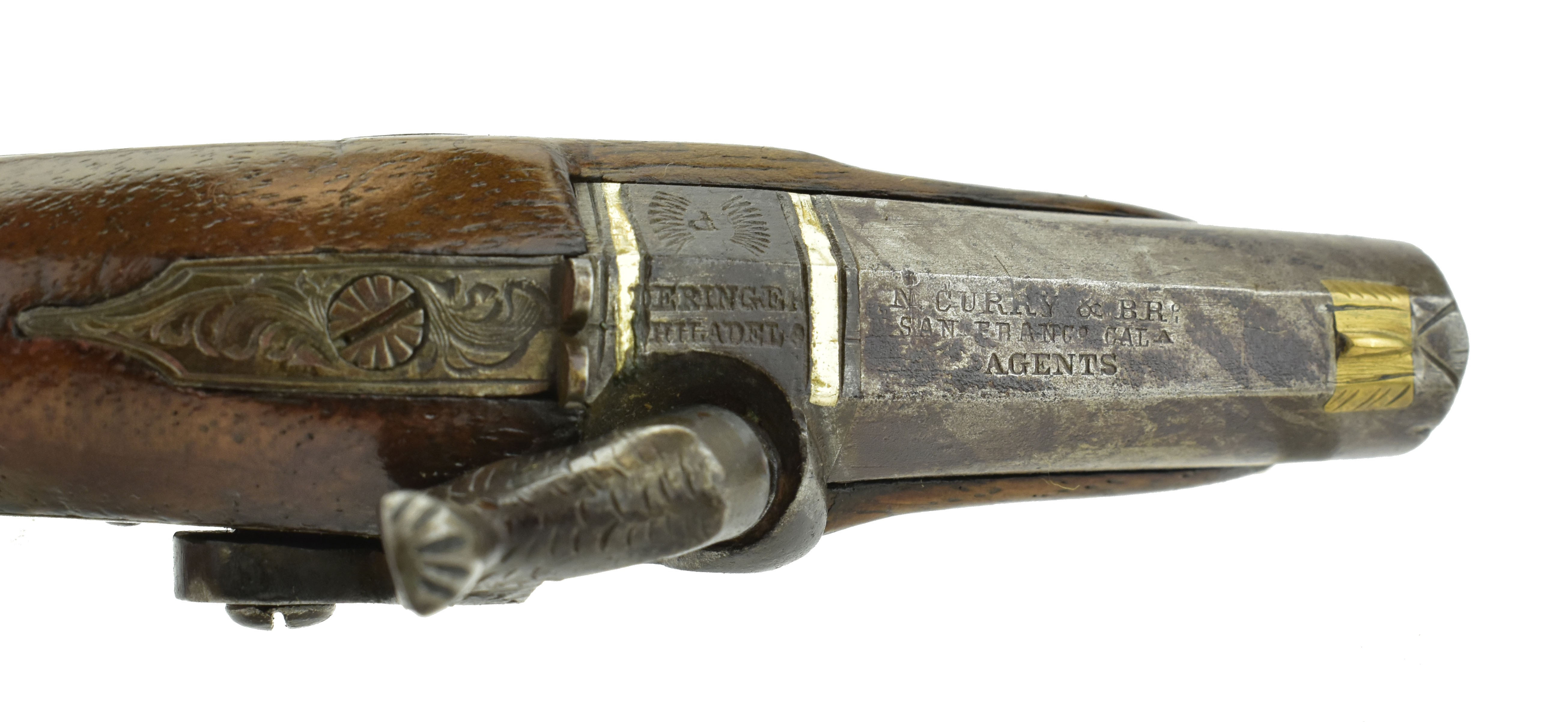 Henry Deringer N. Curry Marked Pistol. .41 caliber with a 1 5/8” barrel. 5” overall length. Unique in its small size. Very nicely engraved. Top of the barrel is marked “N. Curry & BR/SAN FRANCo CALa/AGENTS”. Barrel still has good finish and original striping. Breech plug has two silver bands.
