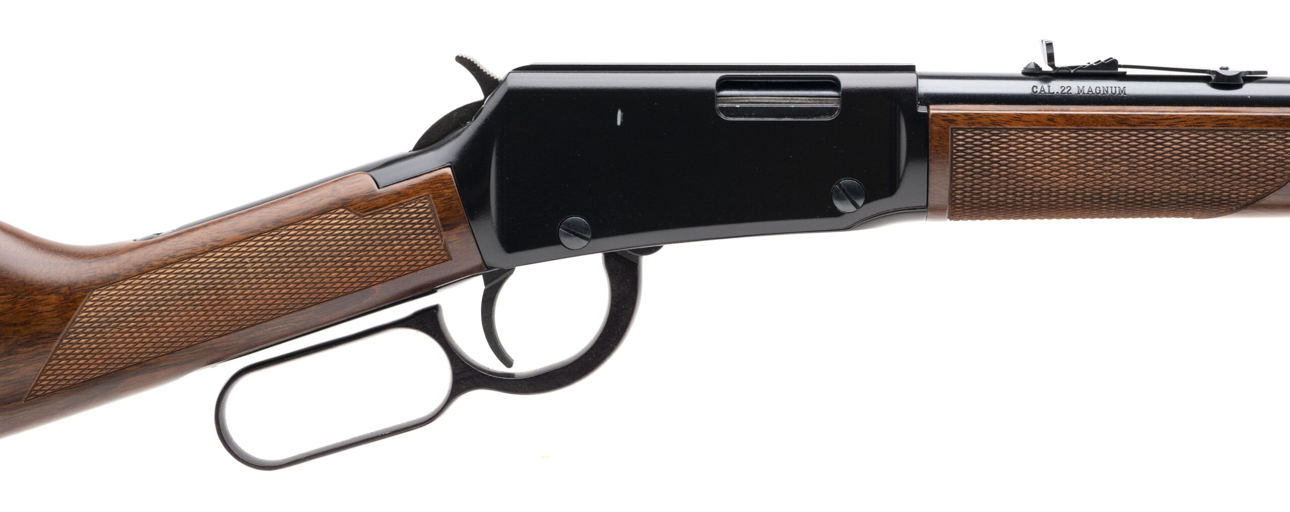 SN: M012555H. Modern production, .22 WMR with a 19.25" barrel. Bore is very good. Lever-action rimfire rifle with a hooded front sight, adjustable semi-buckhorn rear sight, blued finish, and checkered wood stock & forend. Finish shows minor marks throughout, most notably to the receiver. Includes bandolier sling, and original box. Overall condition is very good.