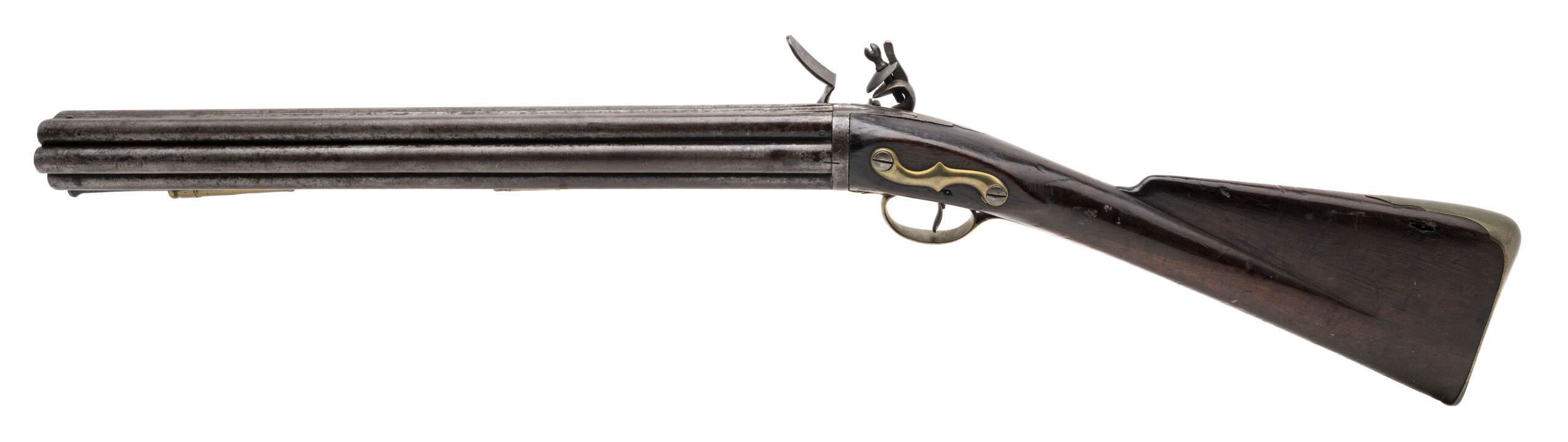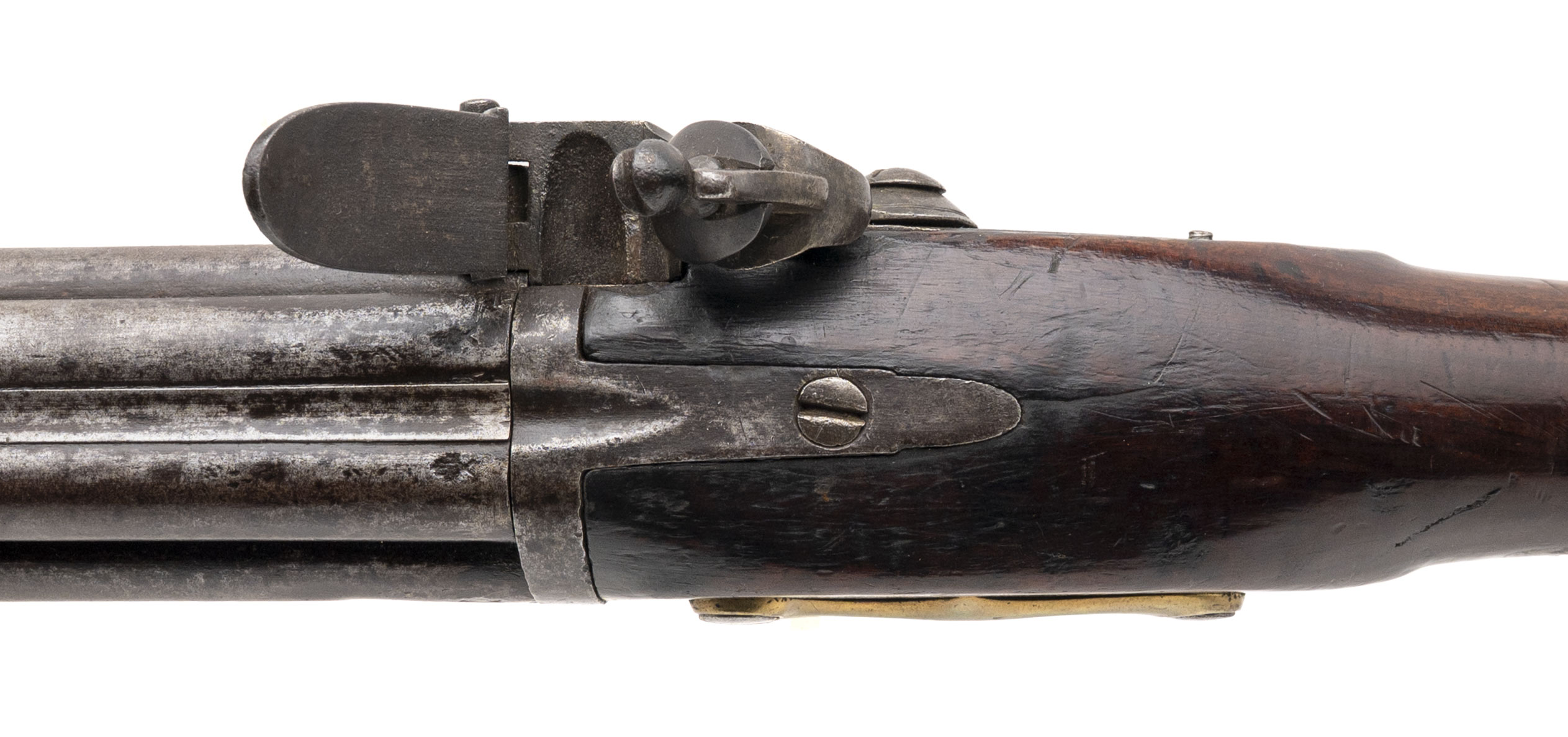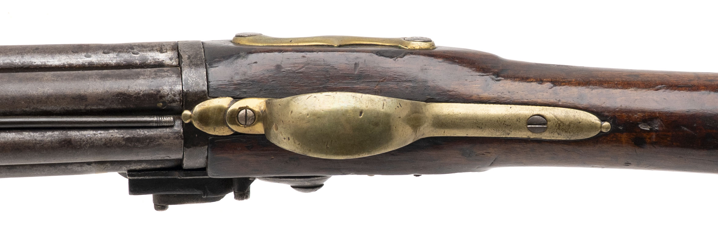Made circa 1782. 50 caliber bores with 20” barrels. The Nock Volley guns had 7 barrels. This gun is the 1st type. Identified by the inverted frizzen spring. This gun is in very good condition with a light gray to brown patina on the barrels. The wood is very good with normal handling wear. Approximately 500 were made for the British navy in 1782 and additional 100 (2nd Models) were made in 1787. These guns were great in theory, but did not perform well. The challenge of loading seven barrels to reload, the inconsistency of firing all the barrels and the devastating recoil of all seven barrels going off at once were the big detractors. The Nock volley gun came to fame in the movie the Alamo starring John Wayne. Jim Bowie’s character was armed with a Nock Volley gun.