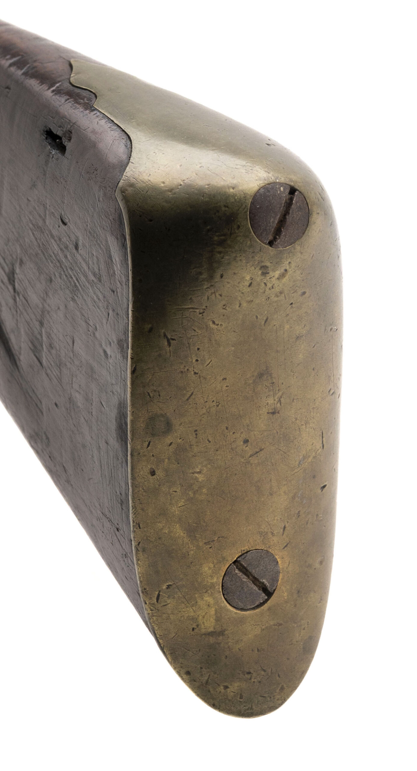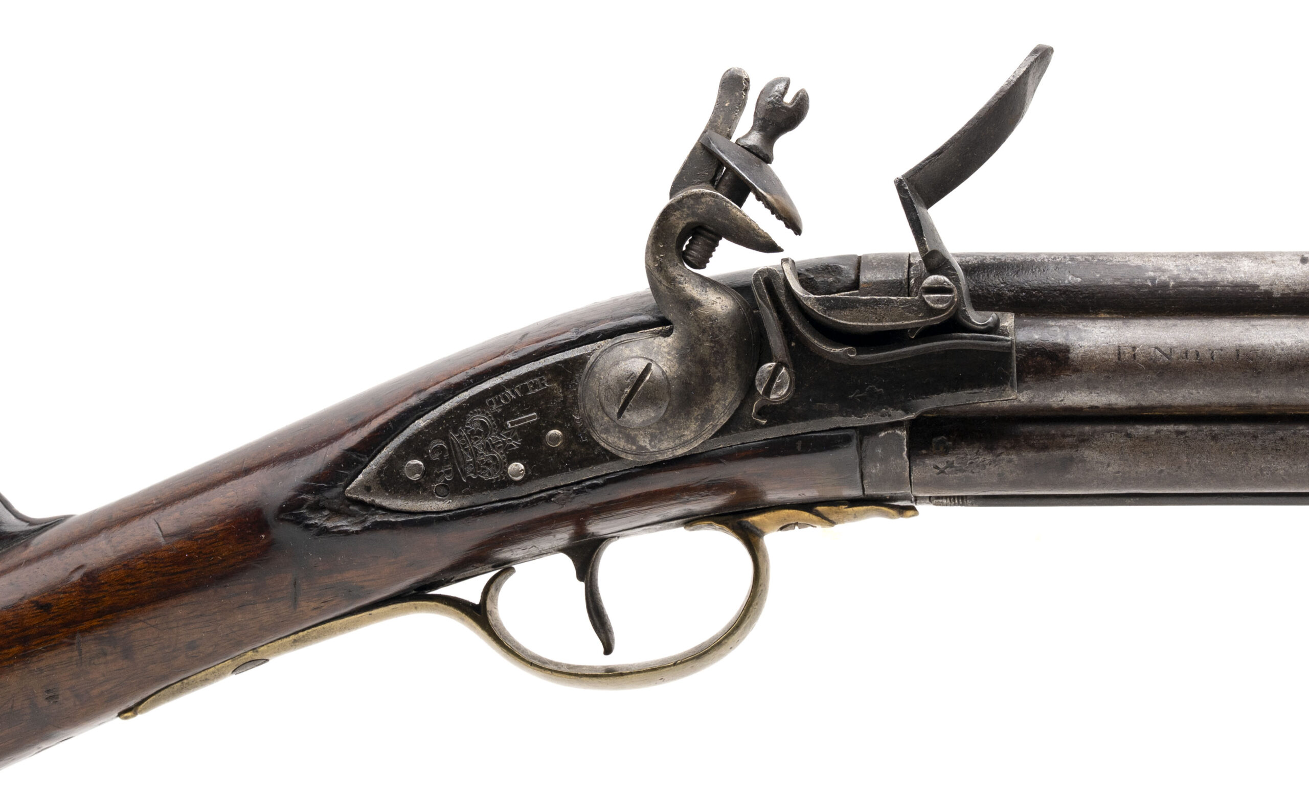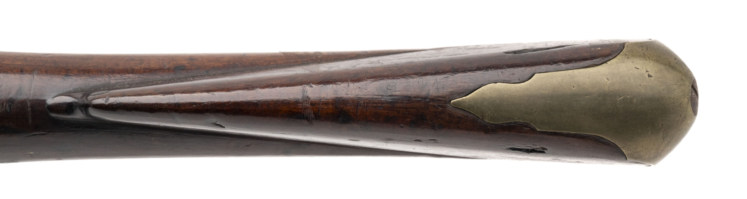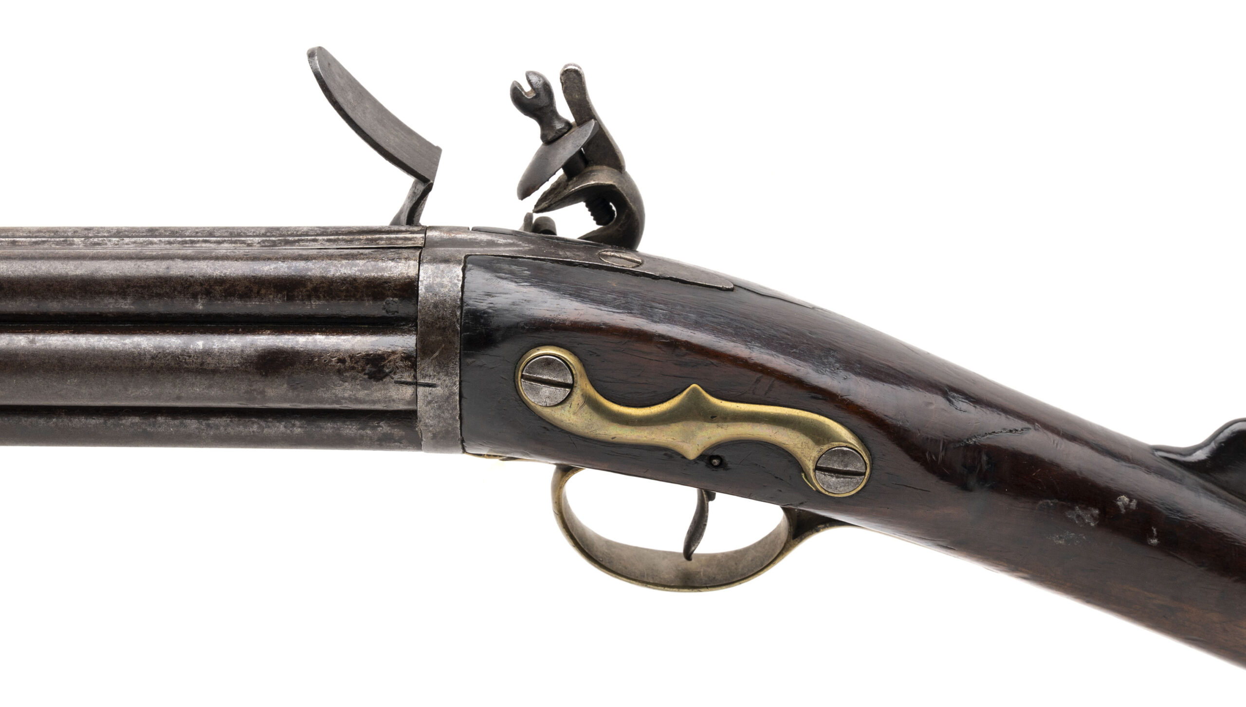Made circa 1782. 50 caliber bores with 20” barrels. The Nock Volley guns had 7 barrels. This gun is the 1st type. Identified by the inverted frizzen spring. This gun is in very good condition with a light gray to brown patina on the barrels. The wood is very good with normal handling wear. Approximately 500 were made for the British navy in 1782 and additional 100 (2nd Models) were made in 1787. These guns were great in theory, but did not perform well. The challenge of loading seven barrels to reload, the inconsistency of firing all the barrels and the devastating recoil of all seven barrels going off at once were the big detractors. The Nock volley gun came to fame in the movie the Alamo starring John Wayne. Jim Bowie’s character was armed with a Nock Volley gun.